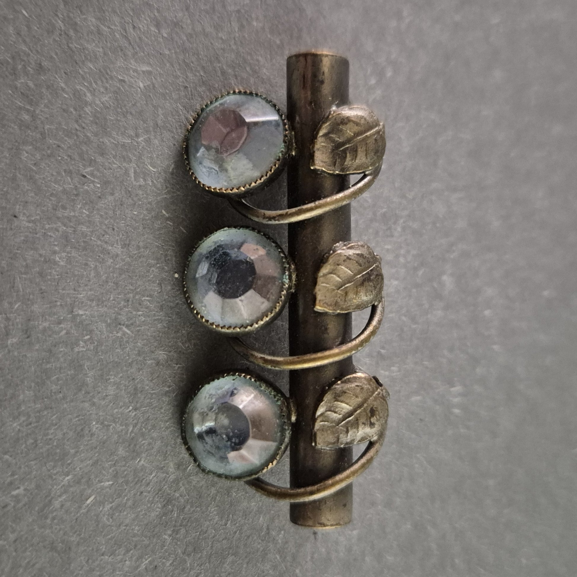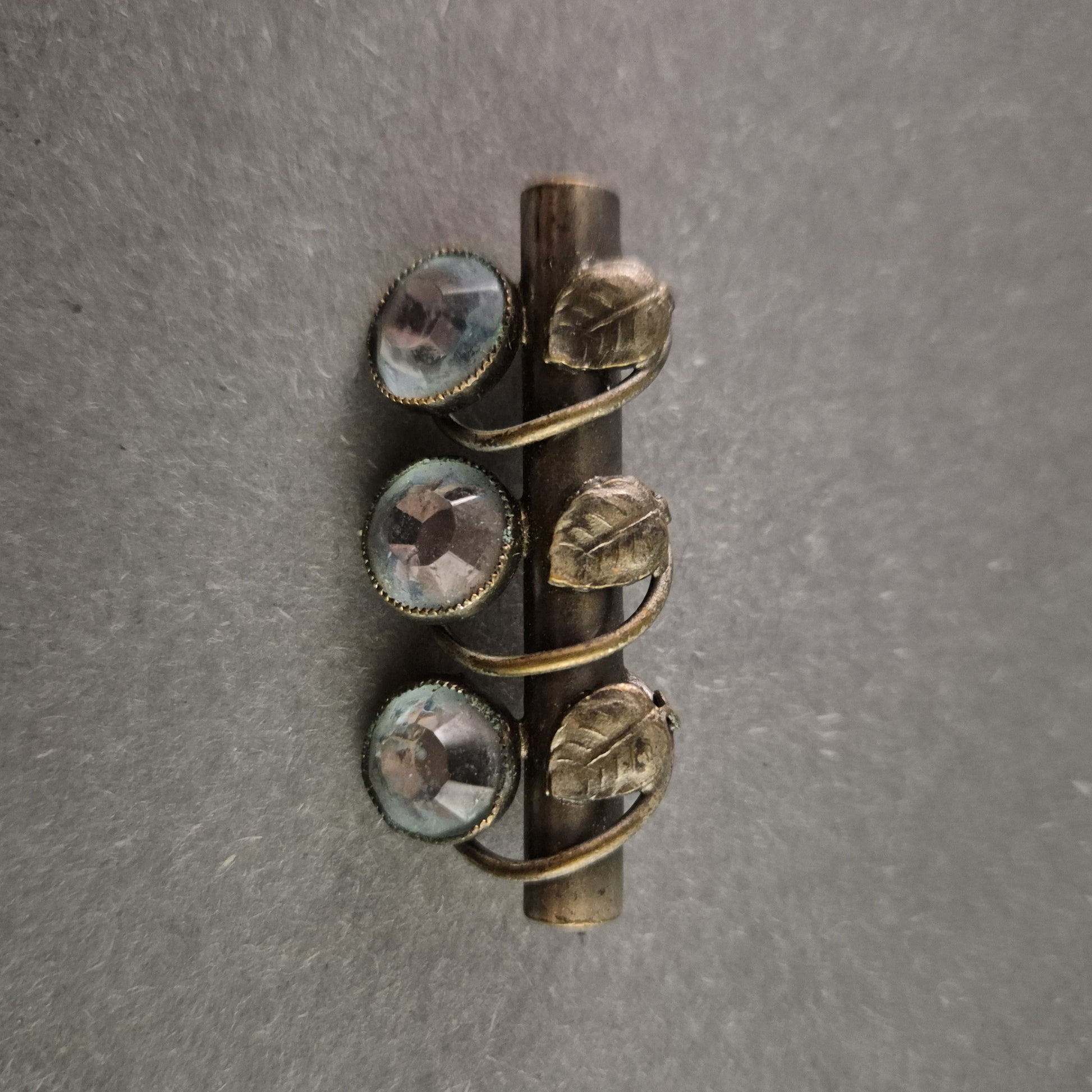 Diese kunstvolle antike Silberbrosche beeindruckt mit ihrem filigranen Jugendstil-Design. Drei facettierte blaue Glaskristalle schmücken das zylinderförmige Element, das von filigranen Silberdrähten mit kleinen Blättern umschlungen wird. Die natürliche Patina unterstreicht den Vintage-Charme dieses besonderen Schmuckstücks. Perfekt für Sammler oder als stilvolles Accessoire für nostalgische Looks.