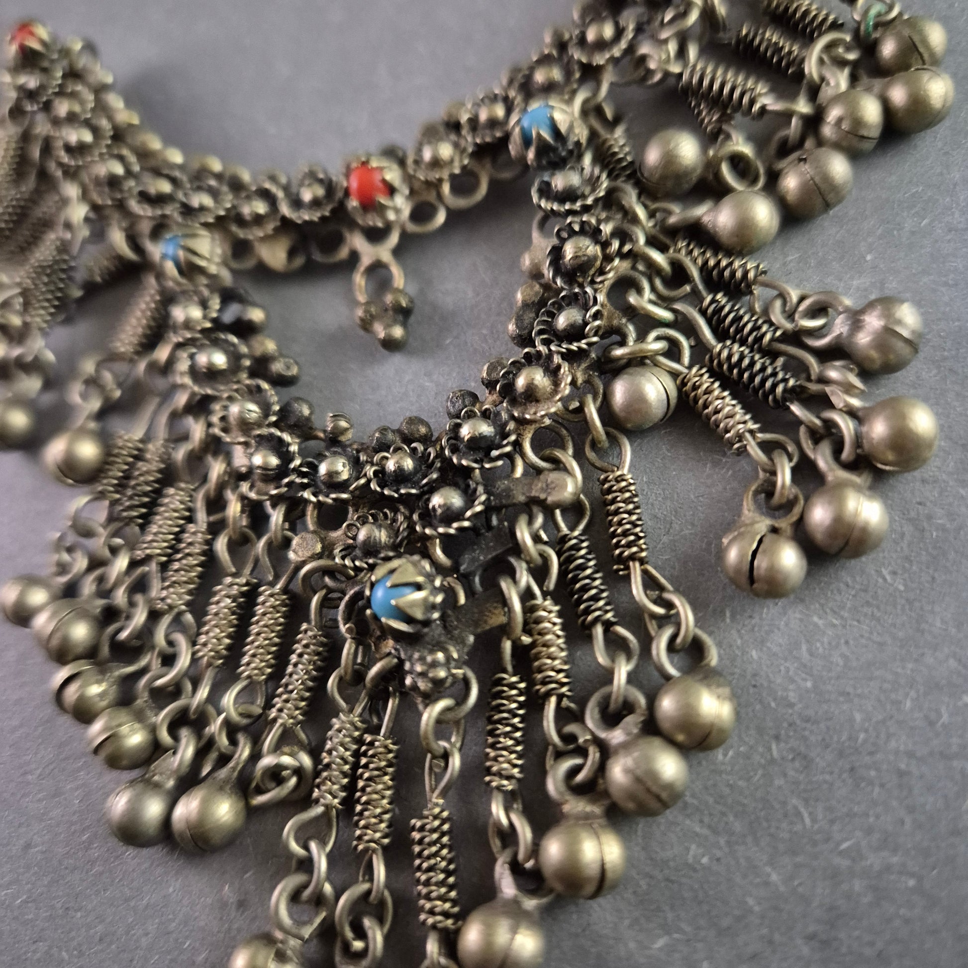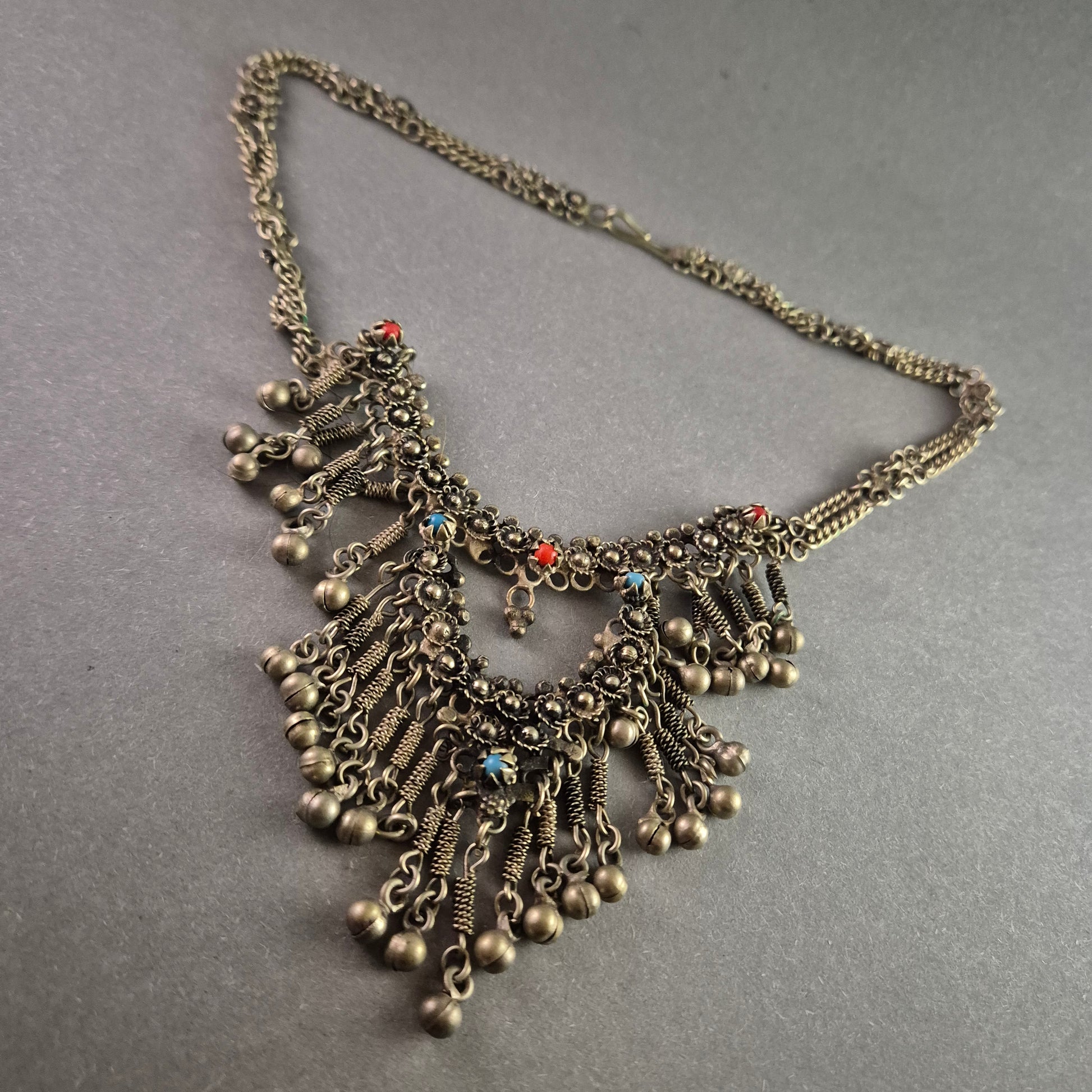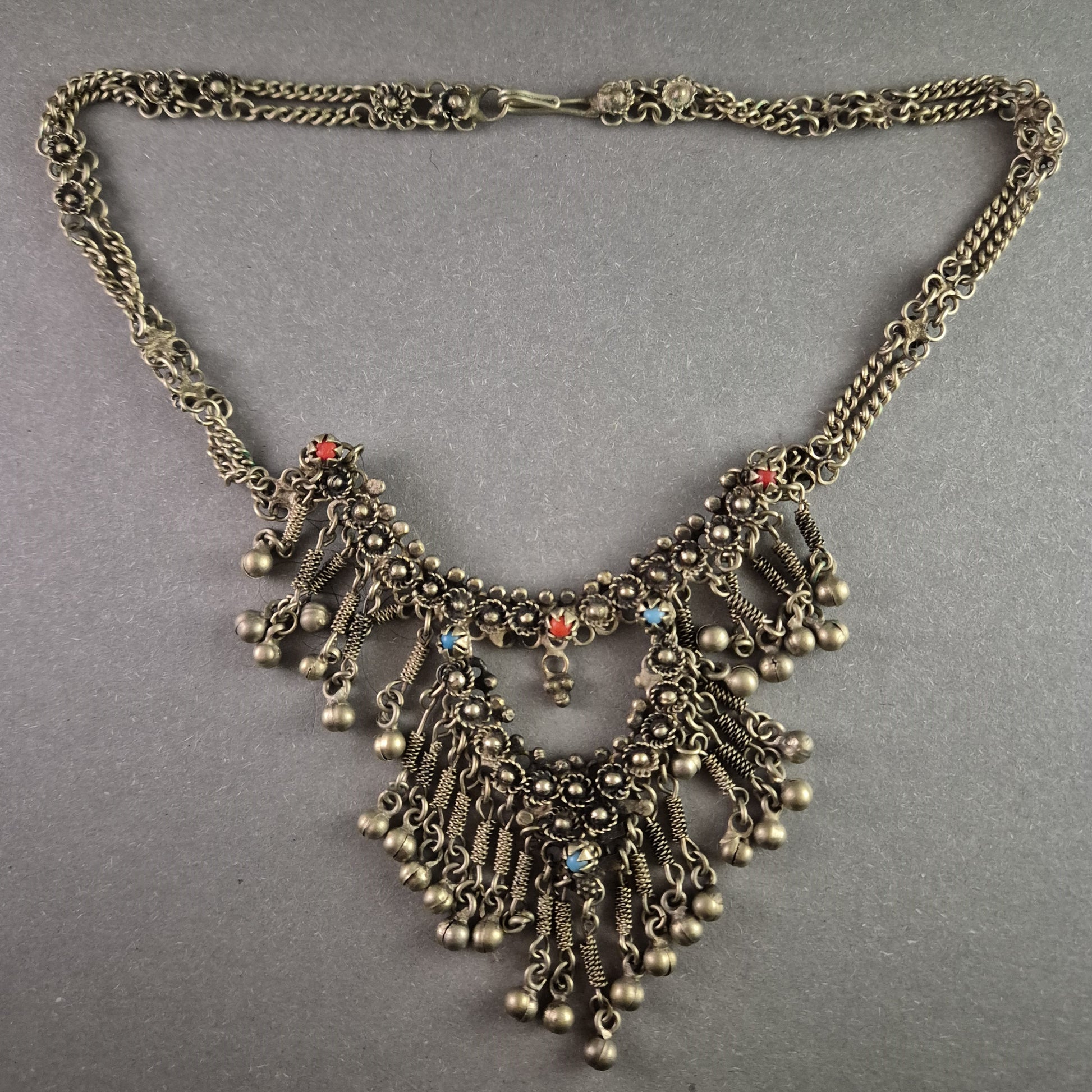 Diese kunstvolle Silberkette beeindruckt mit ihrem detailreichen Design und aufwendiger Ornamentik. Die filigran gearbeiteten Blüten- und Kettenglieder sind mit kleinen Glöckchen verziert, die dem Schmuckstück eine charmante, orientalische Note verleihen. Eingearbeitete rote und blaue Steine setzen farbliche Akzente und betonen den traditionellen Stil. Die antike Patina unterstreicht den einzigartigen Charakter dieser außergewöhnlichen Statement-Kette.