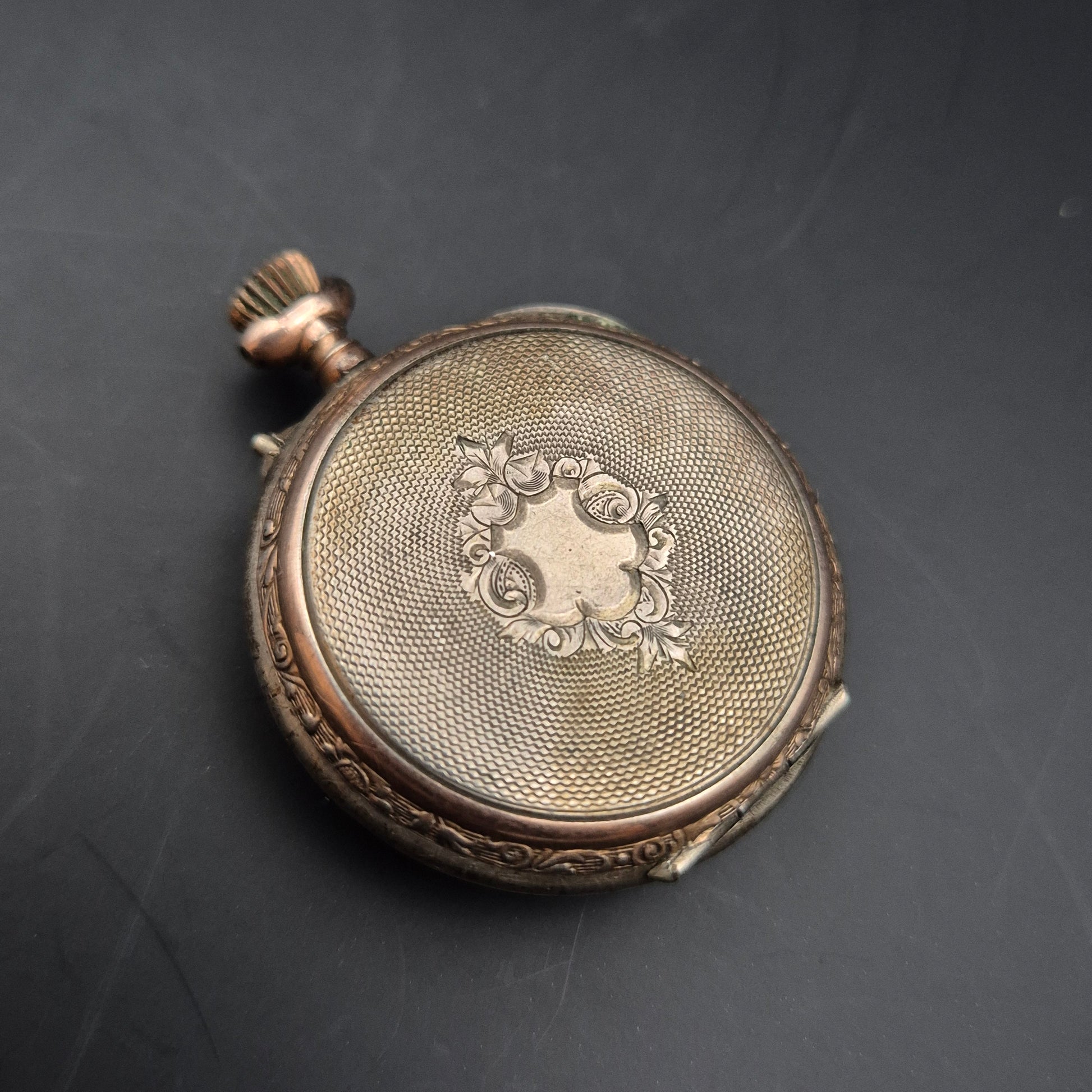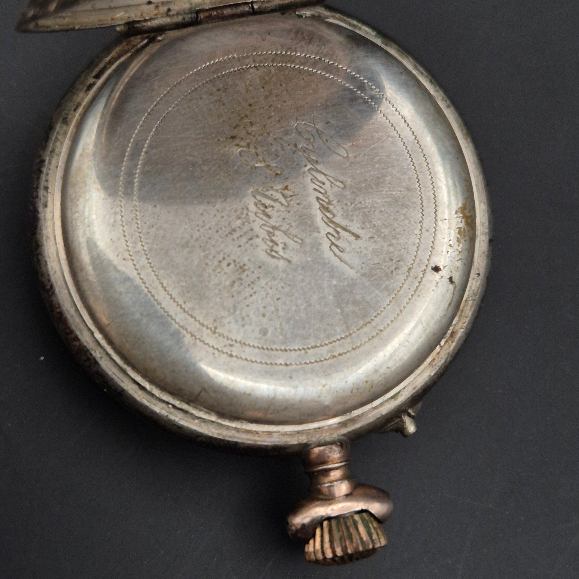 Diese exquisite antike Taschenuhr besticht durch ihr kunstvoll verziertes Gehäuse und ein filigranes Zifferblatt mit römischen Ziffern und floralen Details. Das Gehäuse ist aus 0.800 Silber gefertigt und zeugt von hochwertiger Handwerkskunst vergangener Zeiten. Eine wunderschöne Sammleruhr, die Geschichte und Eleganz in sich vereint.