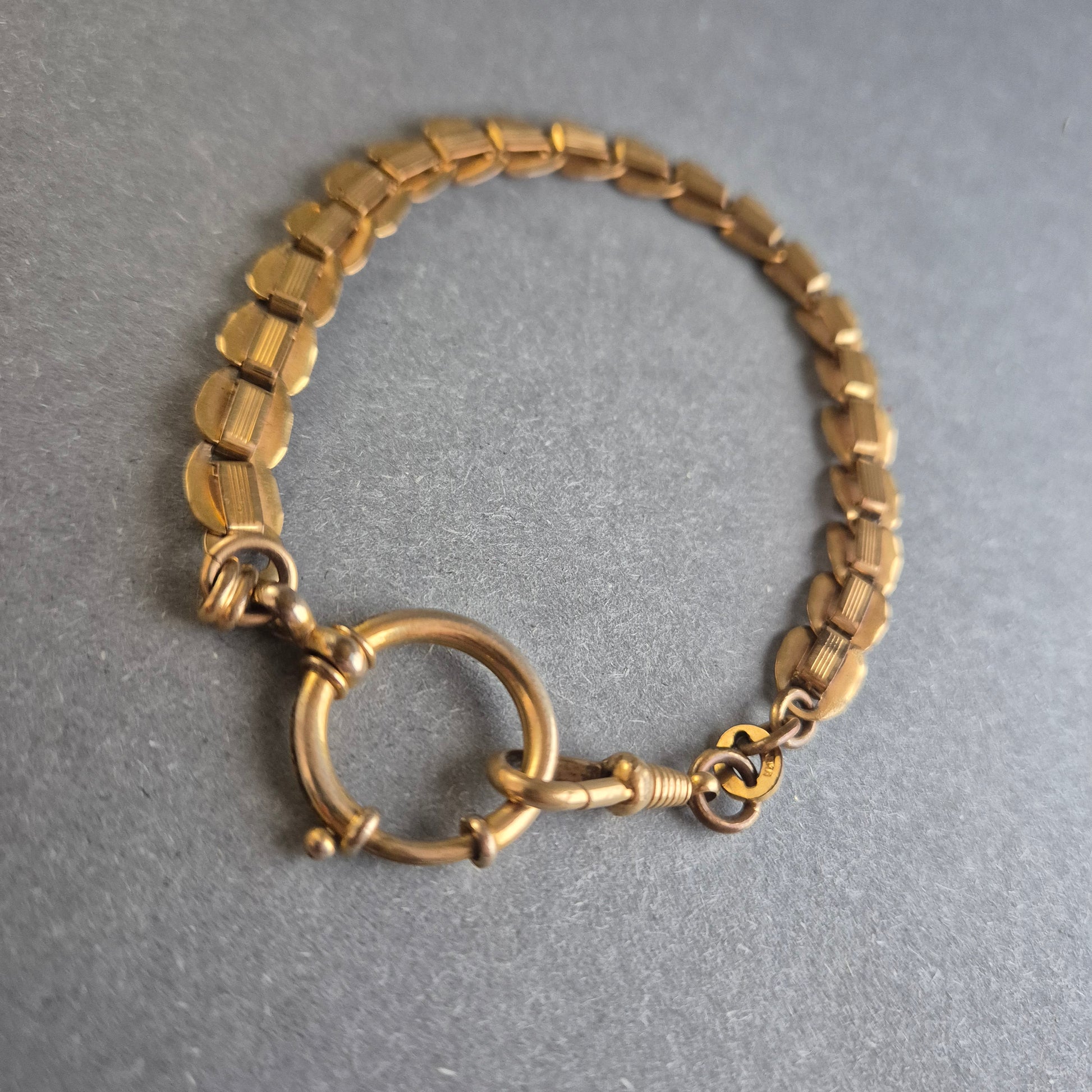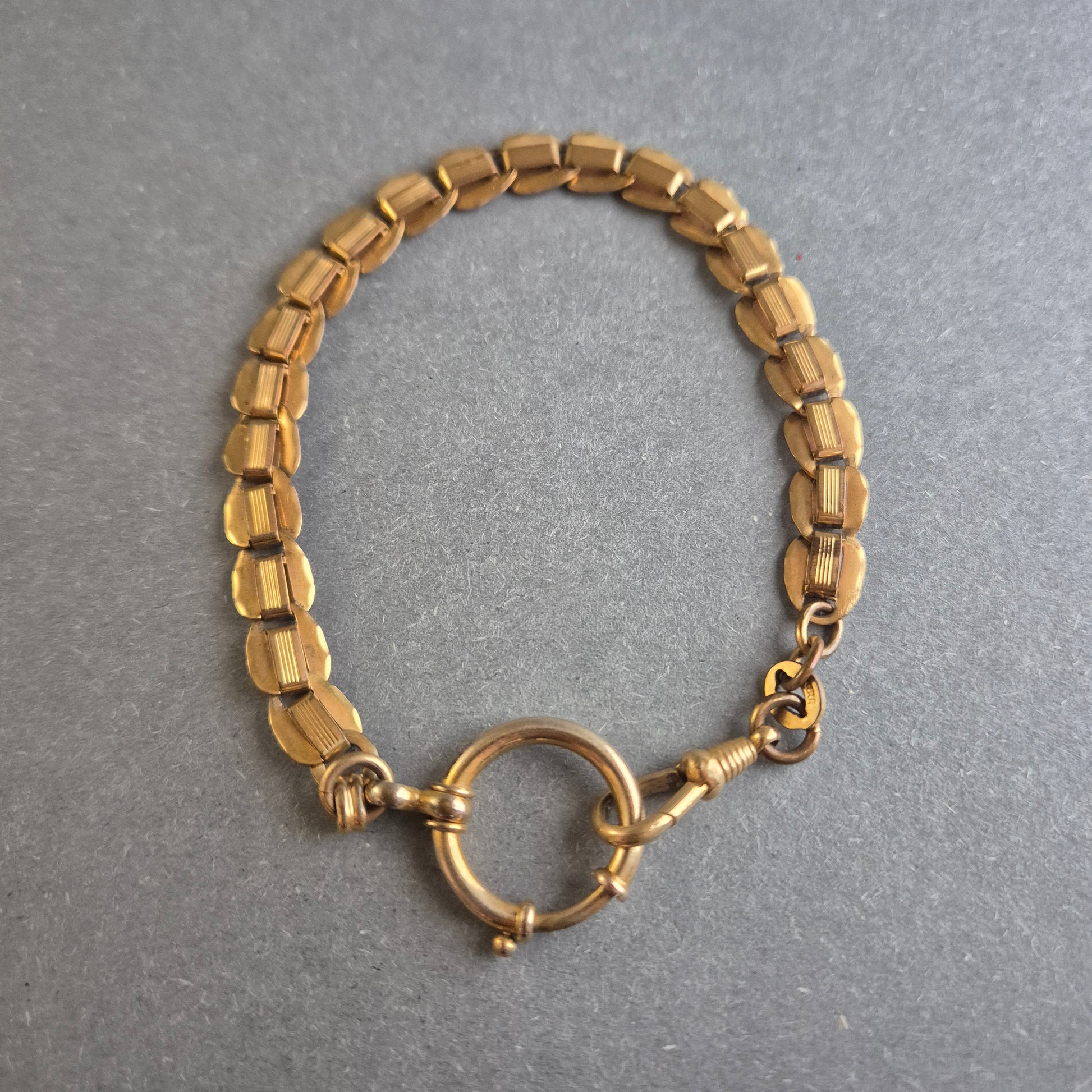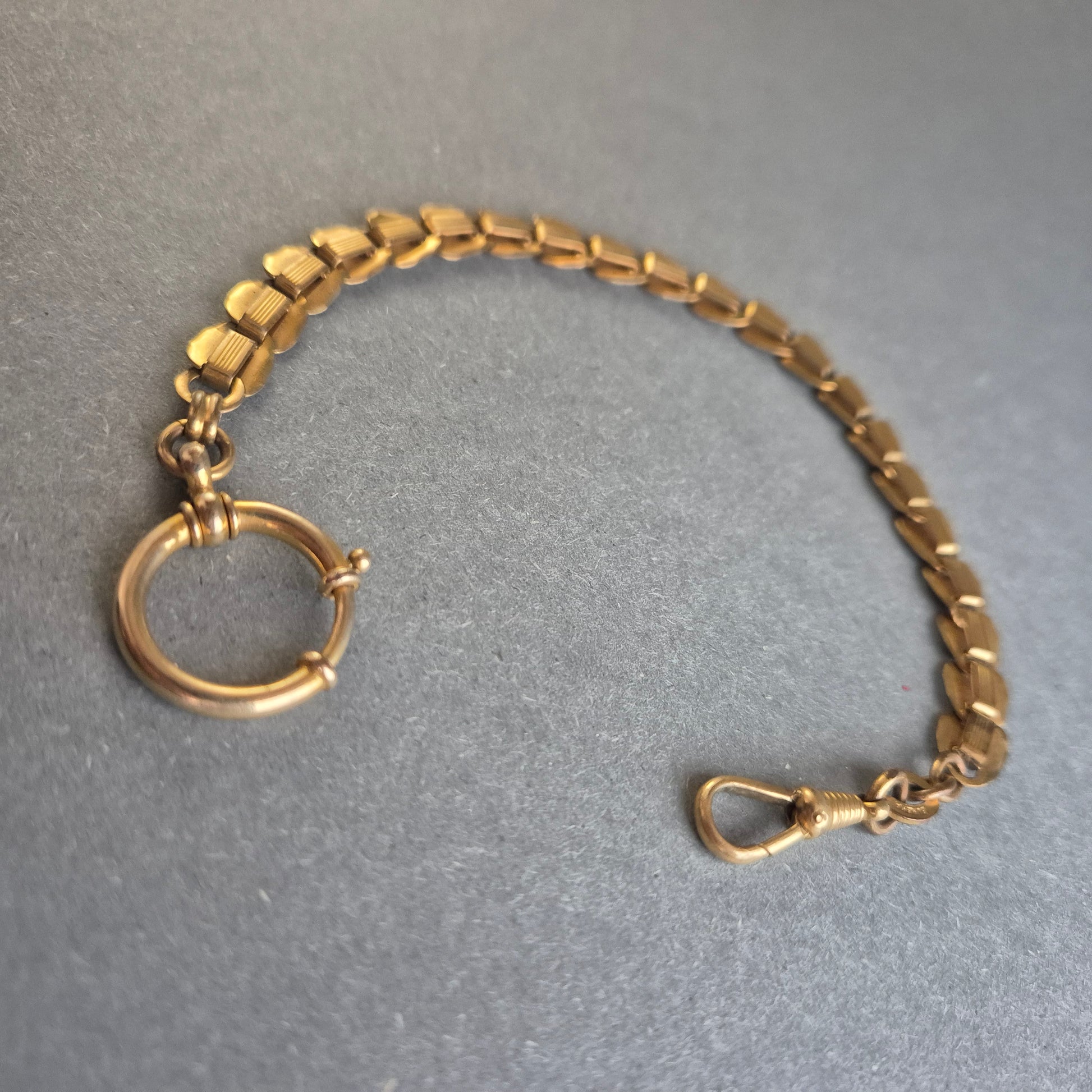Diese elegante antike Taschenuhrenkette zeichnet sich durch ihre massiven, strukturierten Glieder und den klassischen Federringverschluss aus. Das vergoldete Design verleiht ihr einen edlen Vintage-Charme, während die robuste Verarbeitung für Langlebigkeit sorgt. Perfekt als stilvolle Ergänzung zu einer antiken Taschenuhr oder als Armband für Liebhaber von historischen Accessoires.
