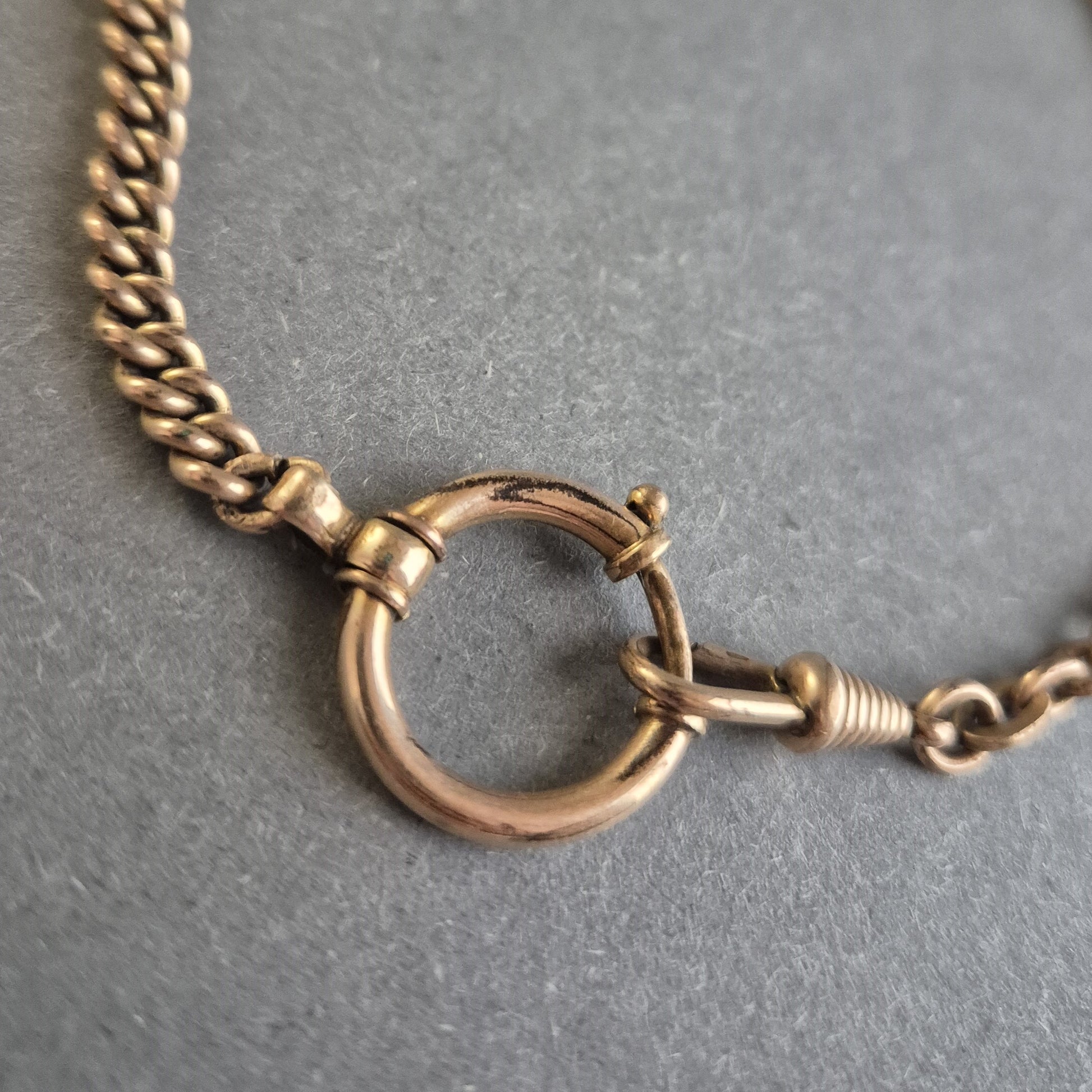 Diese antike Taschenuhrenkette besticht durch ihr schlichtes, aber stilvolles Design mit massiven Gliedern und einem klassischen Federringverschluss. Die warm getönte Metalllegierung verleiht ihr einen edlen Vintage-Charakter. Ursprünglich als Uhrenkette konzipiert, kann sie auch als Armband oder stilvolles Accessoire verwendet werden.