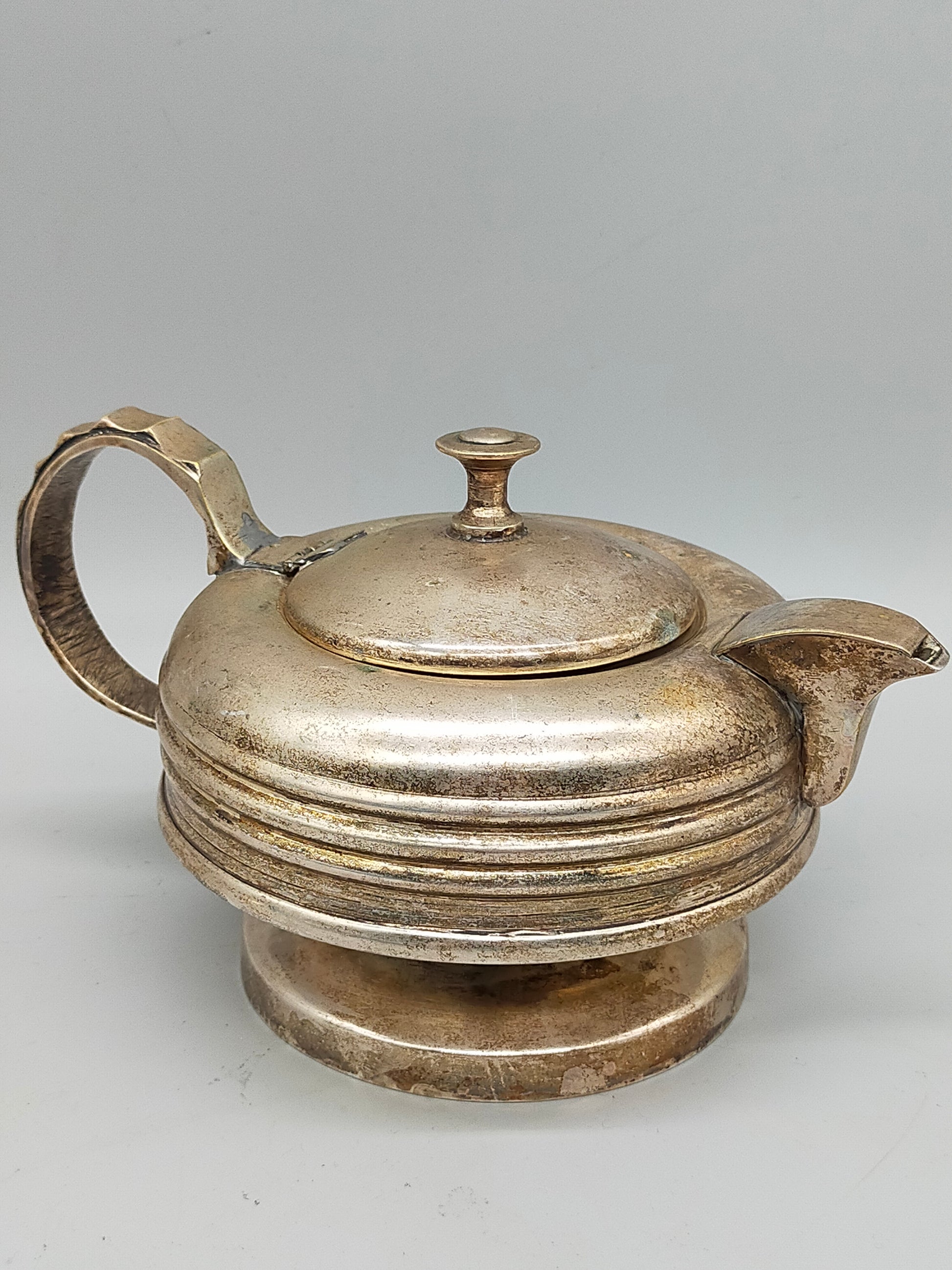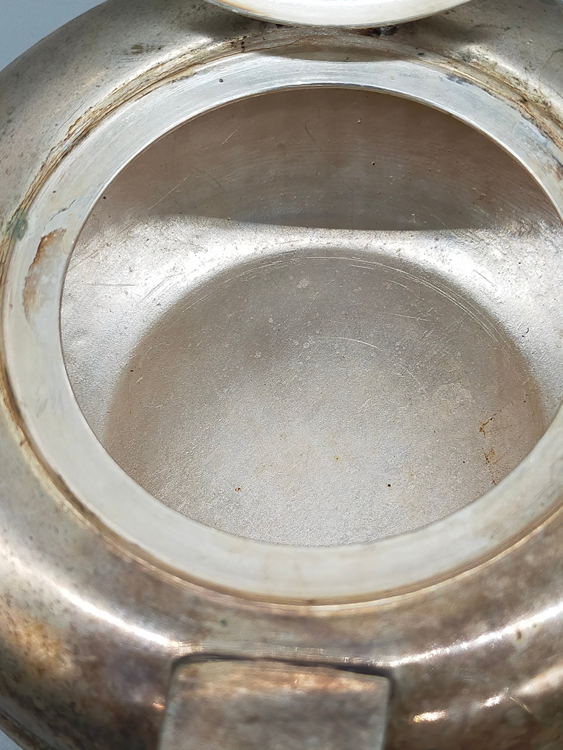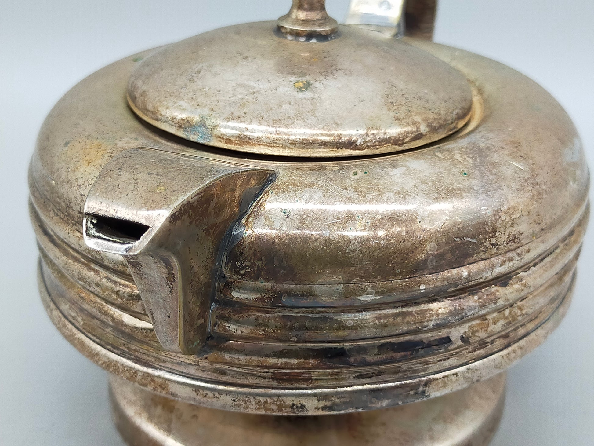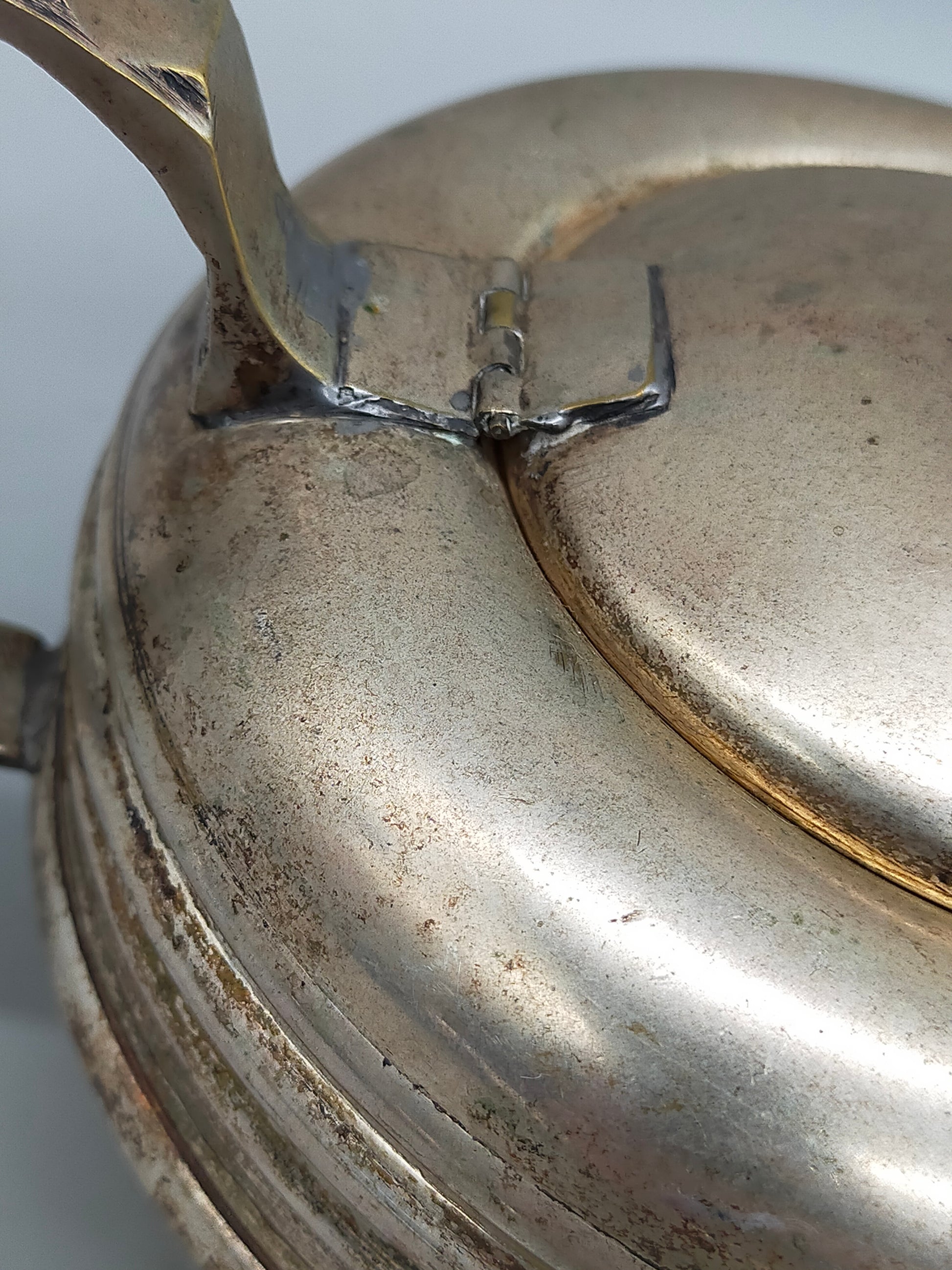 Herzlich willkommen, Diese antike versilberte Teekanne besticht durch ihre klassische, bauchige Form und die feinen Rillenverzierungen am Korpus. Der markante, gestufte Griff und der schlichte Klappdeckel verleihen dem Stück eine zeitlose Ästhetik. Mit ihrer authentischen Patina ist sie ein ideales Objekt für Sammler oder als dekoratives Element in einer stilvollen Einrichtung.