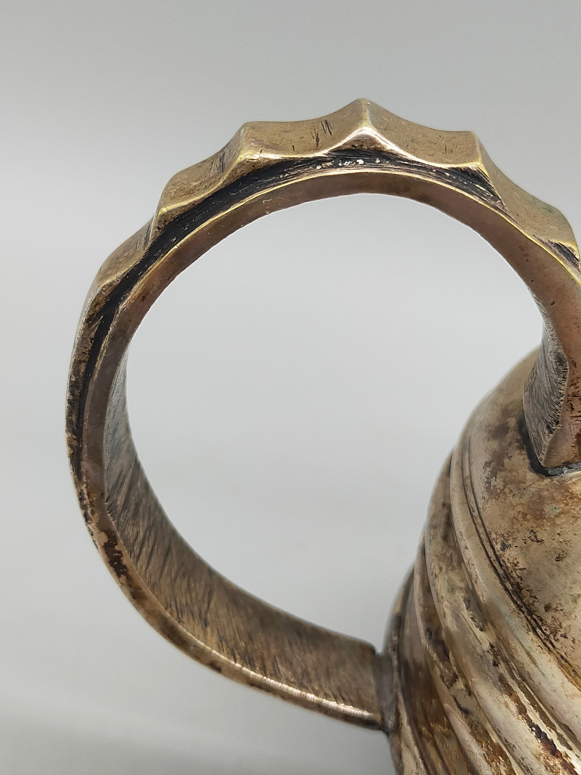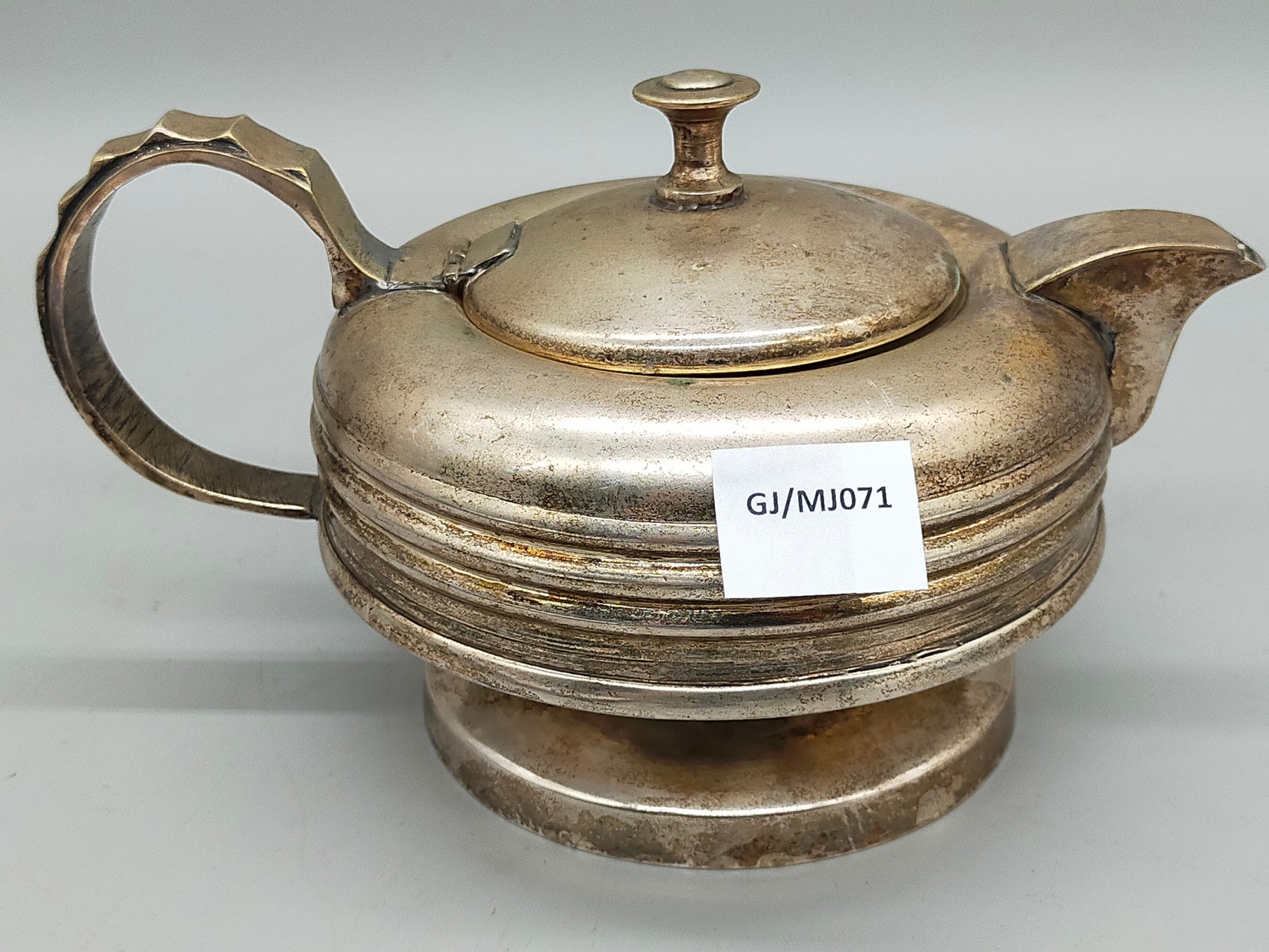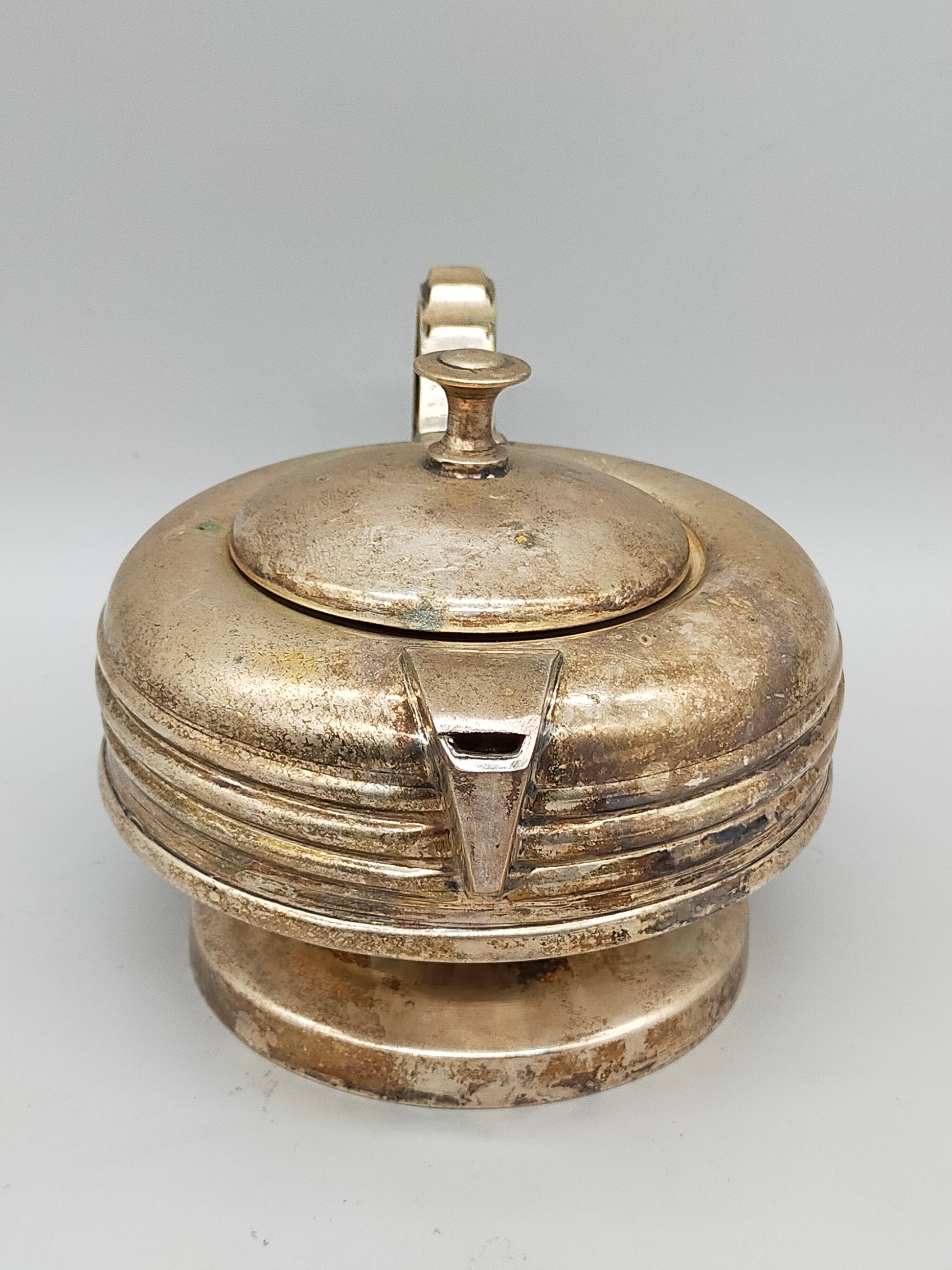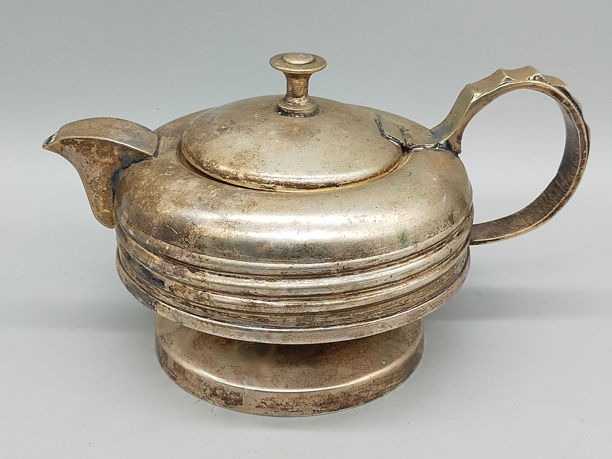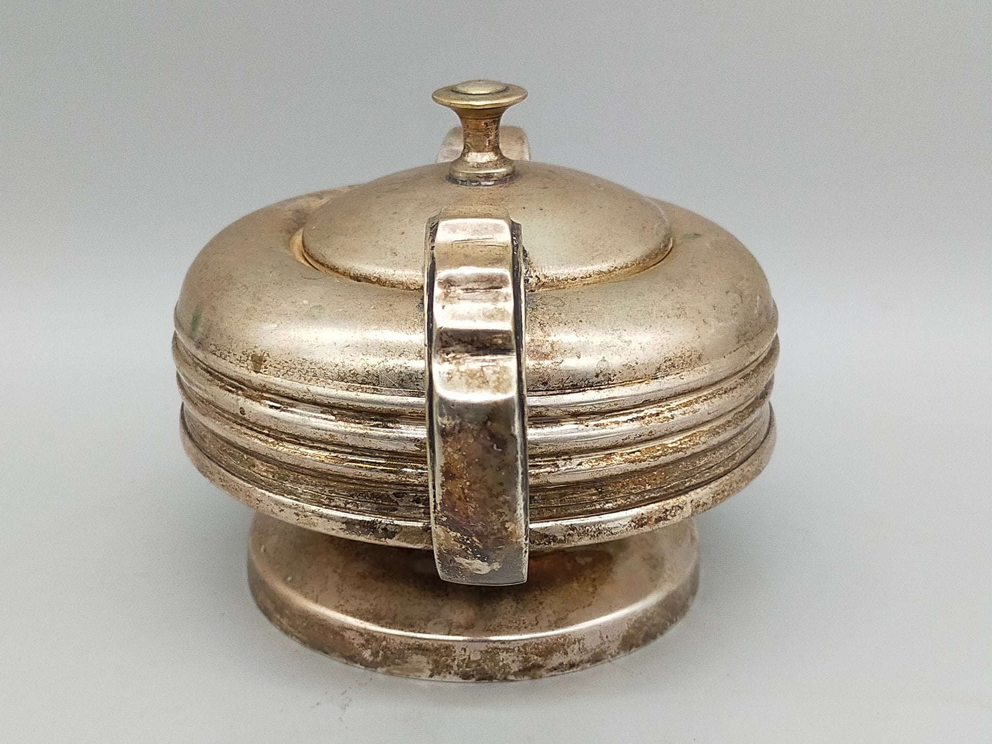 Herzlich willkommen, Diese antike versilberte Teekanne besticht durch ihre klassische, bauchige Form und die feinen Rillenverzierungen am Korpus. Der markante, gestufte Griff und der schlichte Klappdeckel verleihen dem Stück eine zeitlose Ästhetik. Mit ihrer authentischen Patina ist sie ein ideales Objekt für Sammler oder als dekoratives Element in einer stilvollen Einrichtung.