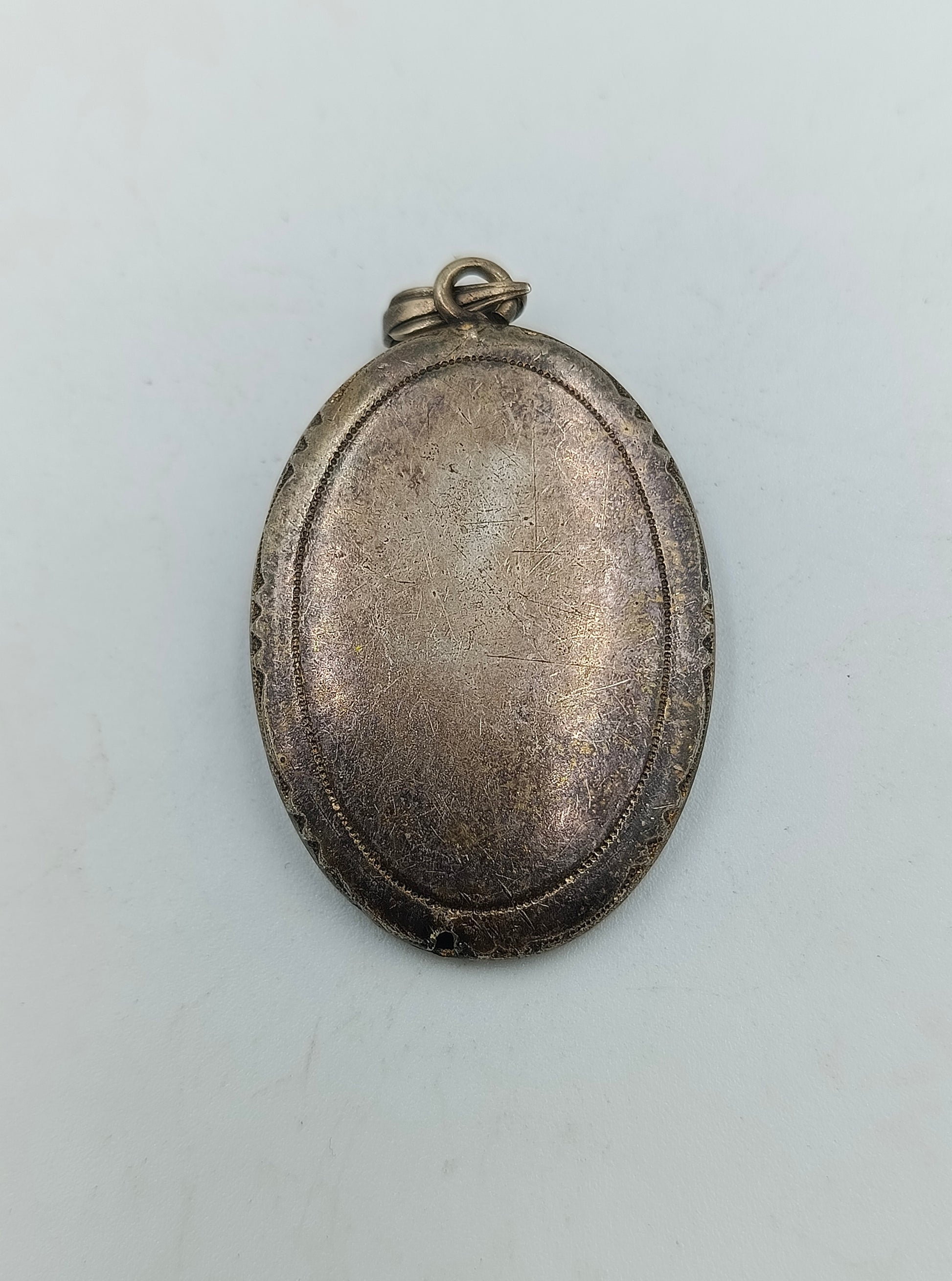 Wunderschöner, antiker Medaillon-Anhänger der Marke Alpacca, gefertigt aus versilbertem Metall mit feiner Gravur und einer zarten handbemalten Blüte auf der Vorderseite. Das ovale Design verleiht dem Anhänger einen klassischen Vintage-Charme. Ideal für nostalgische Schmuckliebhaber oder als Sammlerstück.