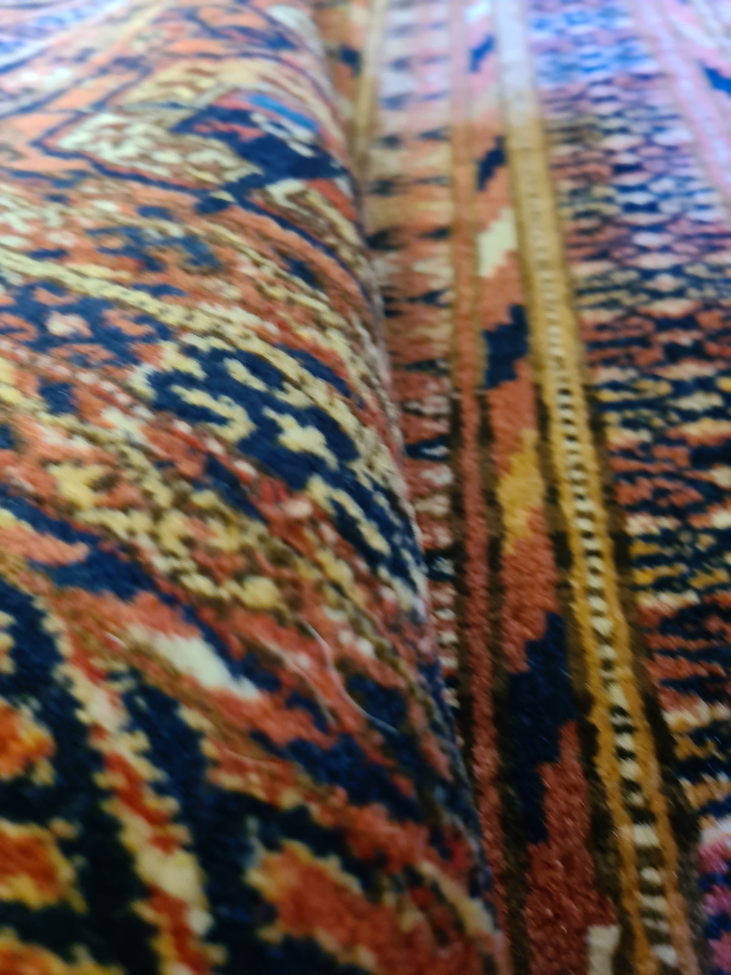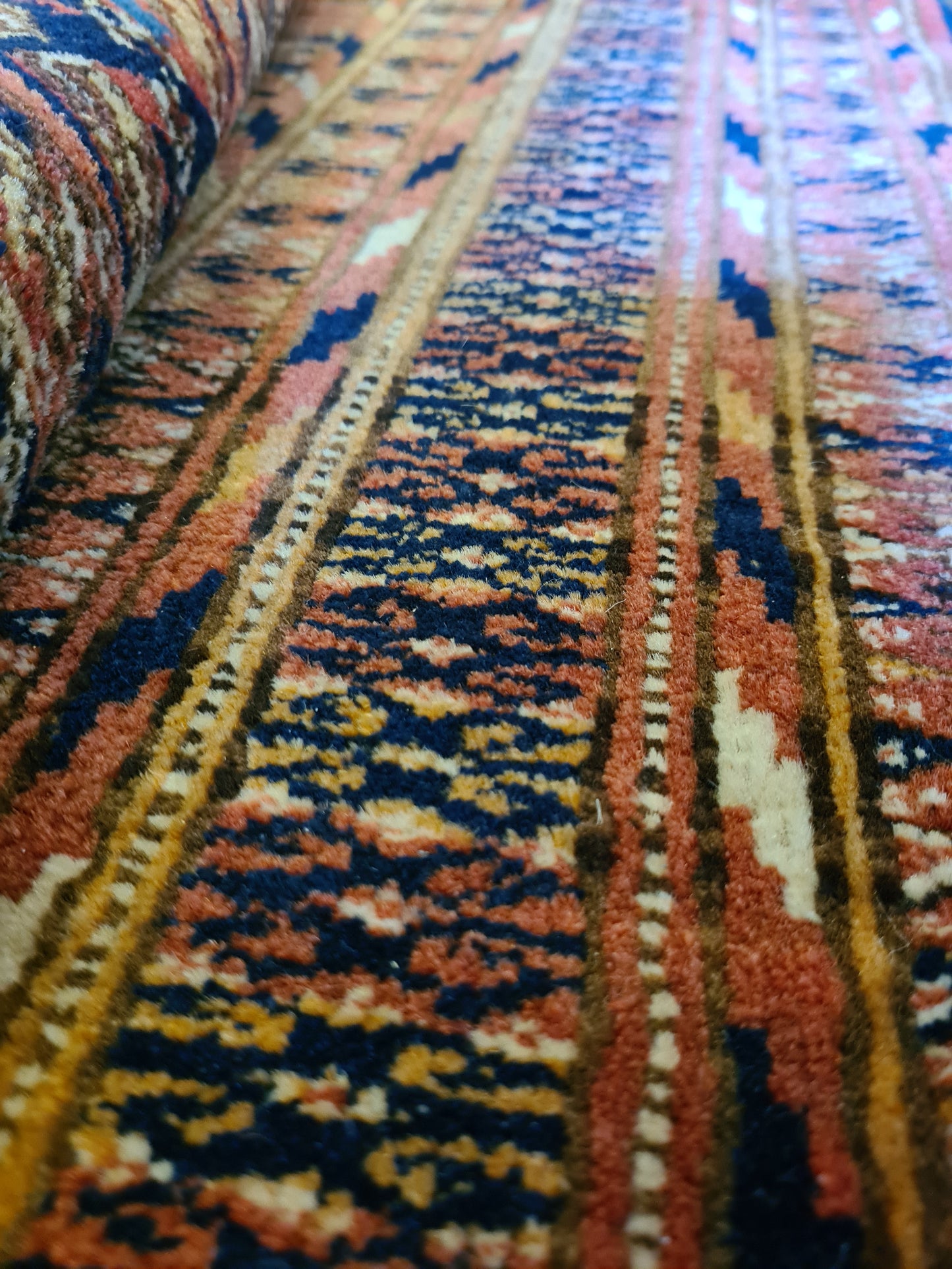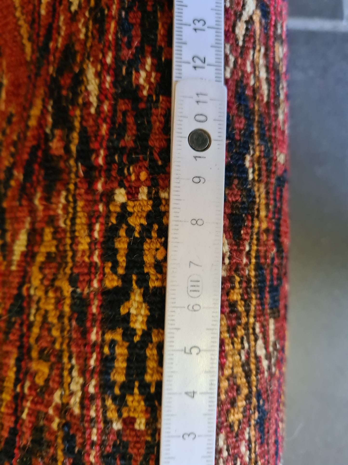 Ideal für Sammler und Liebhaber authentischer Kunsthandwerkskunst, fügt dieser Teppich jedem Interieur einen Hauch von Geschichte und Eleganz hinzu. Seine lebendigen Farben und das klassische Design machen ihn zu einem zeitlosen Schatz, der Generationen überdauert.