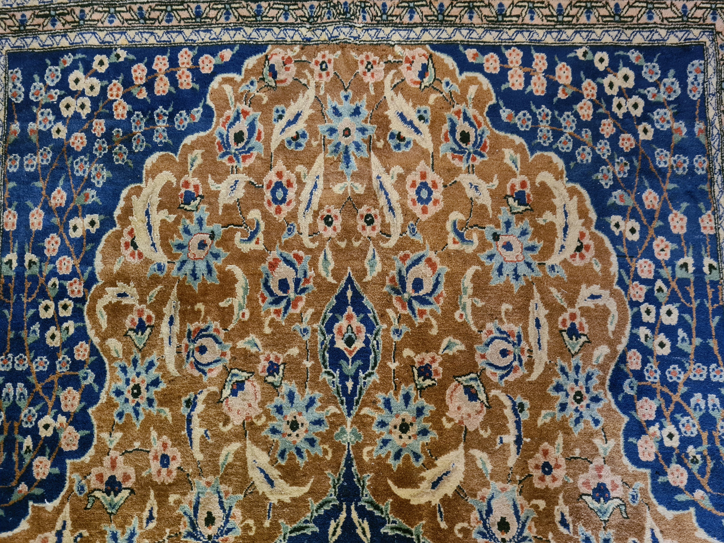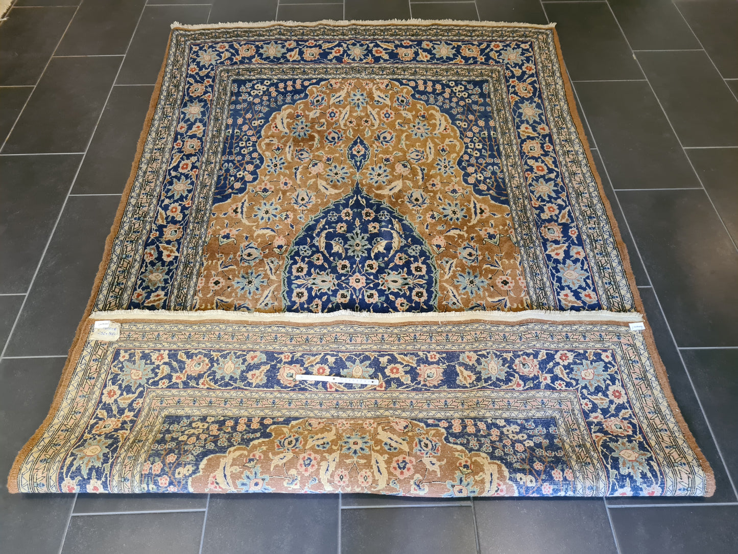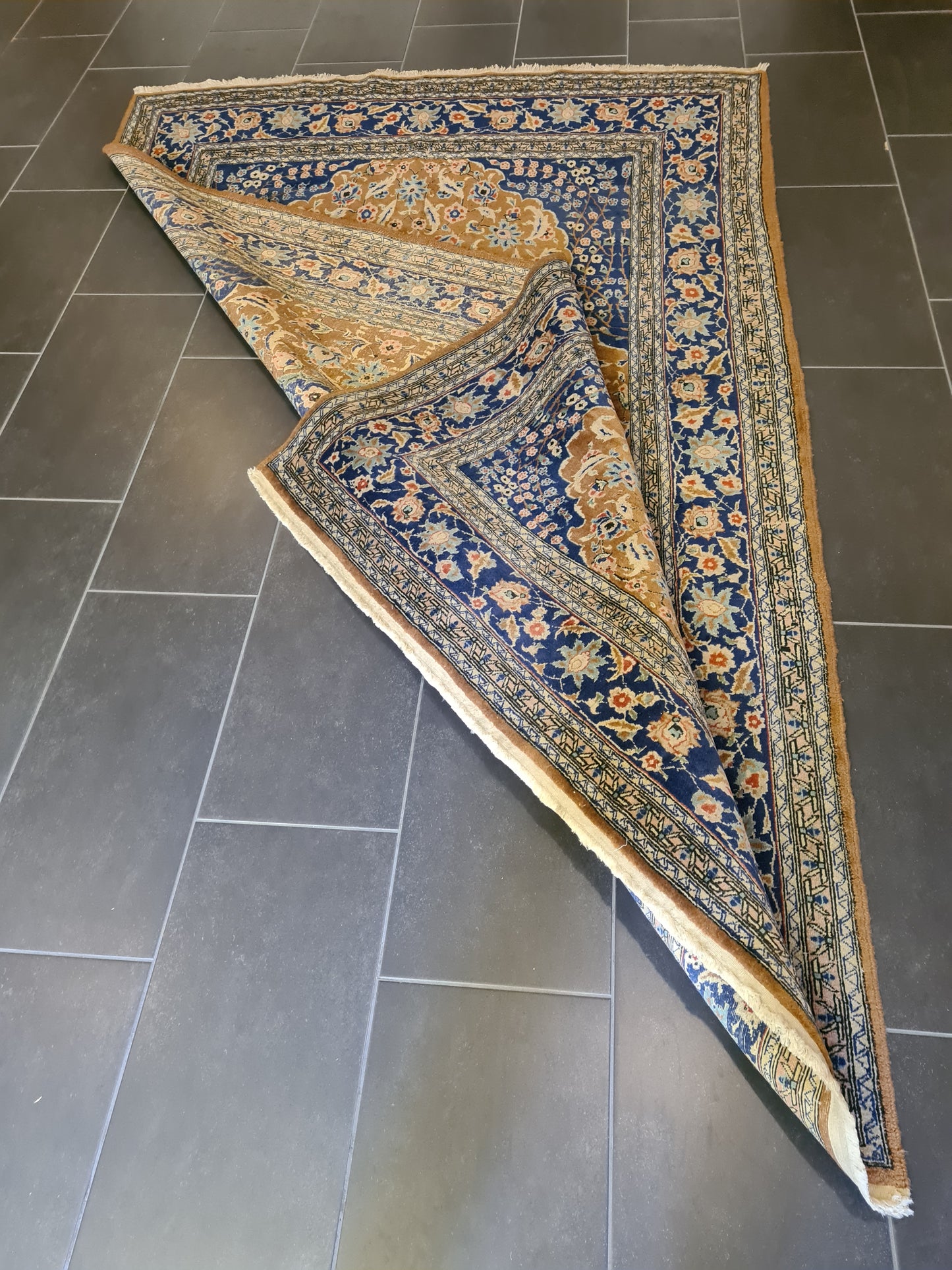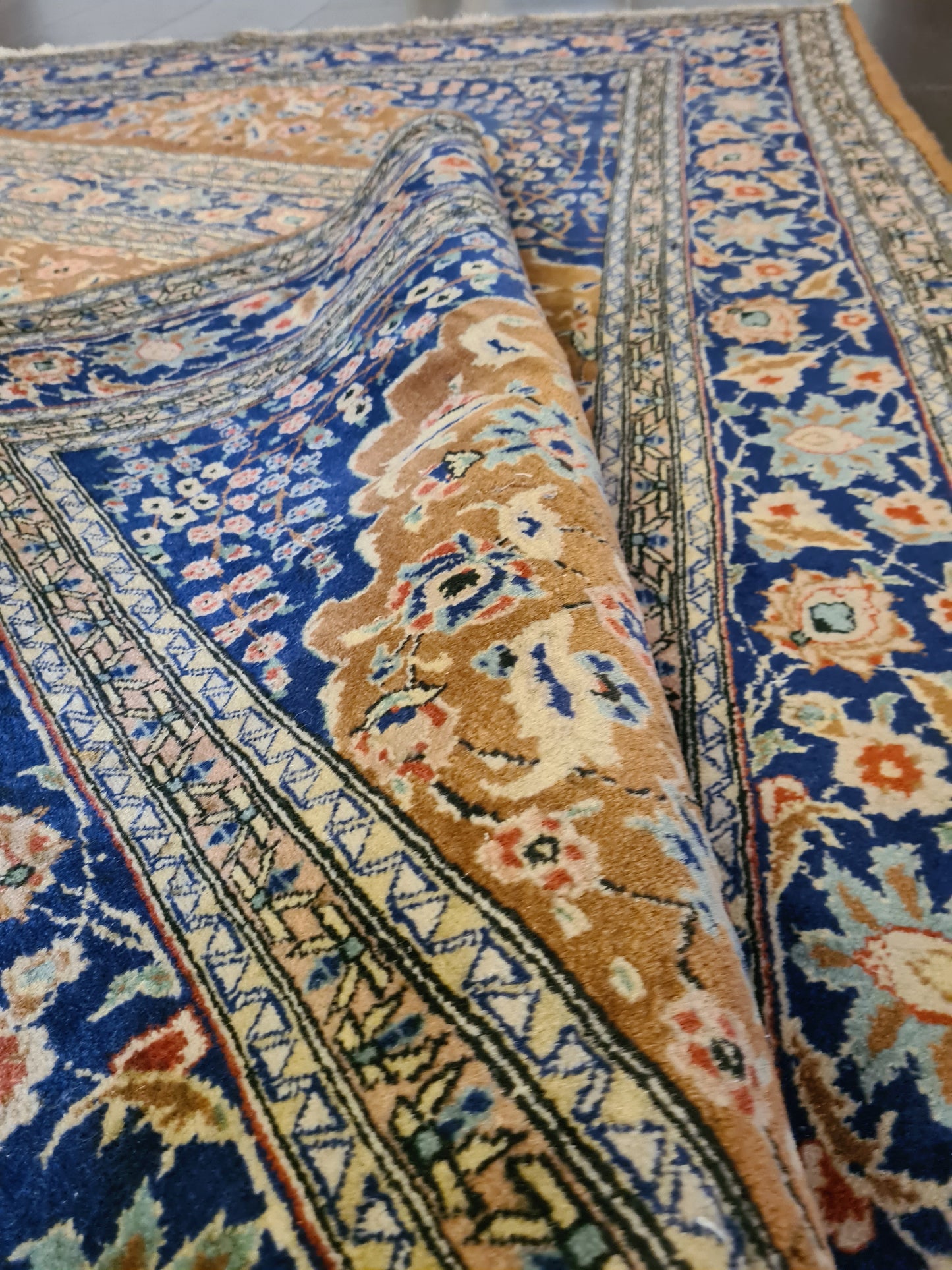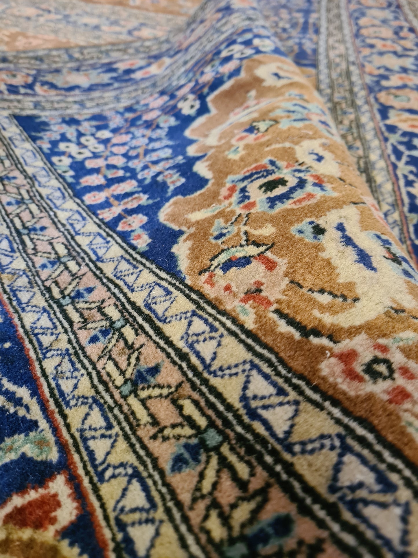 Ob als zentrales Element in Ihrem Wohnzimmer, als dekorativer Akzent im Arbeitszimmer oder als wertvolles Sammlerstück – dieser Teppich zieht bewundernde Blicke auf sich und bereichert jedes Ambiente. Sein gut erhaltener Zustand und die minimale Abnutzungsspuren verleihen ihm den authentischen Charme eines antiken Kunstwerks.