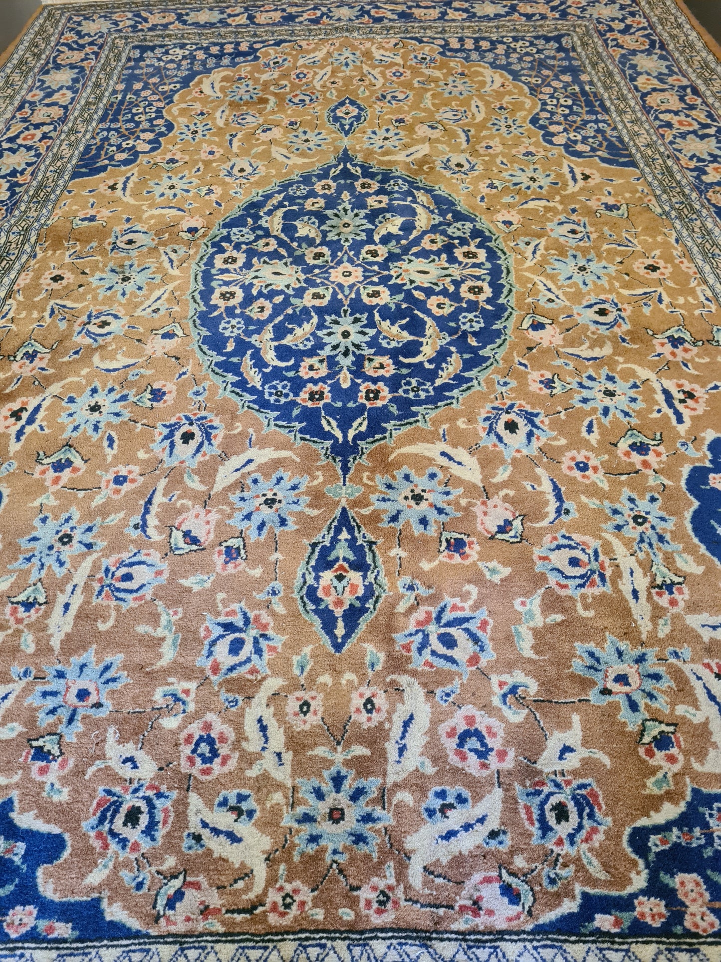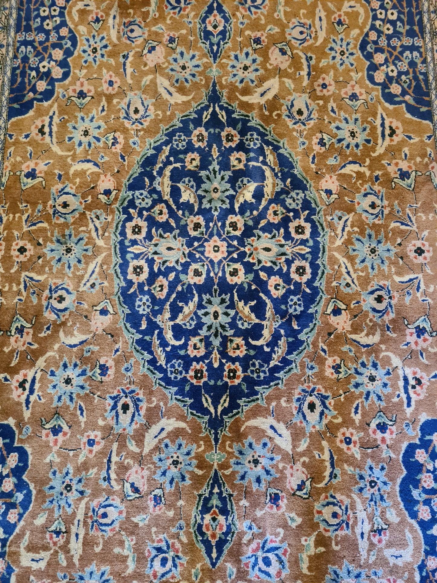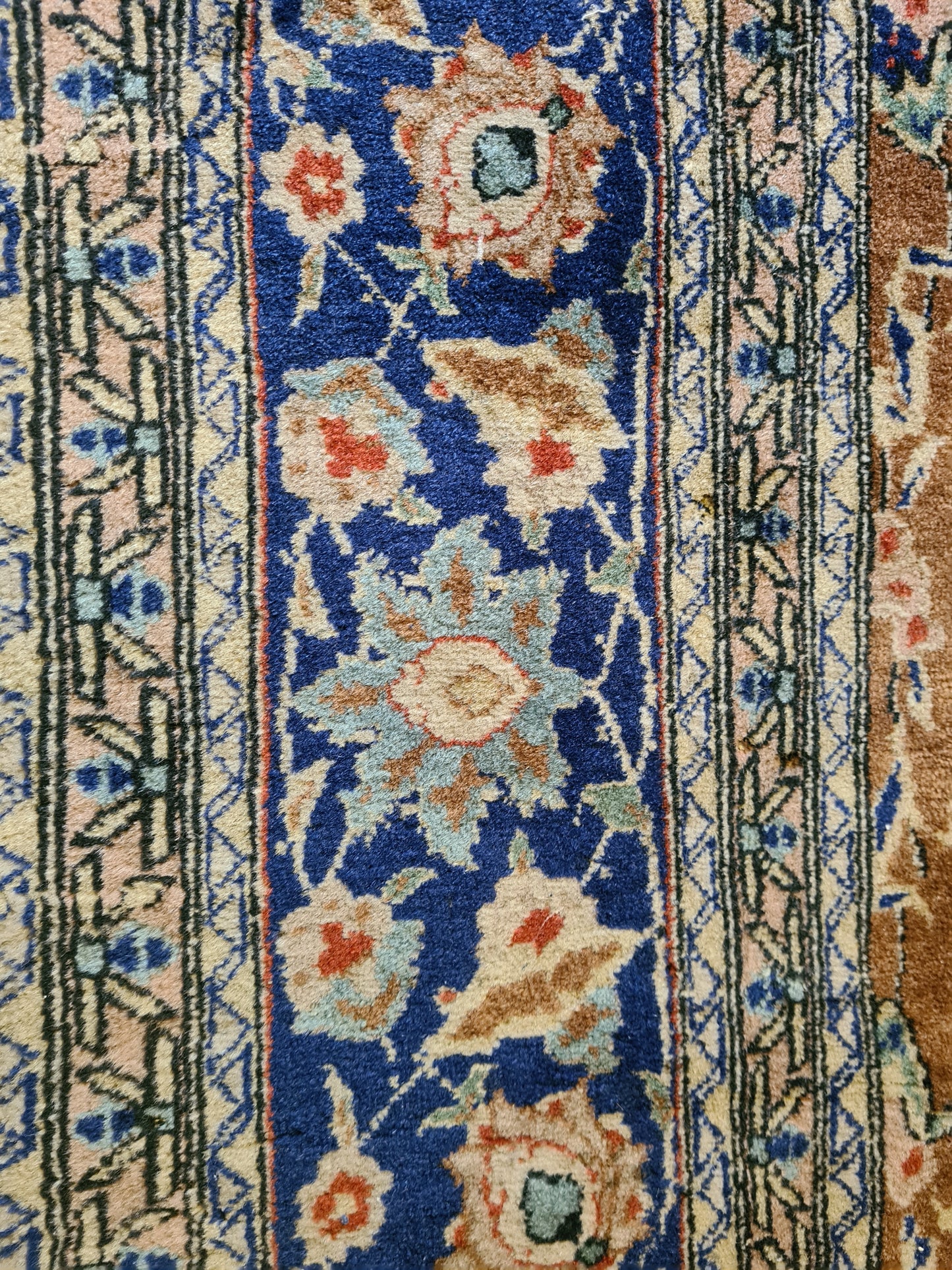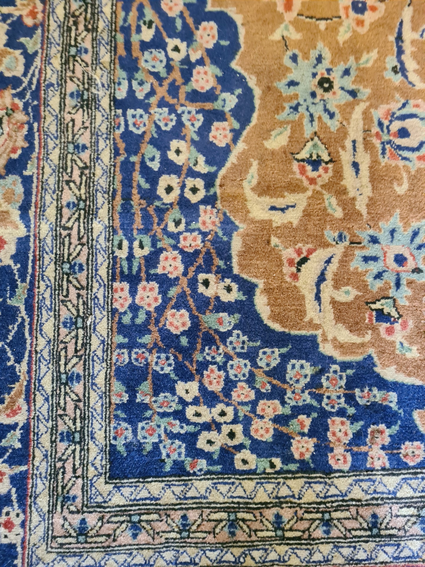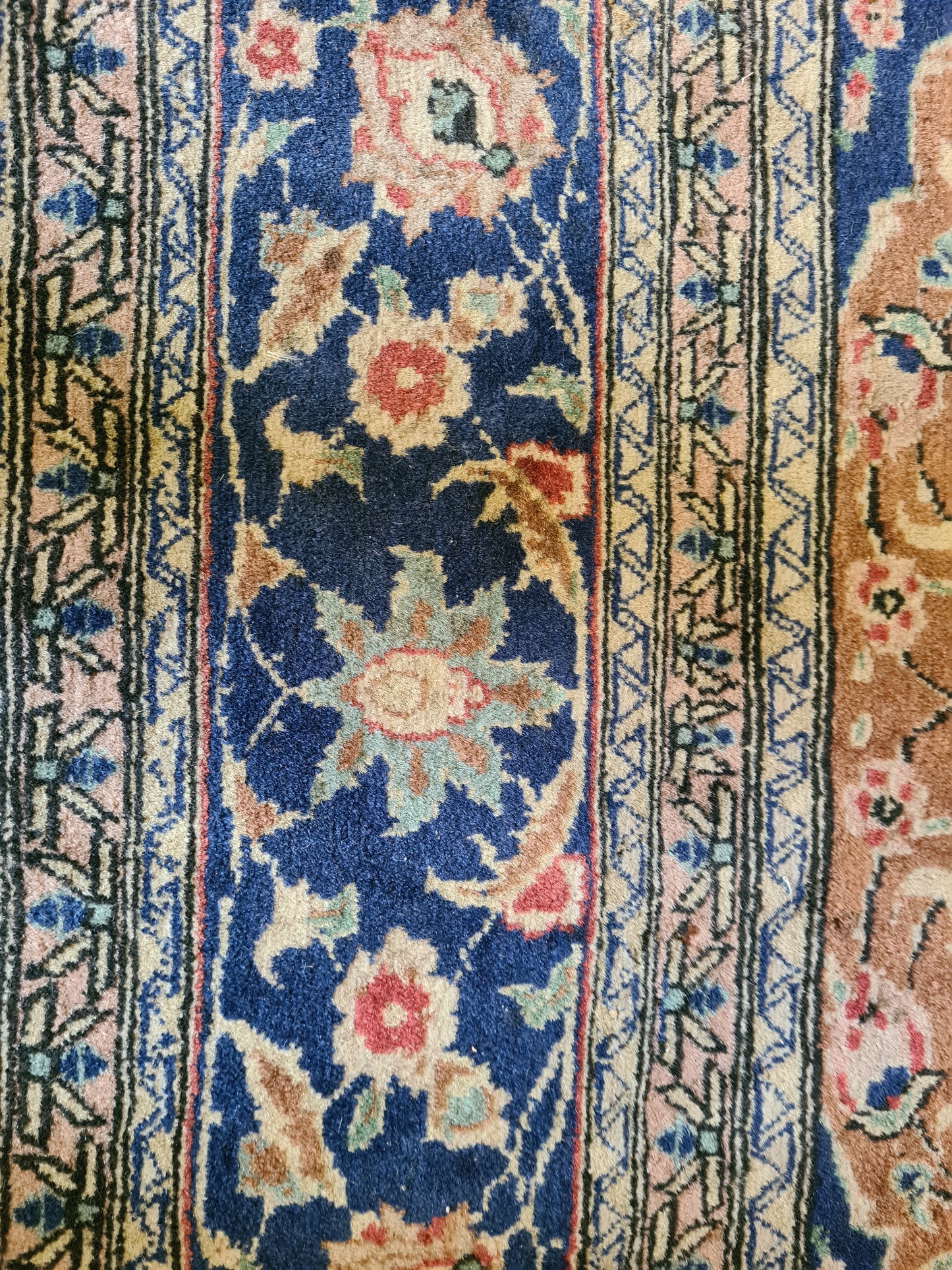 Ob als zentrales Element in Ihrem Wohnzimmer, als dekorativer Akzent im Arbeitszimmer oder als wertvolles Sammlerstück – dieser Teppich zieht bewundernde Blicke auf sich und bereichert jedes Ambiente. Sein gut erhaltener Zustand und die minimale Abnutzungsspuren verleihen ihm den authentischen Charme eines antiken Kunstwerks.