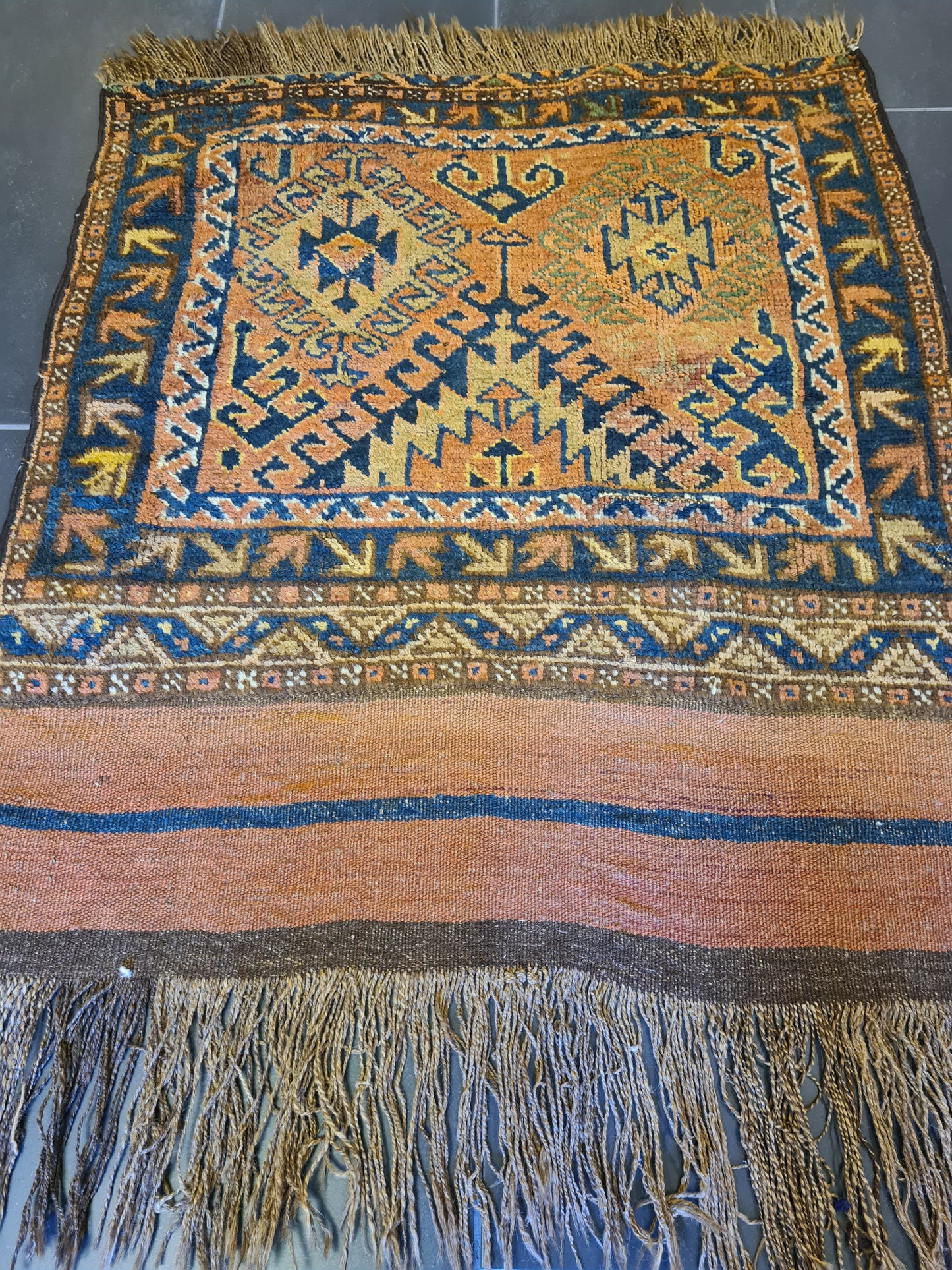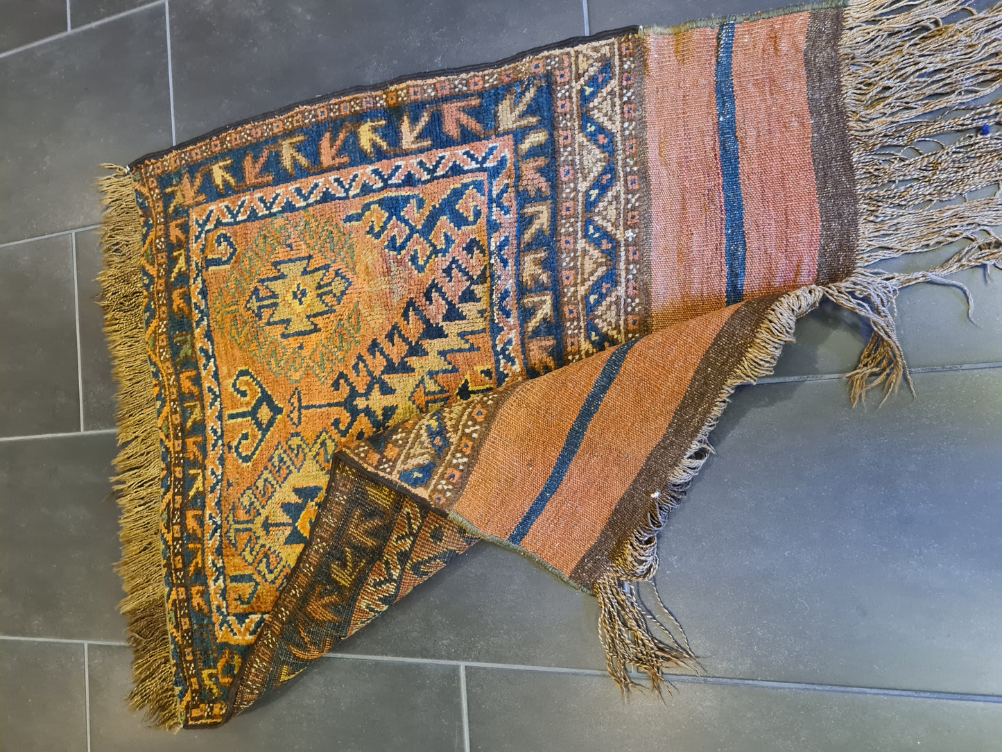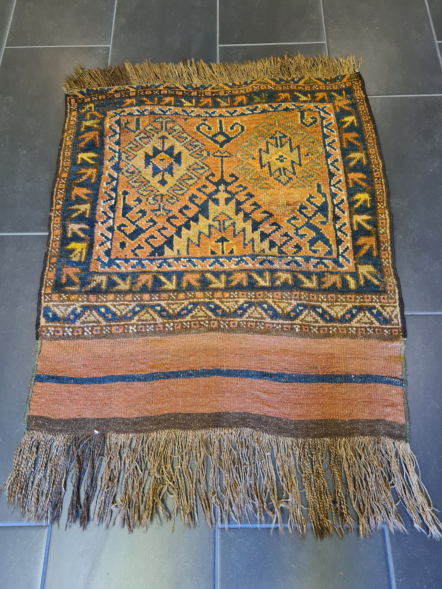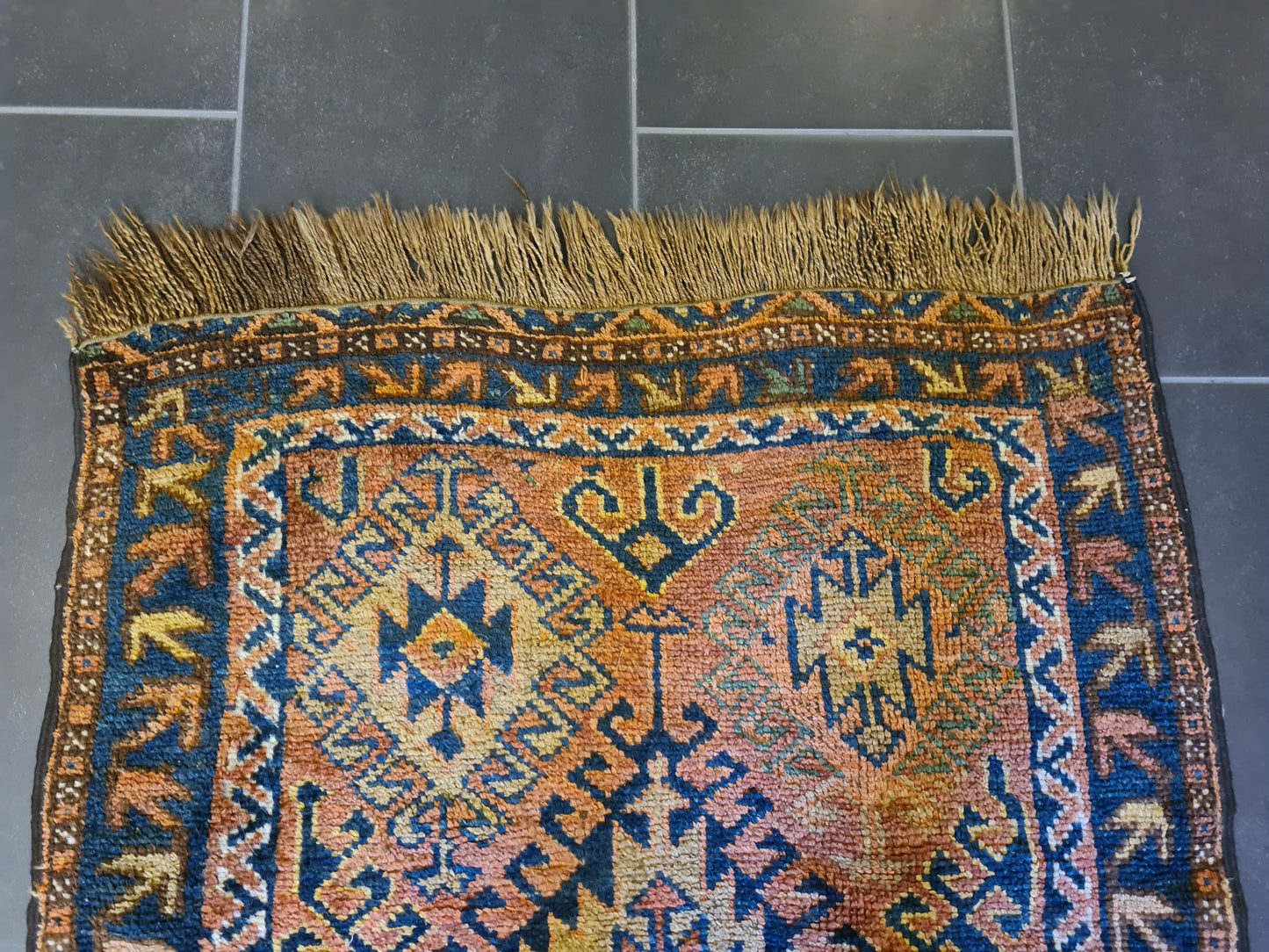 Mit seiner kompakten Größe ist dieser Teppich vielseitig einsetzbar – ob als Highlight in einem kleinen Raum, als dekorativer Akzent auf einem Tisch oder als luxuriöse Wanddekoration. Perfekt für Kenner und Sammler, die die ästhetische und kulturelle Bedeutung antiker Teppiche schätzen.