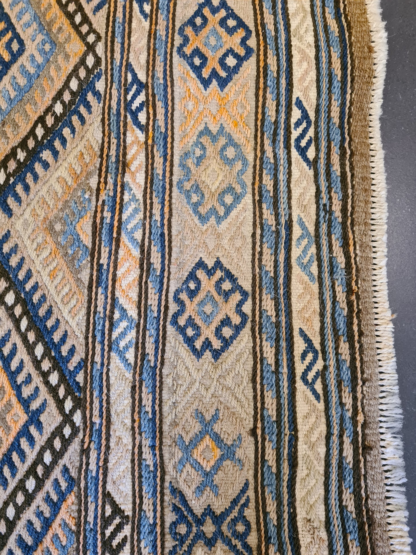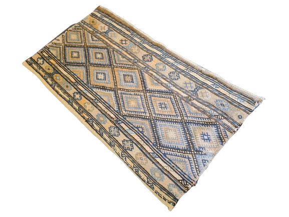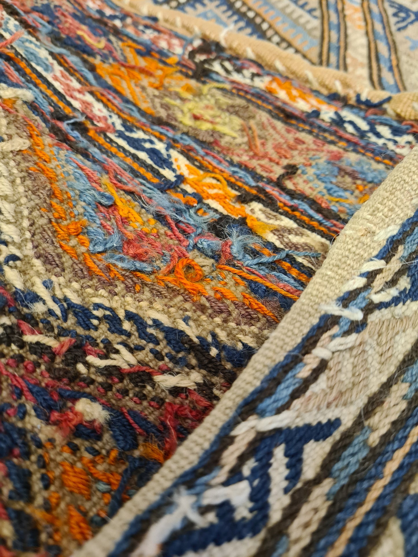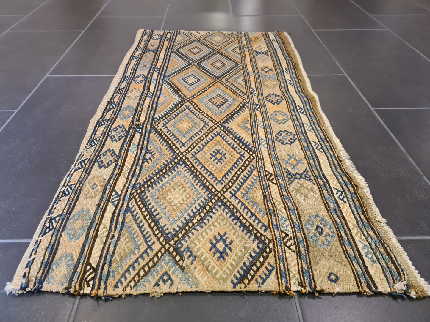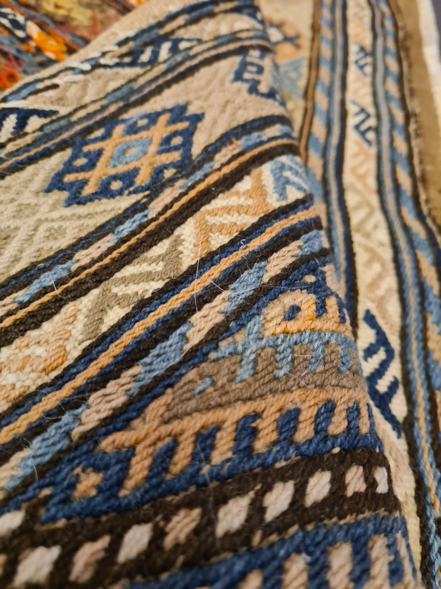 Dieser Sumack Kelim Teppich ist nicht nur ein ästhetisches Meisterwerk, sondern auch ein kulturelles Erbe. Sein einzigartiges Design und die feinen Details machen ihn zu einem begehrten Sammlerstück für Liebhaber traditioneller Handwerkskunst. Perfekt für die Bereicherung Ihrer Sammlung oder als beeindruckendes Geschenk für Kunst- und Teppichliebhaber.