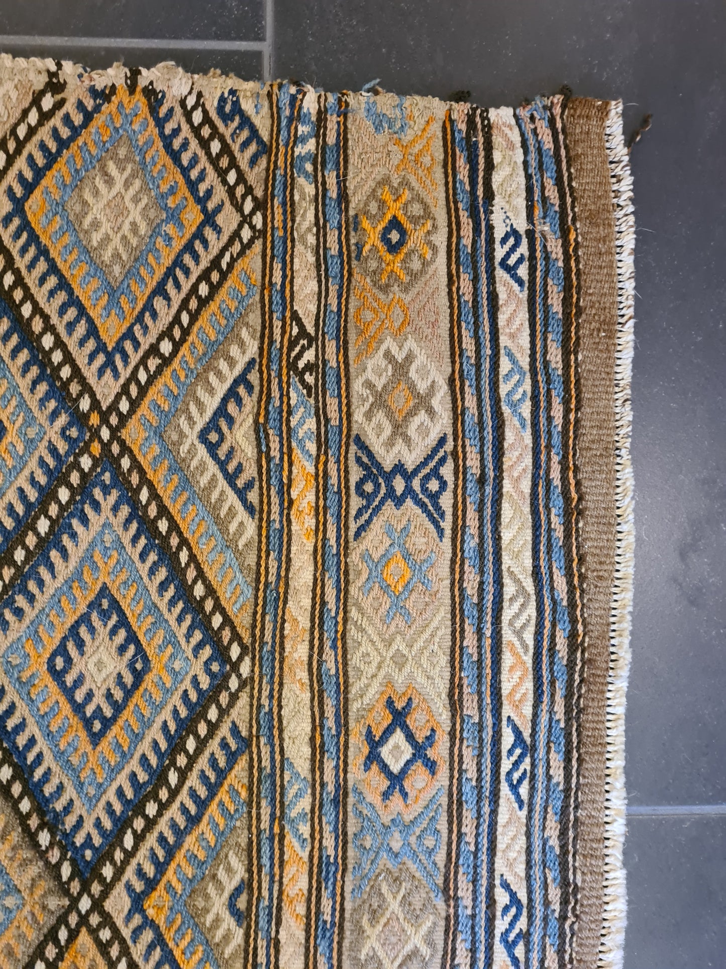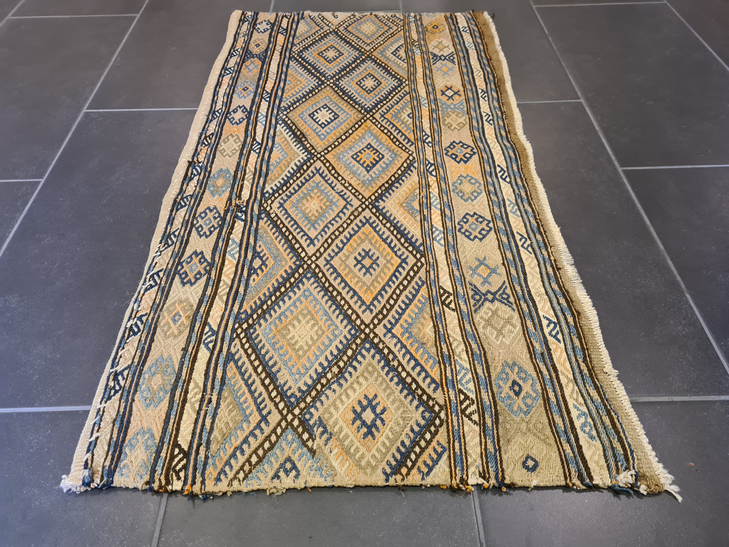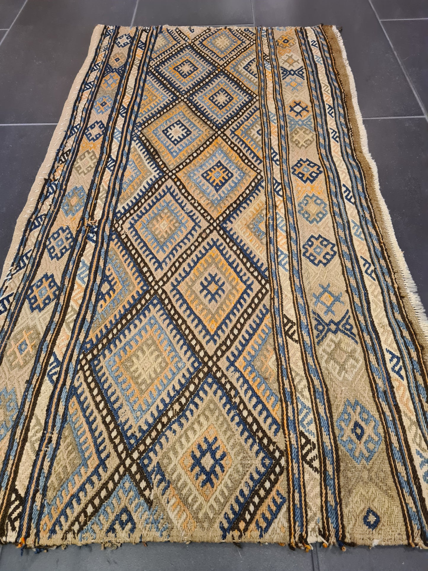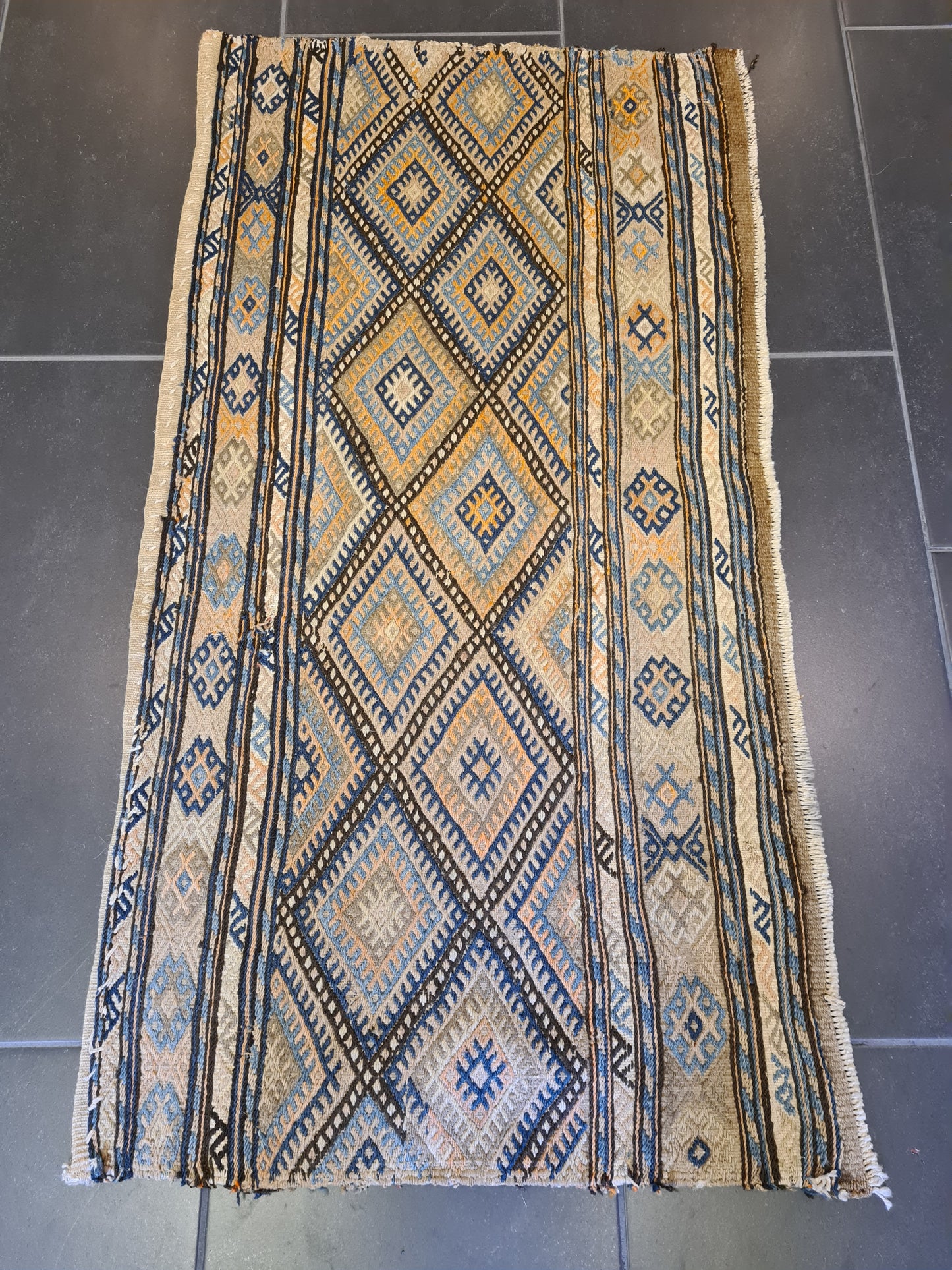 Dieser Sumack Kelim Teppich ist nicht nur ein ästhetisches Meisterwerk, sondern auch ein kulturelles Erbe. Sein einzigartiges Design und die feinen Details machen ihn zu einem begehrten Sammlerstück für Liebhaber traditioneller Handwerkskunst. Perfekt für die Bereicherung Ihrer Sammlung oder als beeindruckendes Geschenk für Kunst- und Teppichliebhaber.