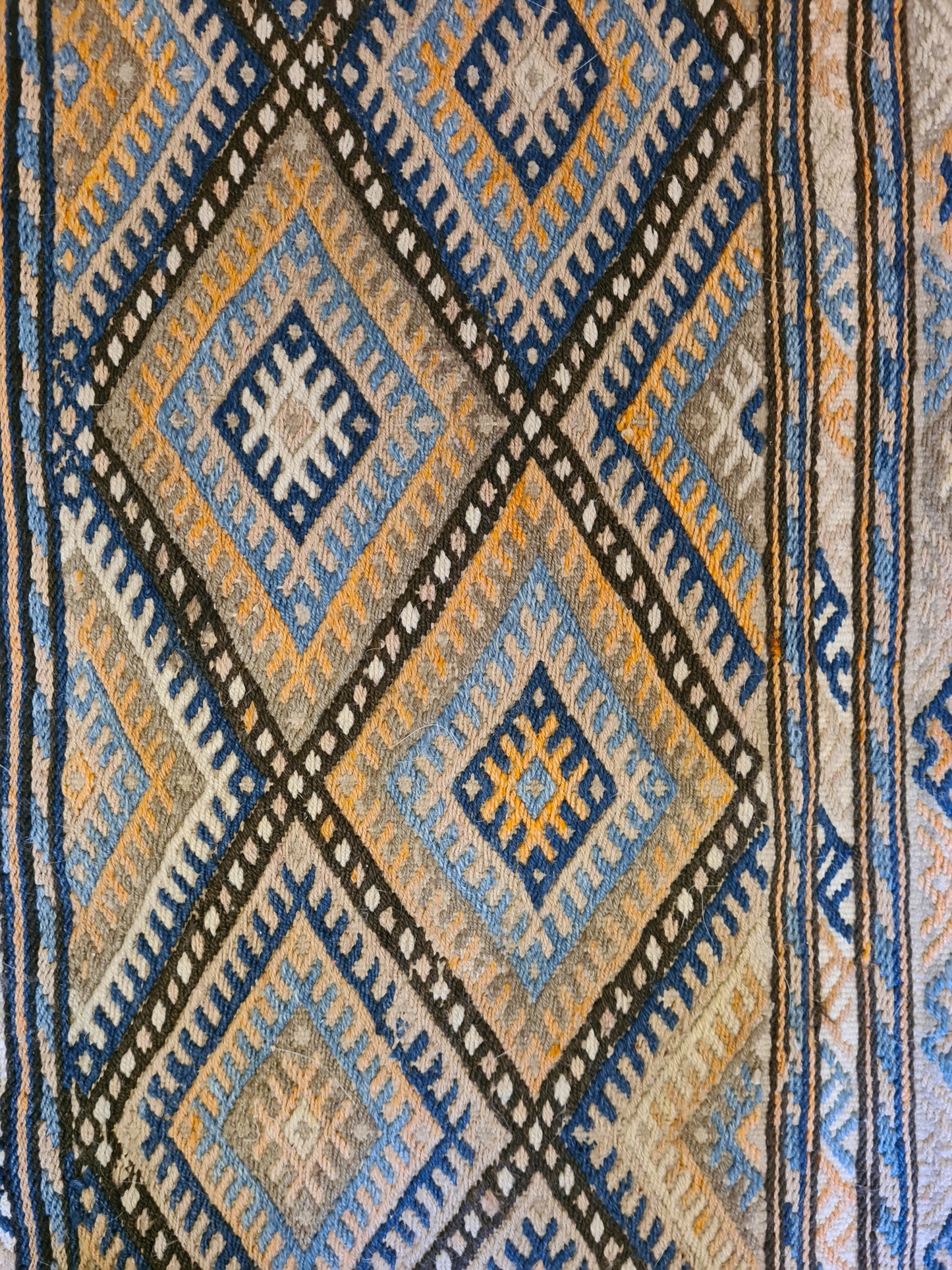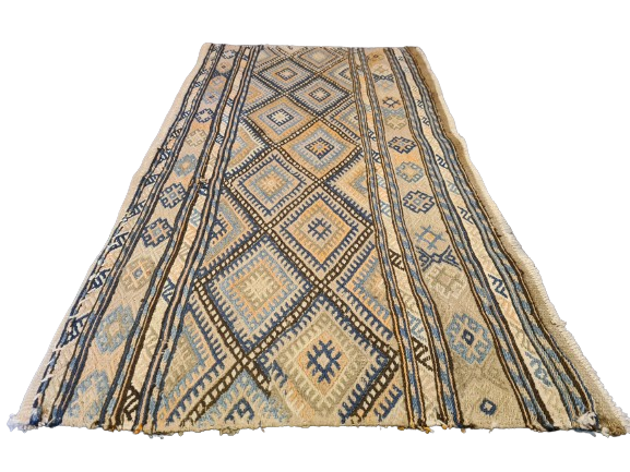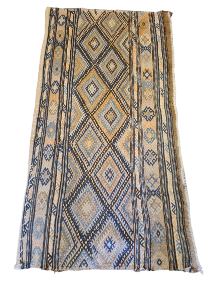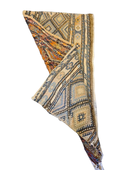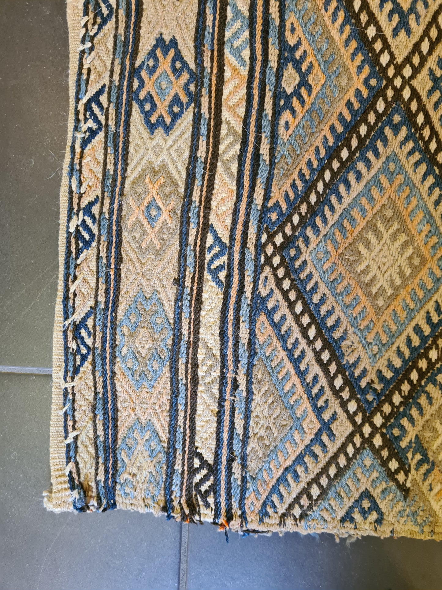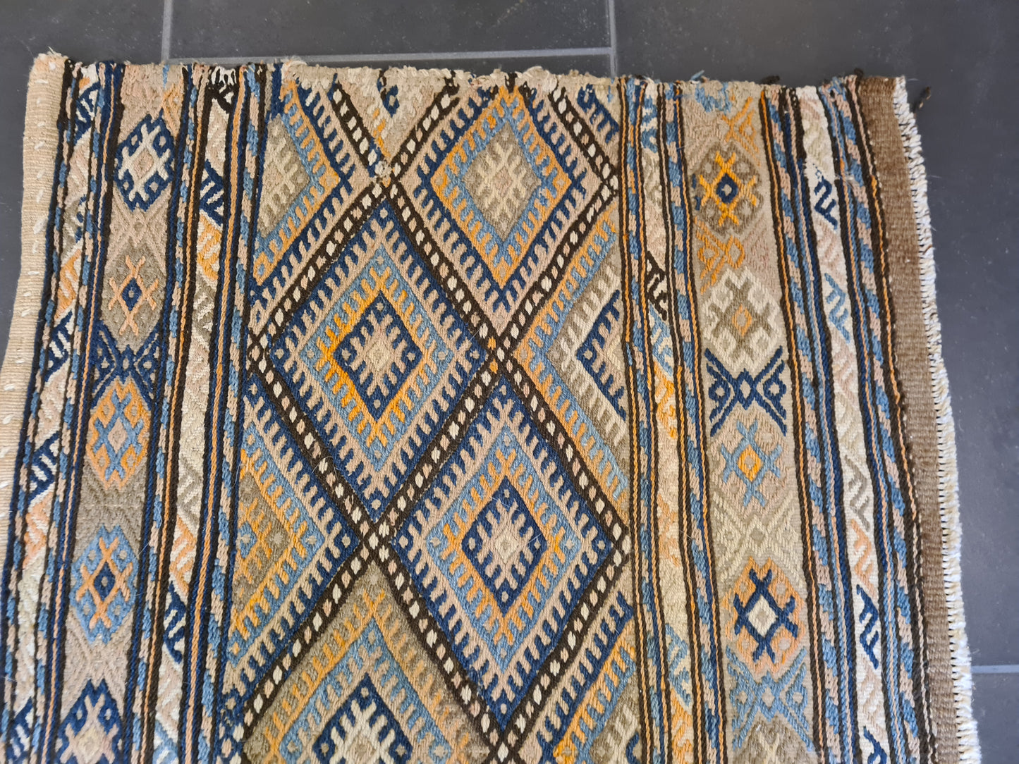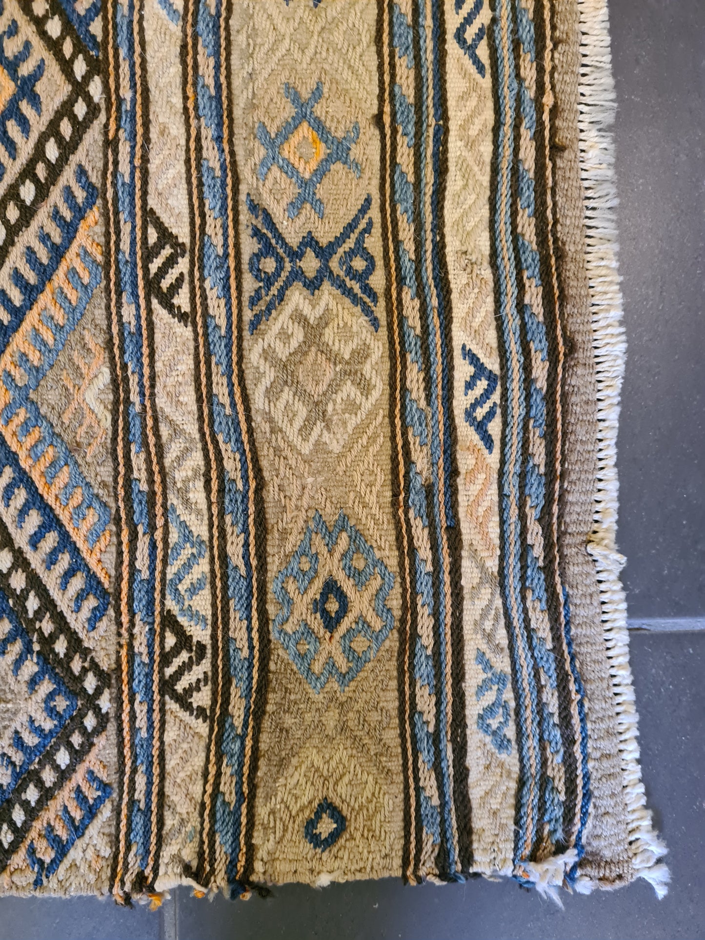 Dieser Sumack Kelim Teppich ist nicht nur ein ästhetisches Meisterwerk, sondern auch ein kulturelles Erbe. Sein einzigartiges Design und die feinen Details machen ihn zu einem begehrten Sammlerstück für Liebhaber traditioneller Handwerkskunst. Perfekt für die Bereicherung Ihrer Sammlung oder als beeindruckendes Geschenk für Kunst- und Teppichliebhaber.