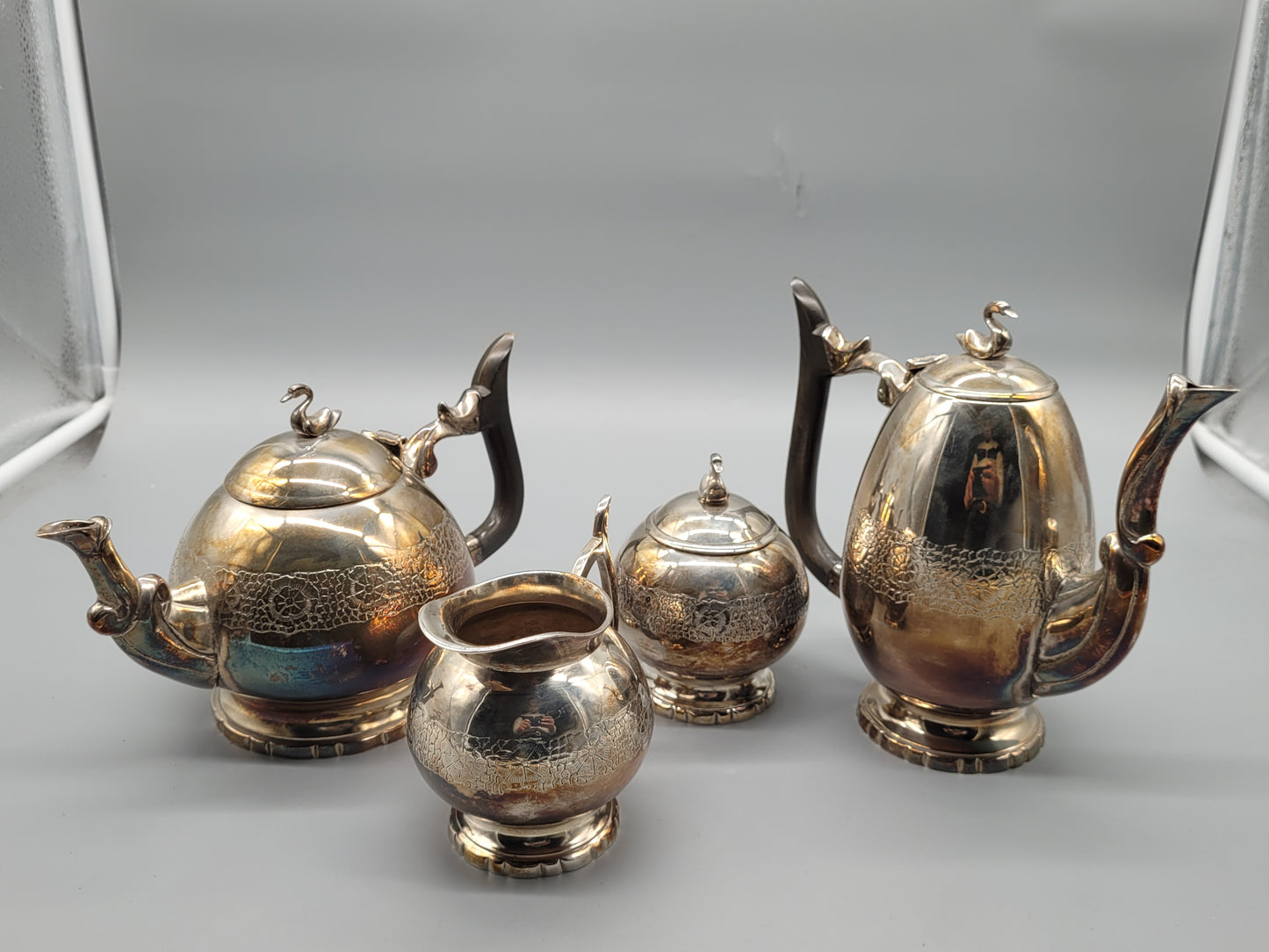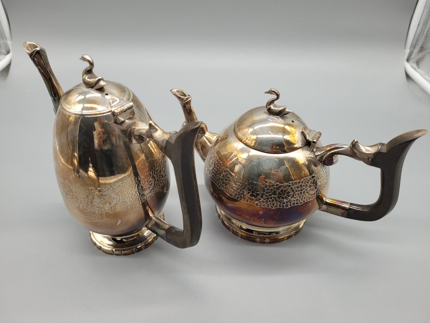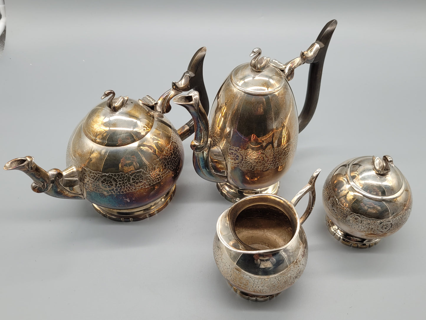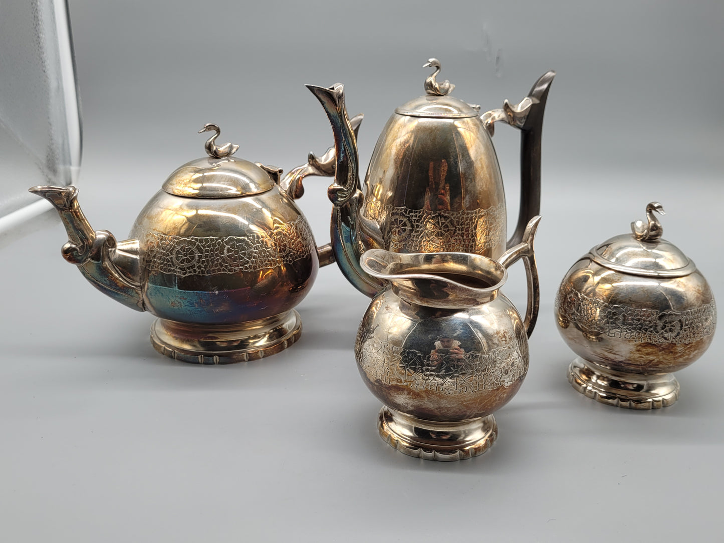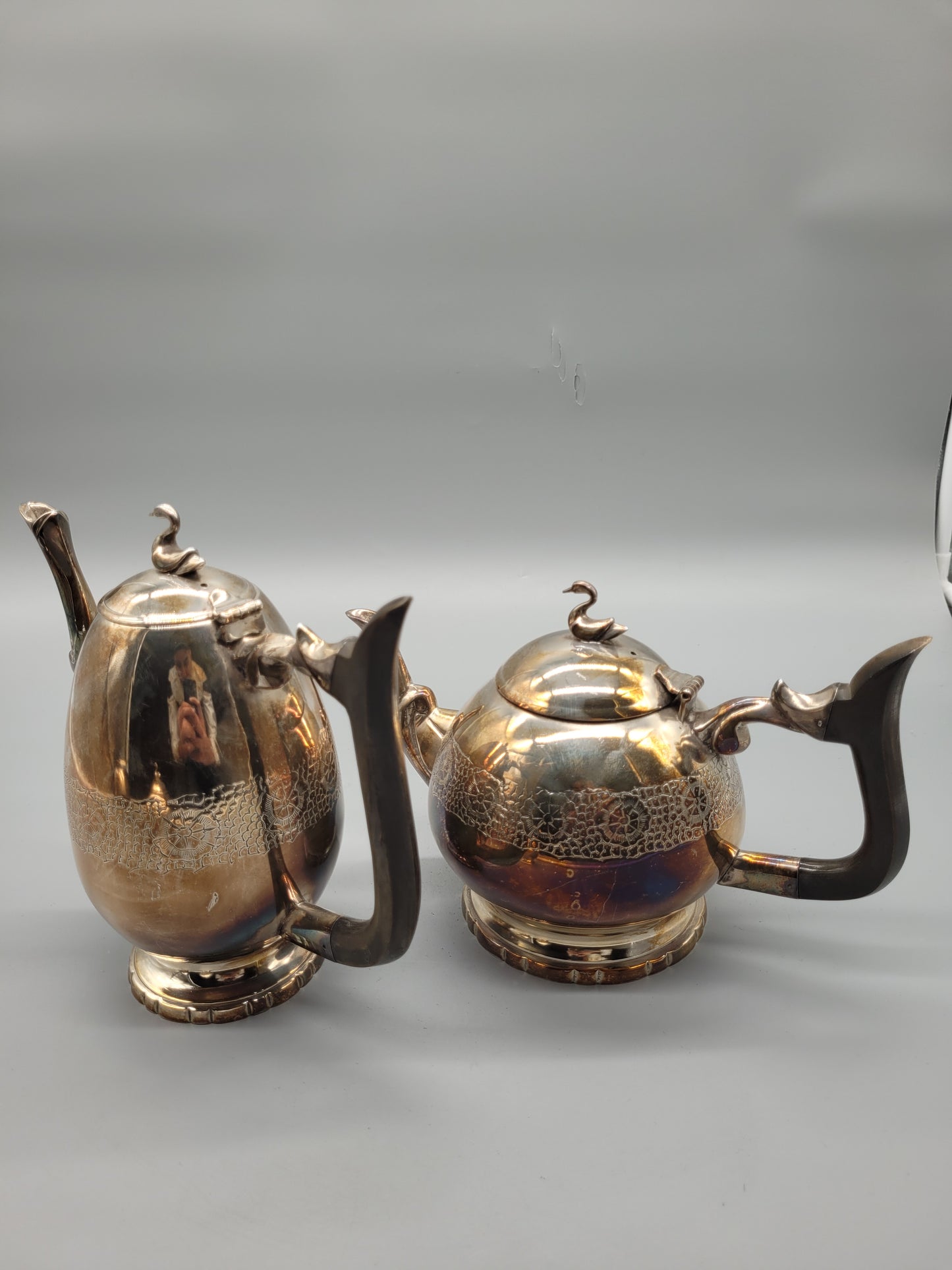 Beschreibung: Entdecken Sie die Anmut vergangener Zeiten mit unserem antiken versilberten Kaffee- und Teeservice. Dieses exquisite Ensemble ist nicht nur ein praktisches Set für die Kaffeetafel, sondern auch ein Ausdruck von Eleganz und Tradition.