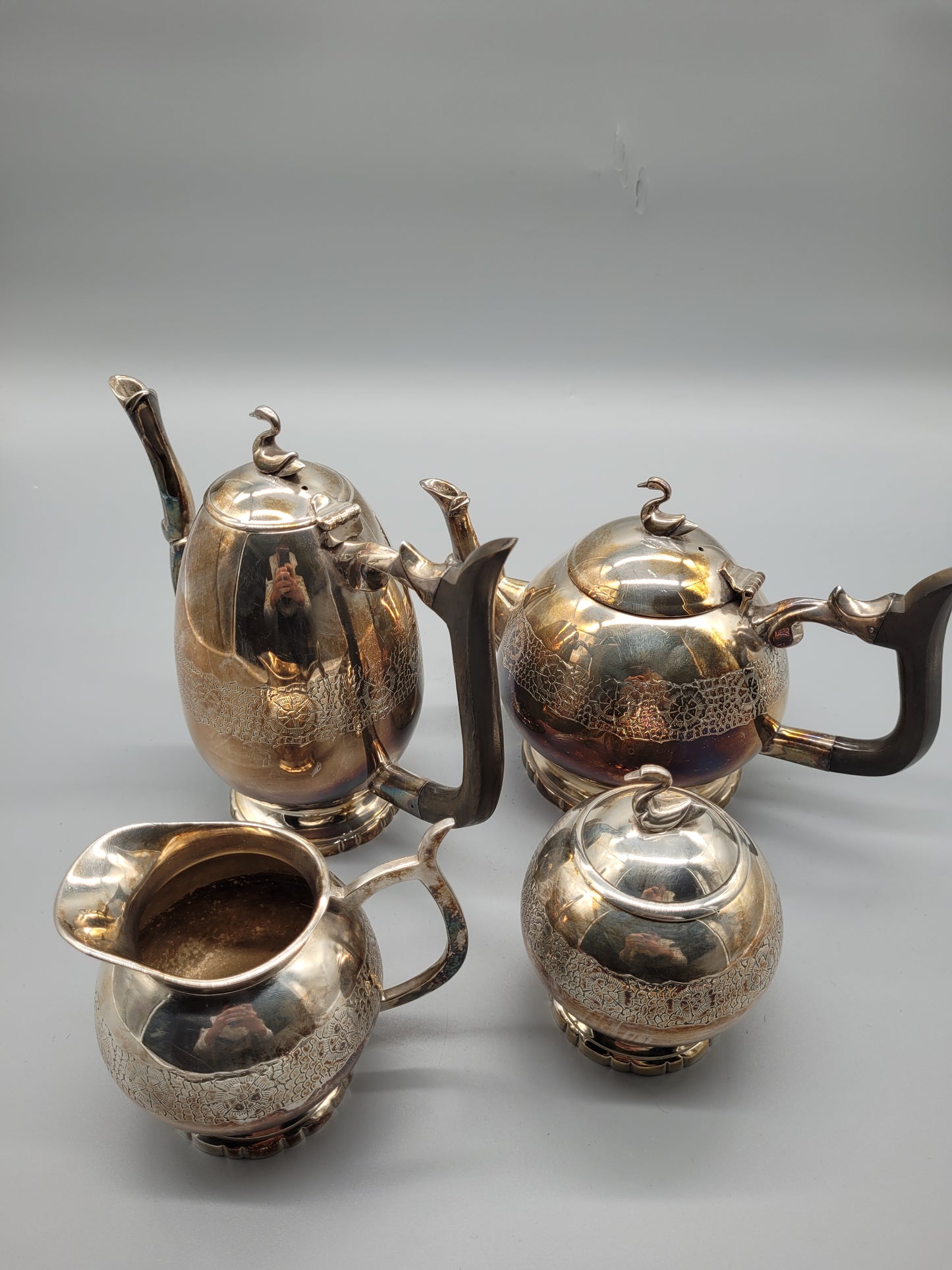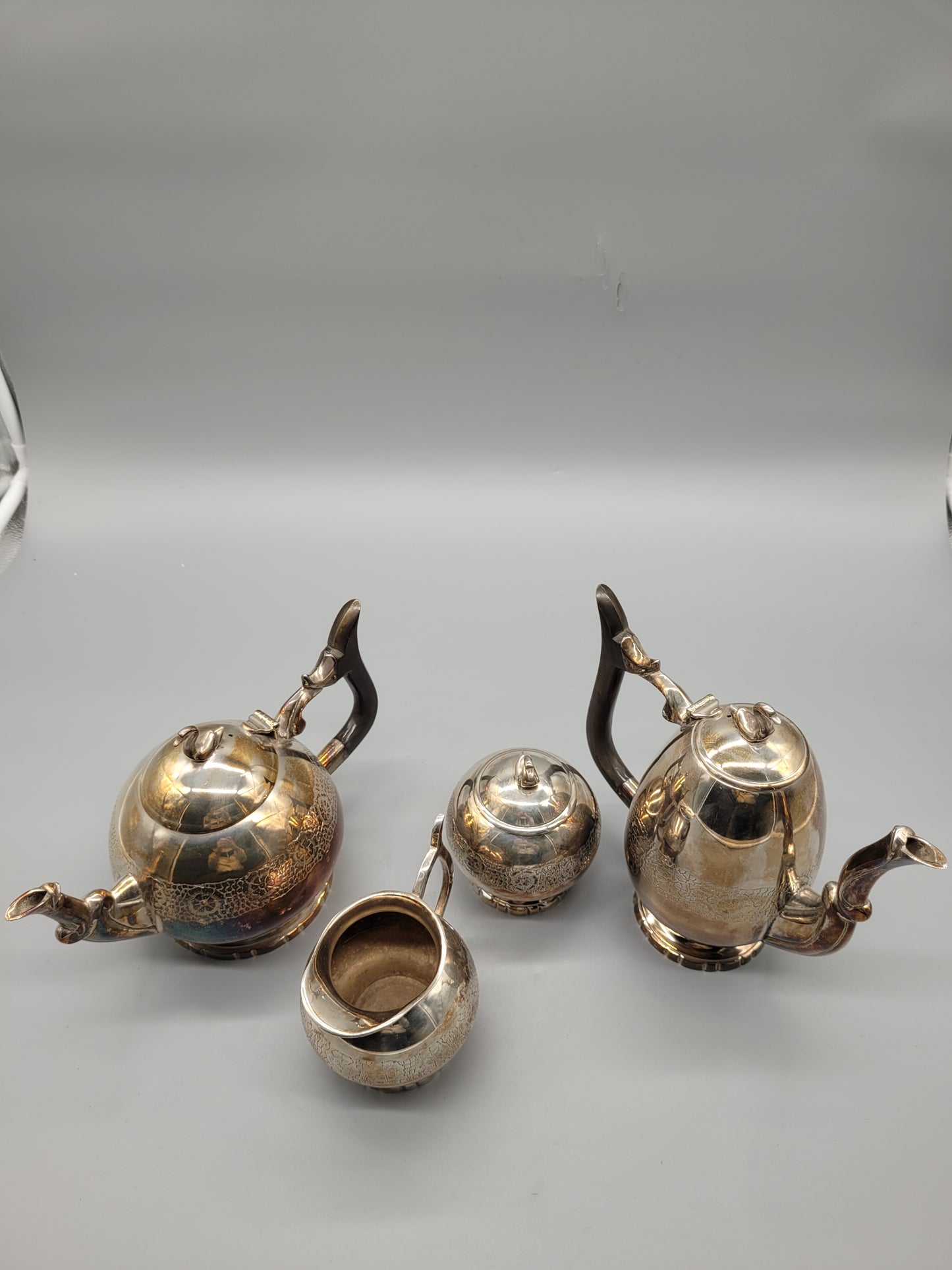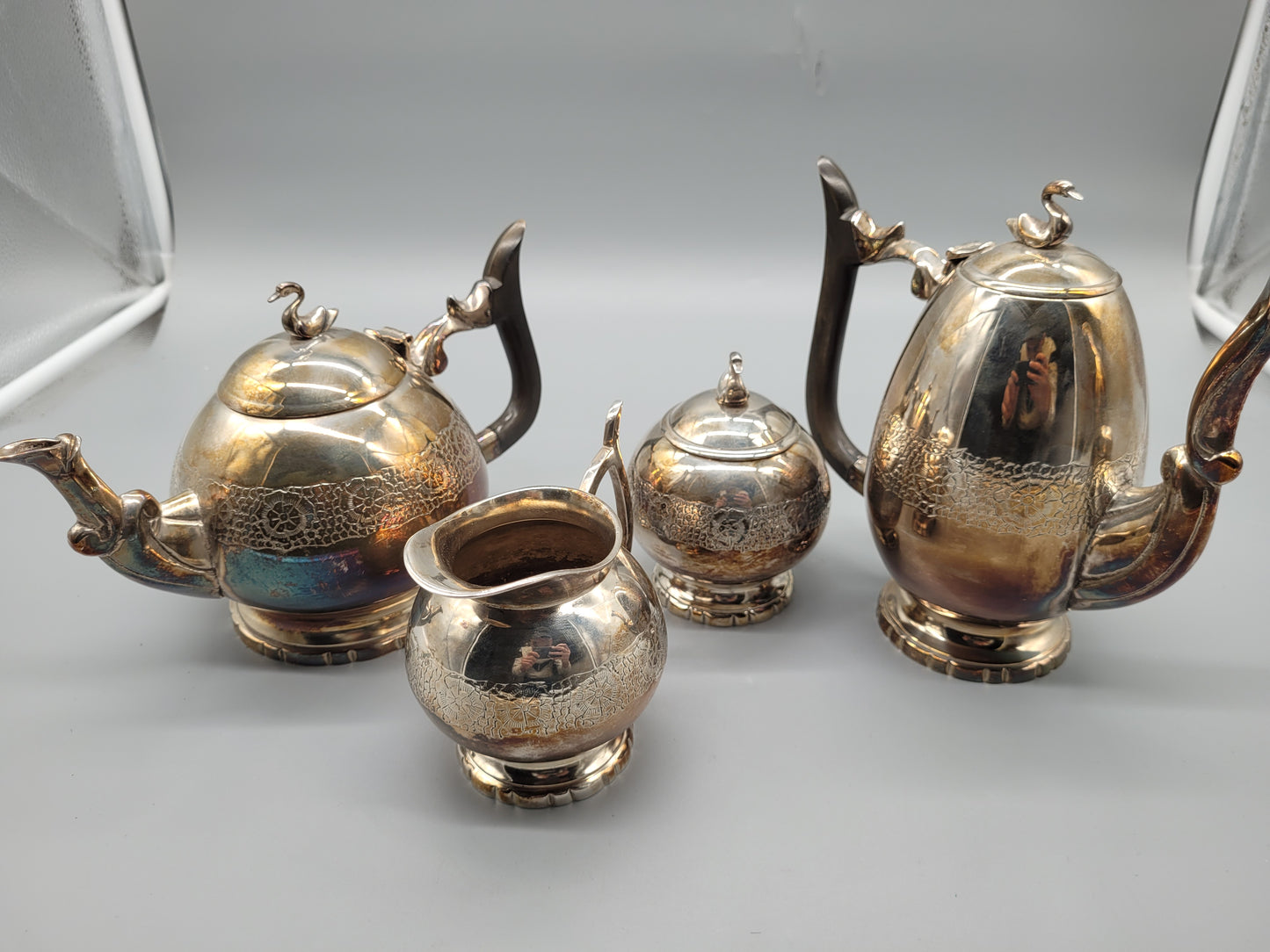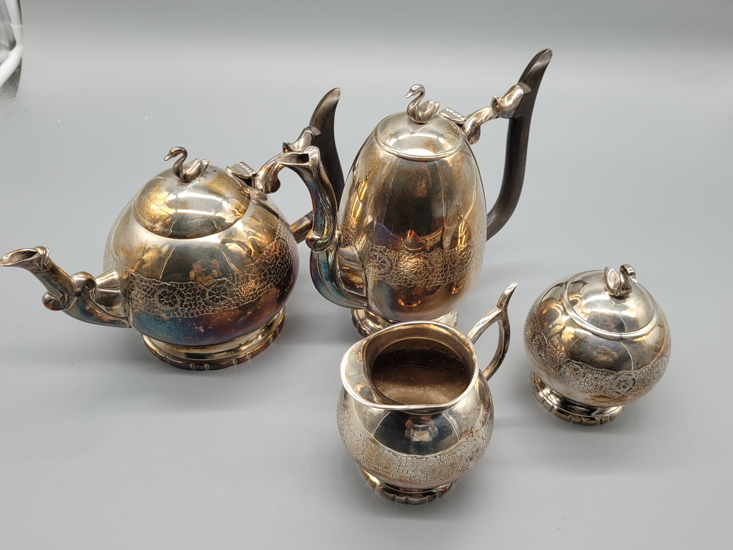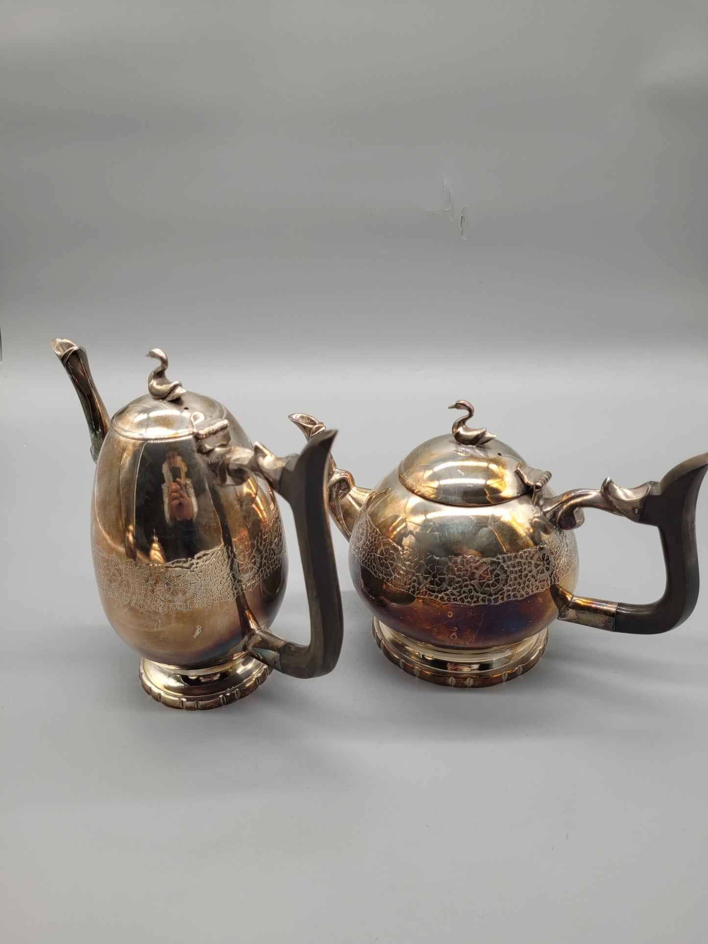 Beschreibung: Entdecken Sie die Anmut vergangener Zeiten mit unserem antiken versilberten Kaffee- und Teeservice. Dieses exquisite Ensemble ist nicht nur ein praktisches Set für die Kaffeetafel, sondern auch ein Ausdruck von Eleganz und Tradition.
