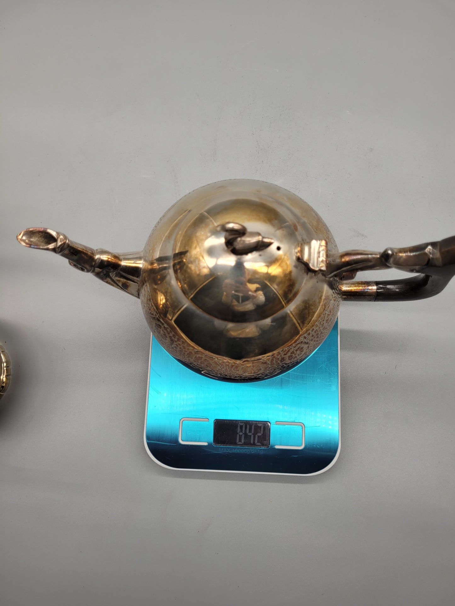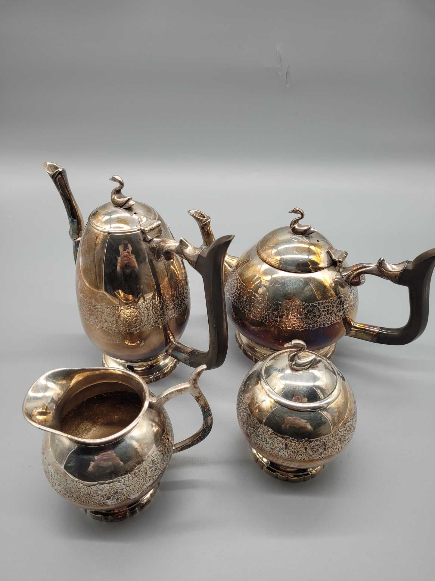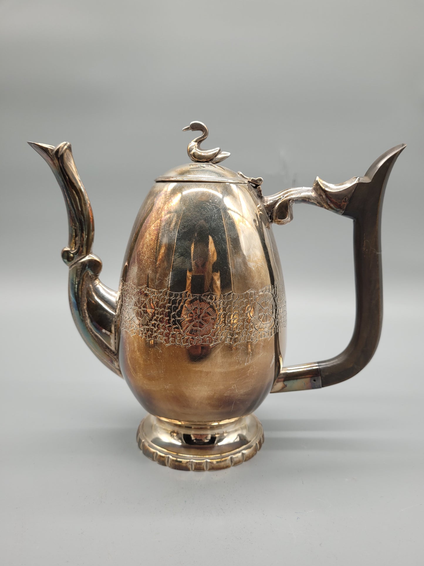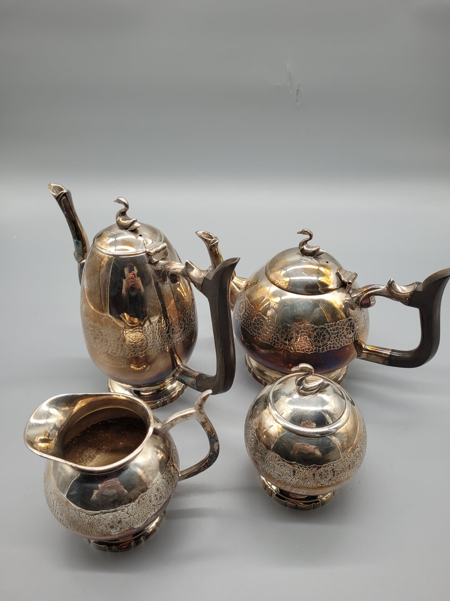Beschreibung: Entdecken Sie die Anmut vergangener Zeiten mit unserem antiken versilberten Kaffee- und Teeservice. Dieses exquisite Ensemble ist nicht nur ein praktisches Set für die Kaffeetafel, sondern auch ein Ausdruck von Eleganz und Tradition.