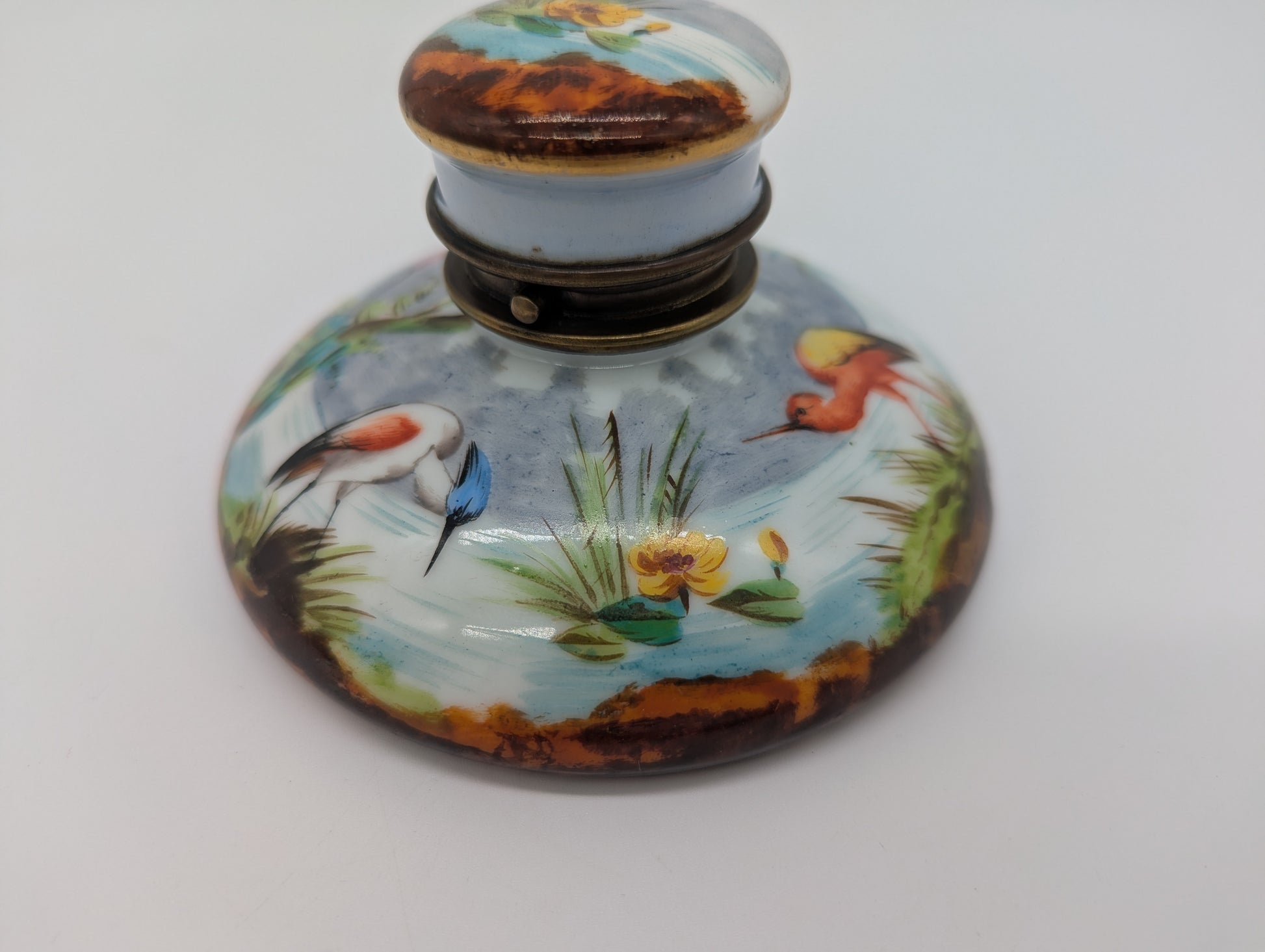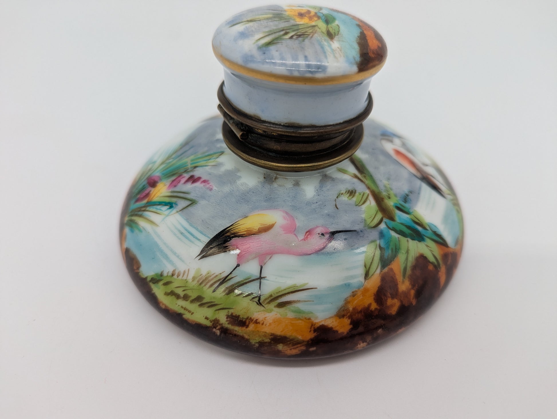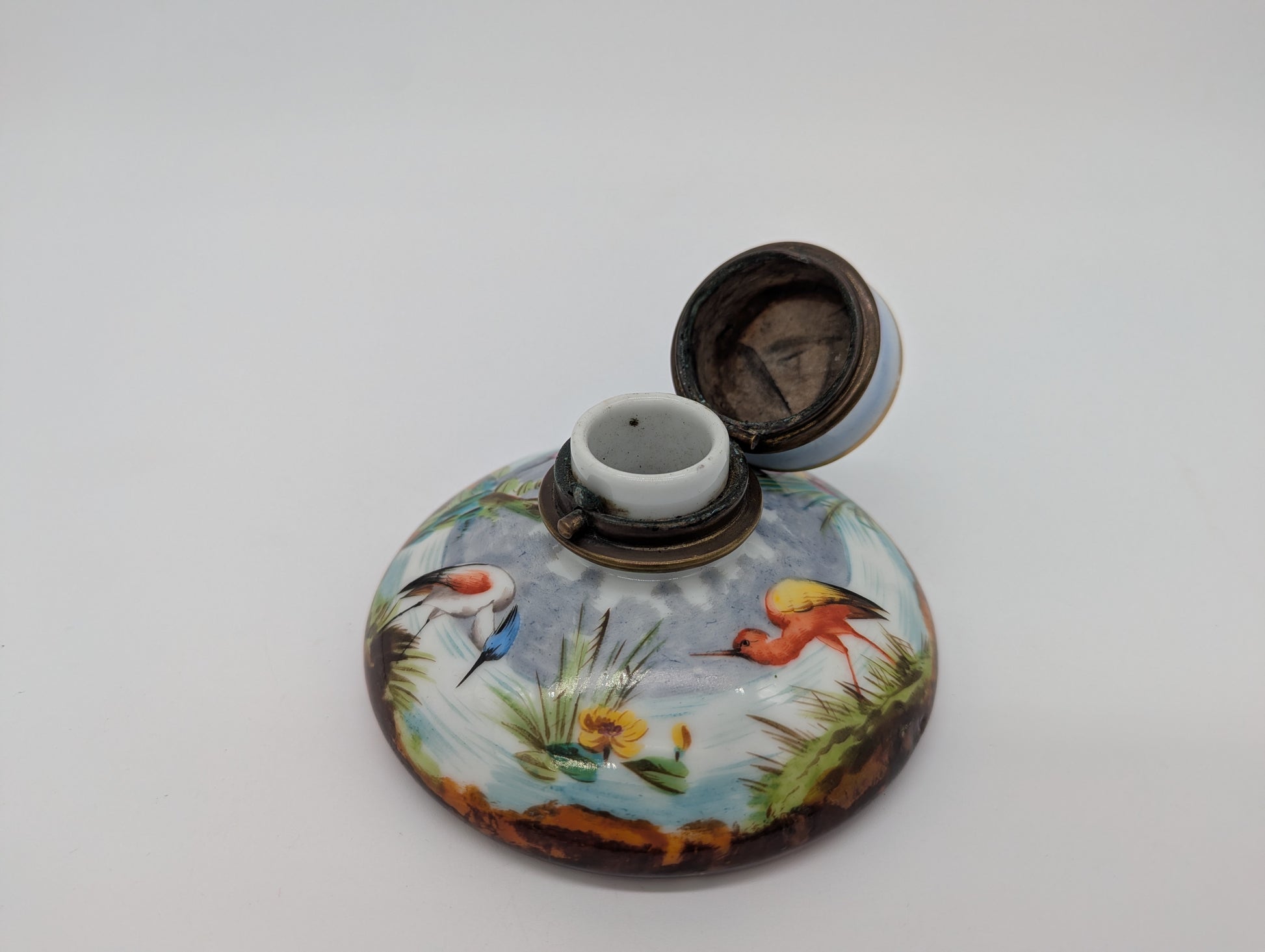 Antikes Tintenfass Handbemalt Emaille Vogelmotiv mit Messingfassung