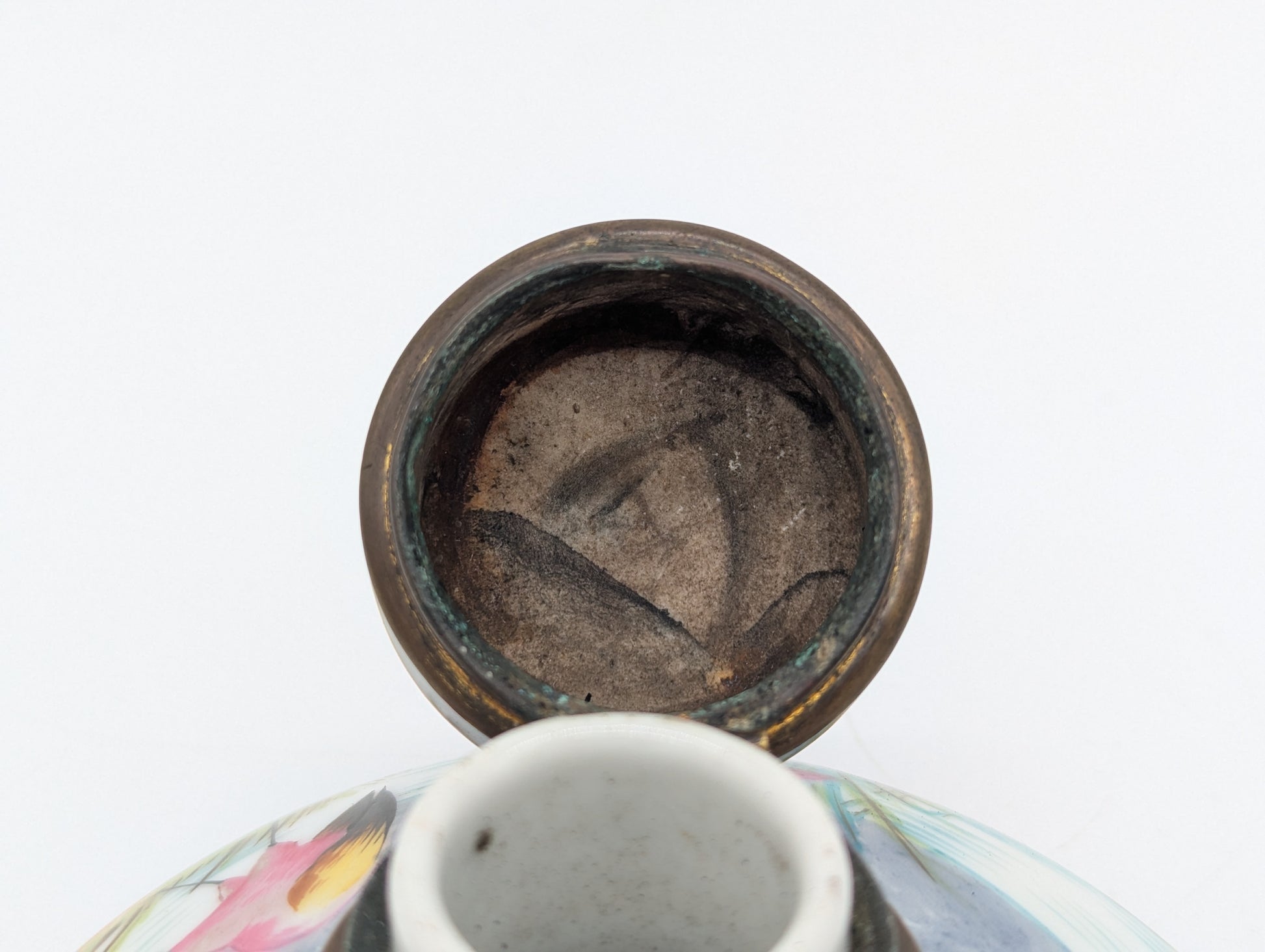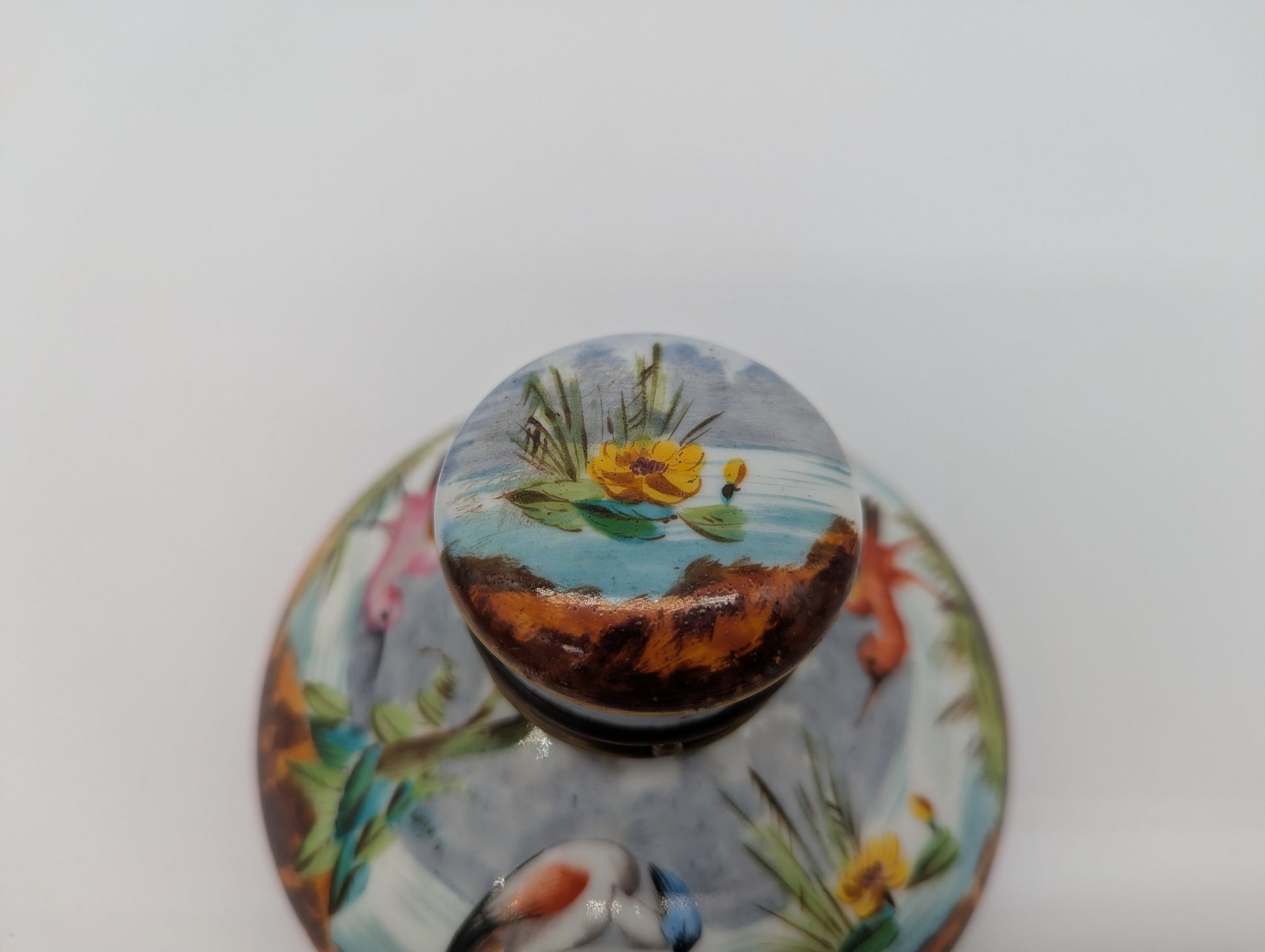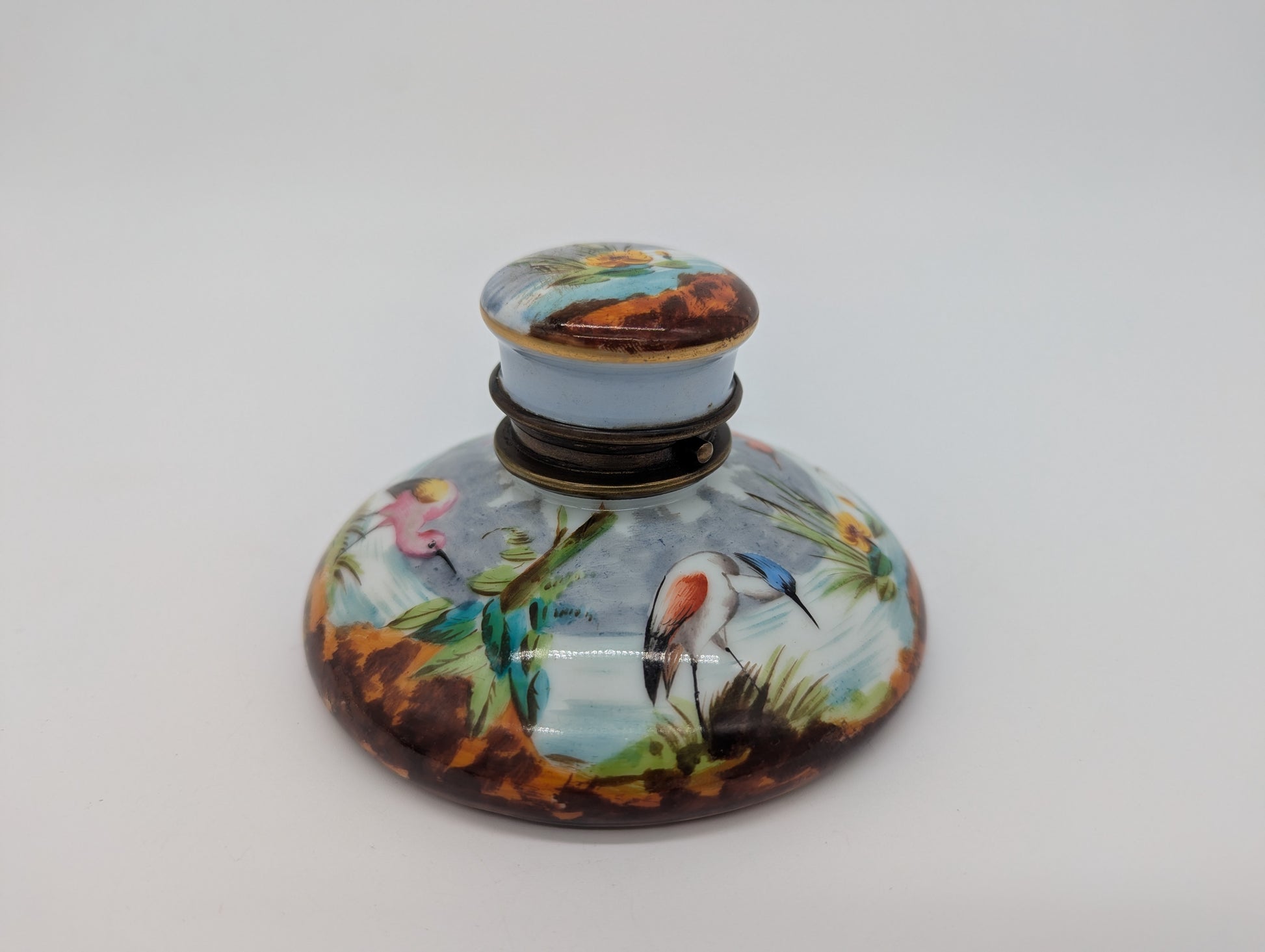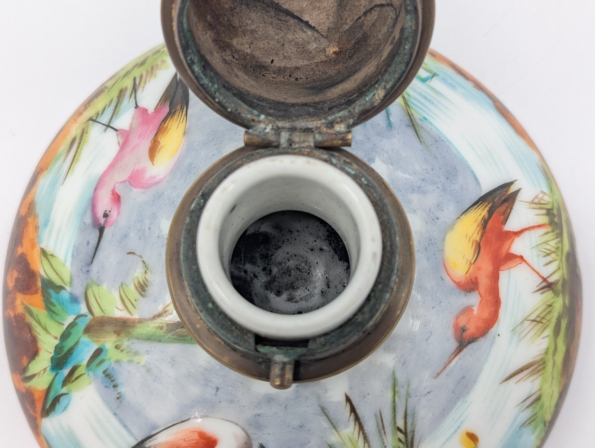 Antikes Tintenfass Handbemalt Emaille Vogelmotiv mit Messingfassung
