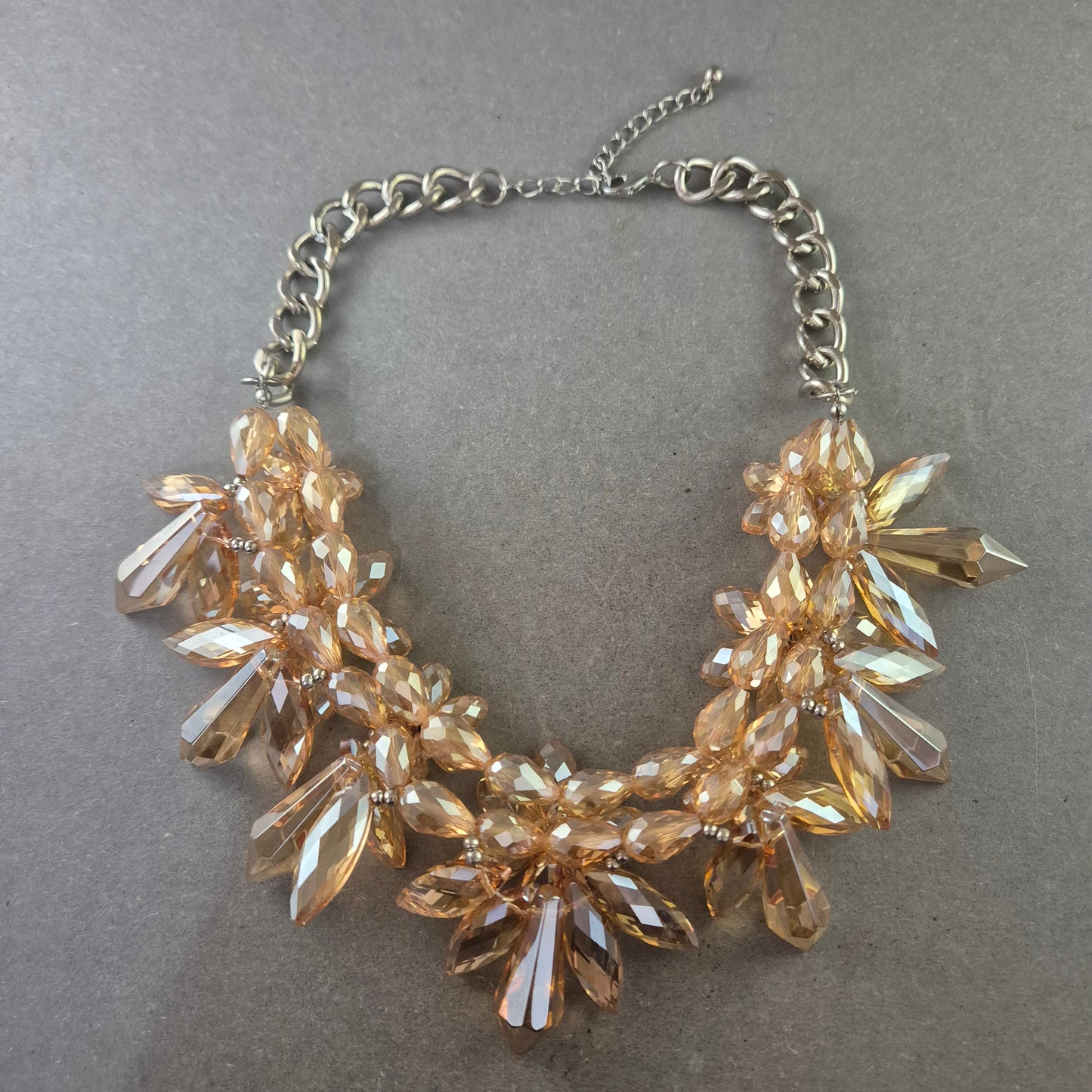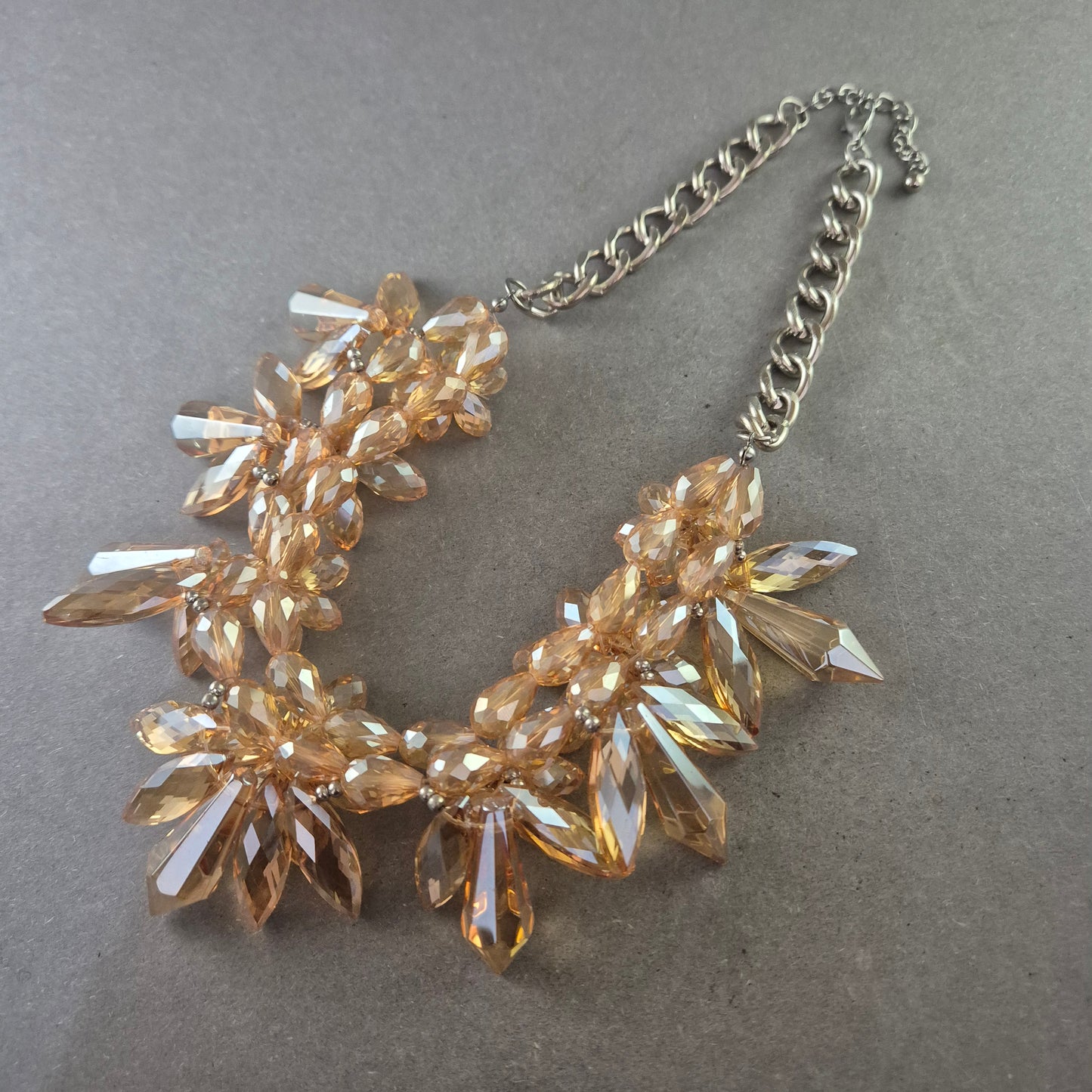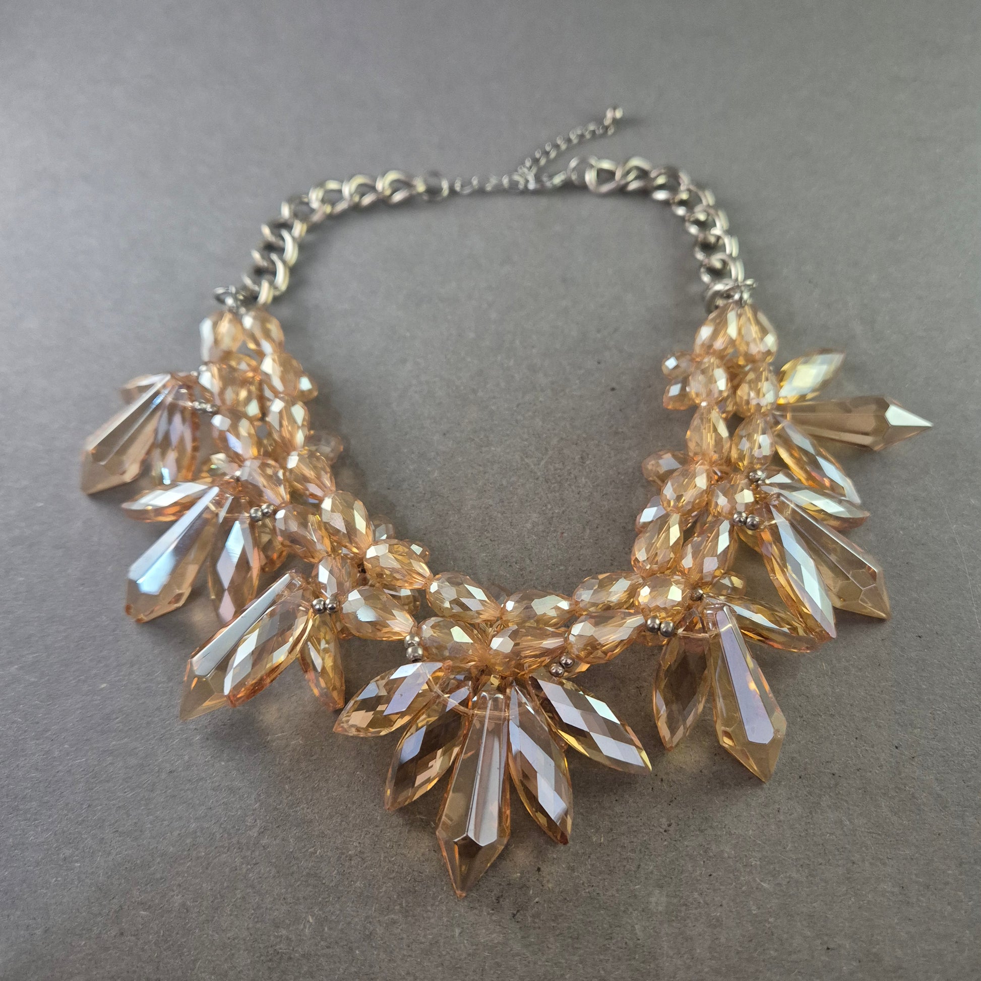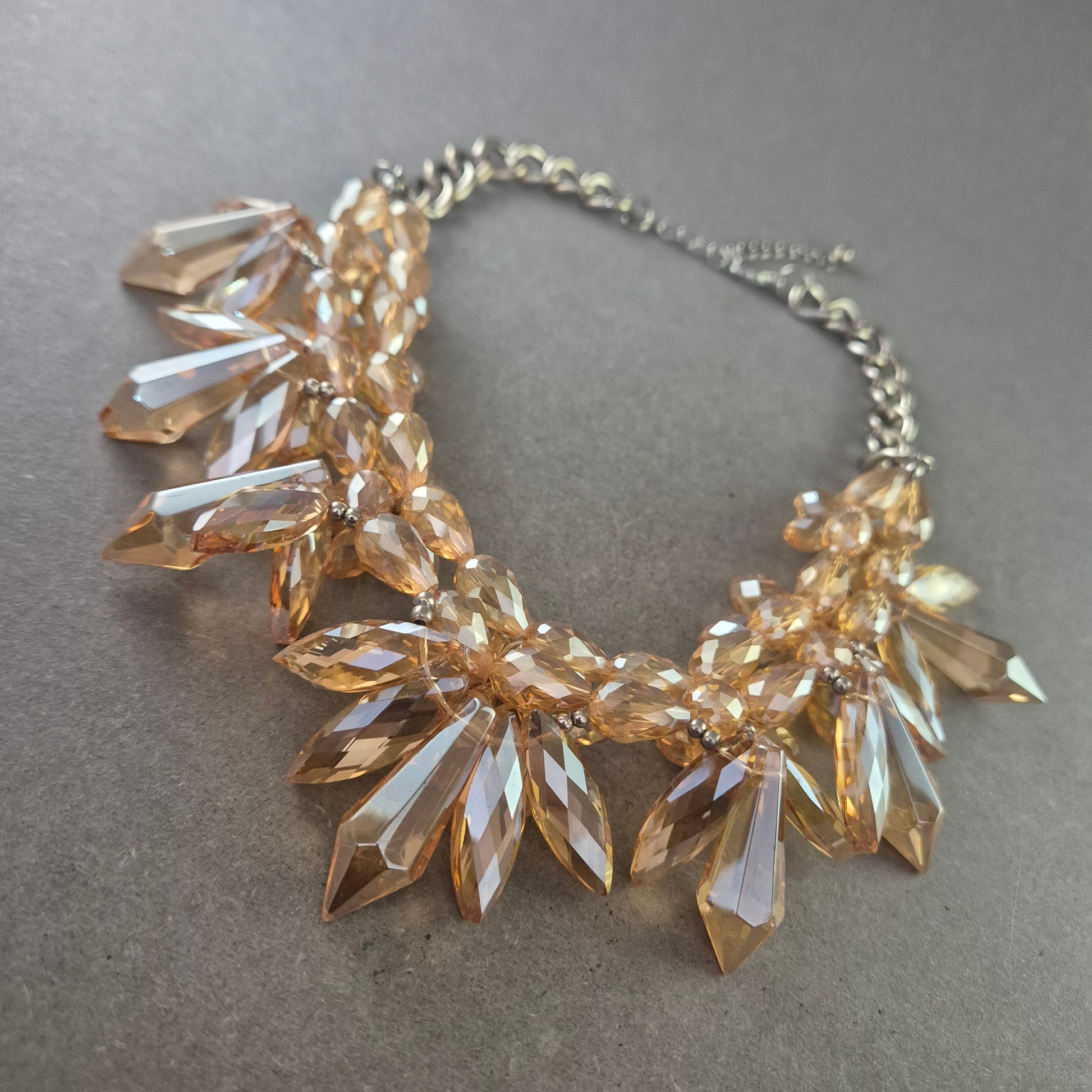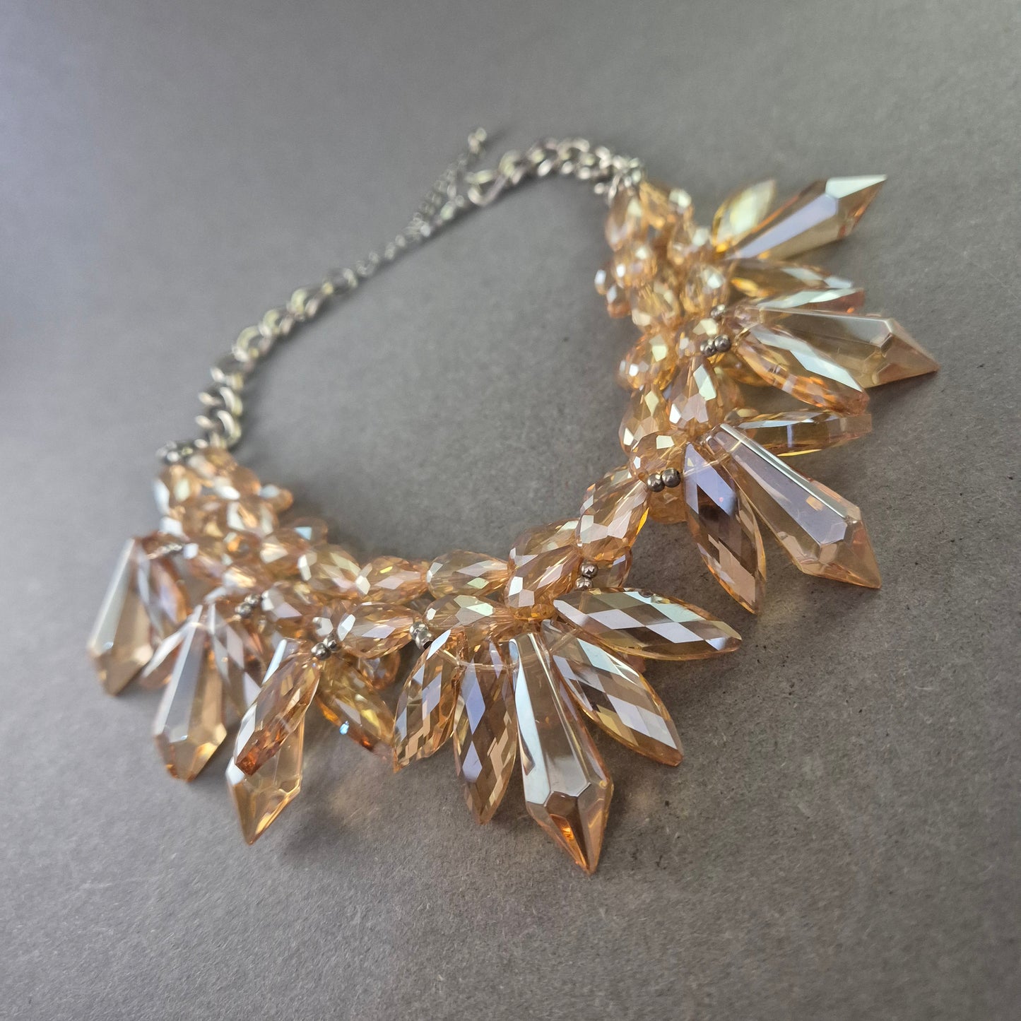 Diese beeindruckende Statement Kette ist ein echter Blickfang. Mit ihren facettierten, bernsteinfarbenen Acrylsteinen, die wie Kristalle funkeln, setzt sie glanzvolle Akzente zu jedem Outfit. Die massiven Elemente sind kunstvoll arrangiert und hängen an einer silberfarbenen Gliederkette mit Verlängerung. Ideal für festliche Anlässe oder um schlichte Outfits elegant aufzuwerten.
