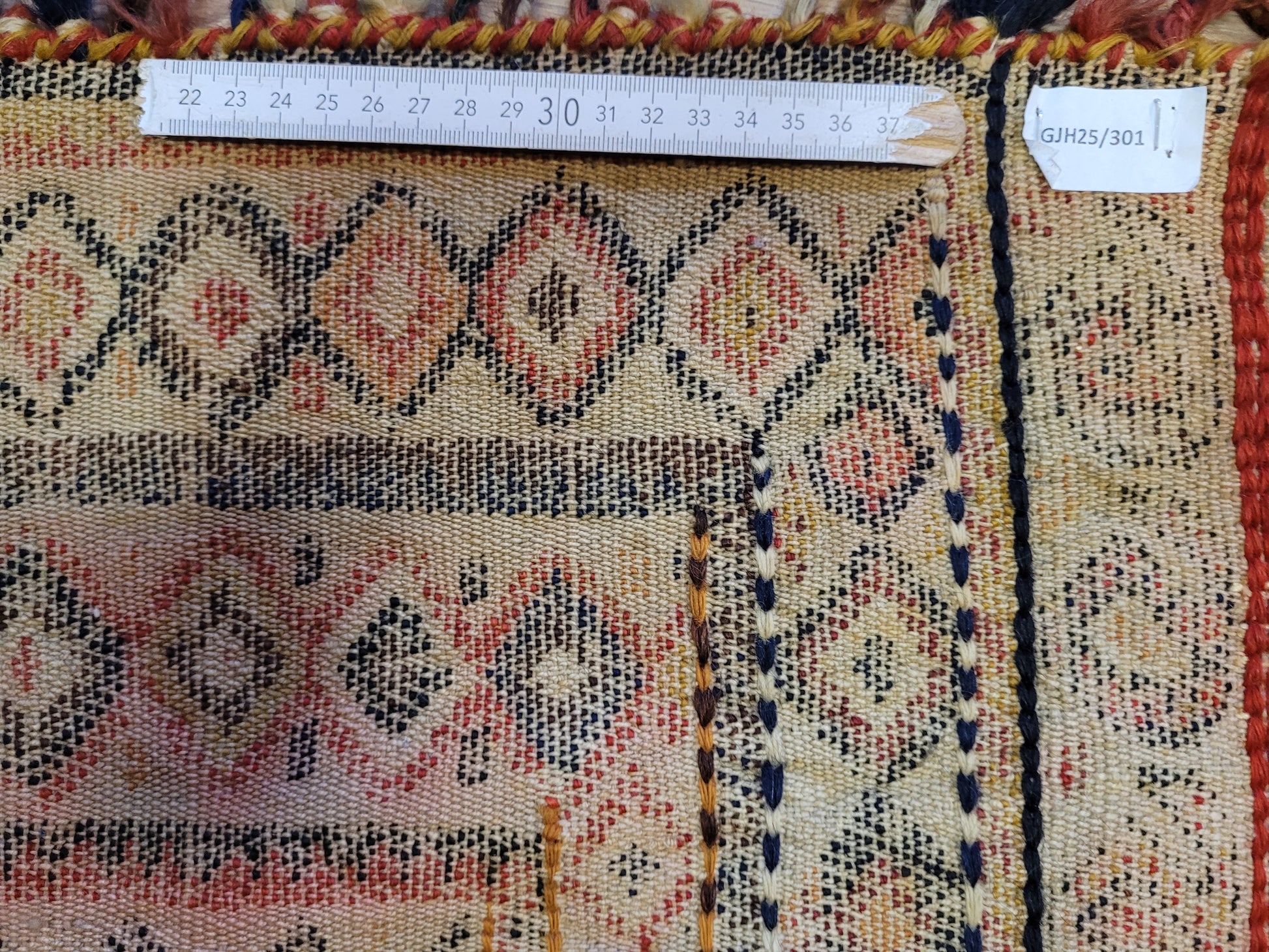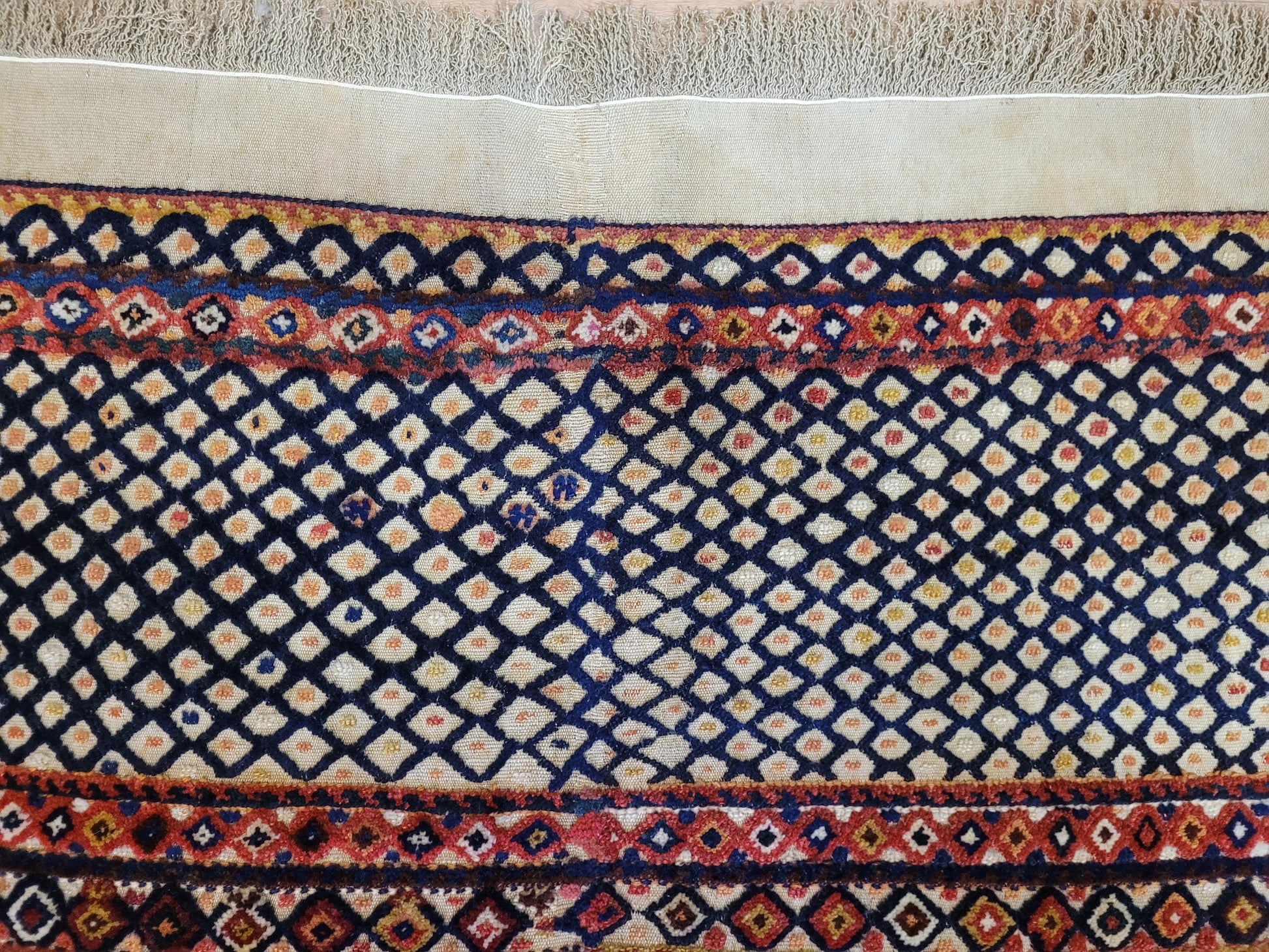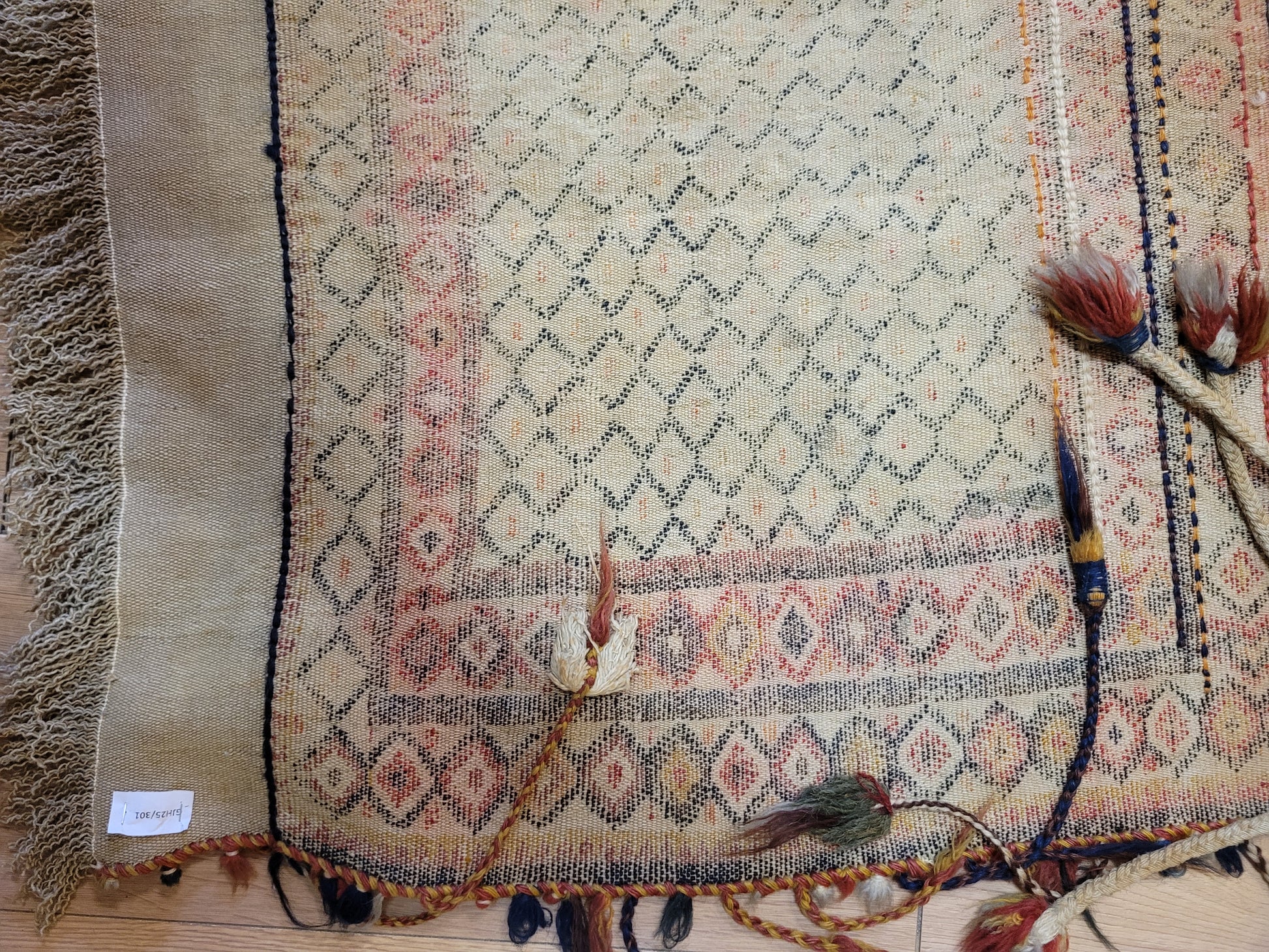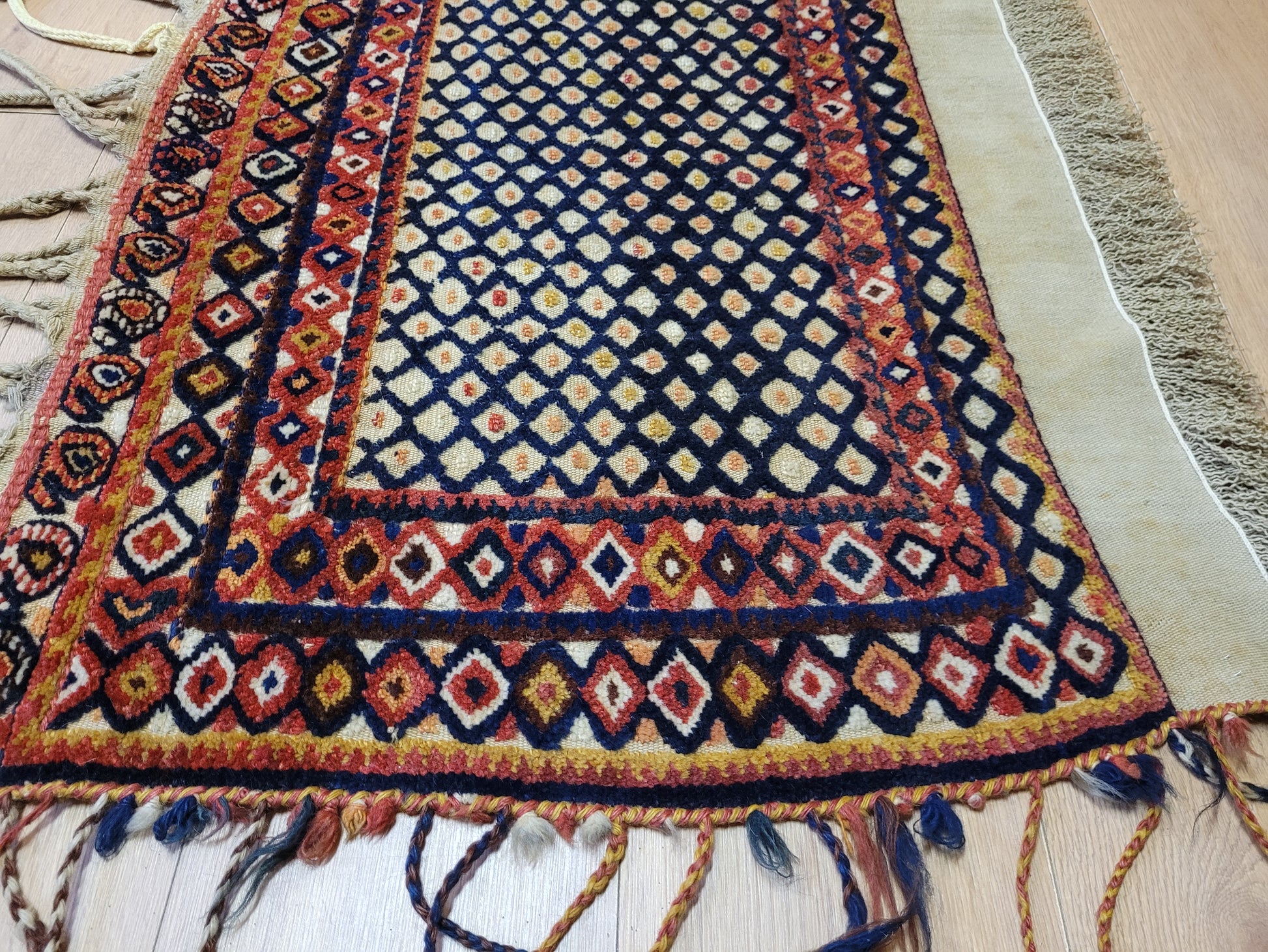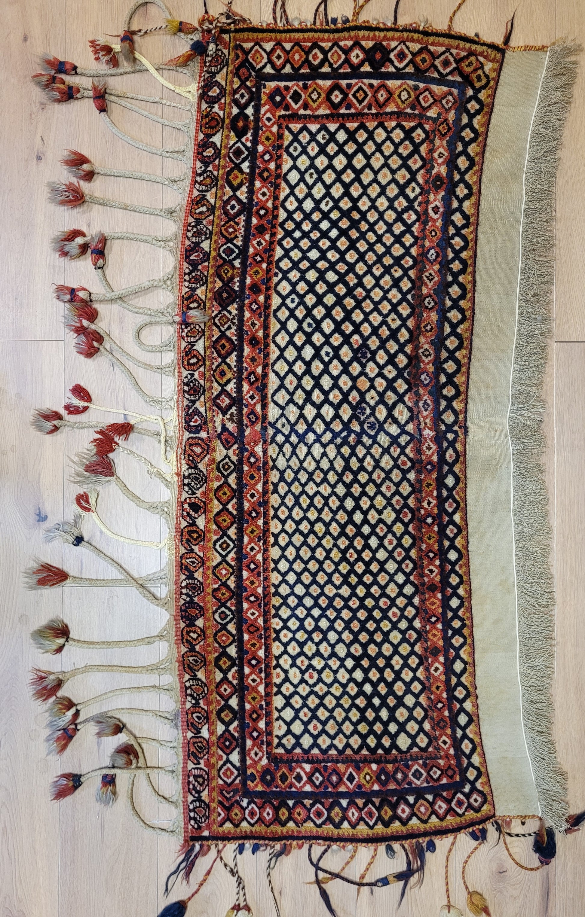 angeboten wird ein seltener antiker Bachtiar Zeltbehang der Lori-Nomaden, handgeknüpft in traditioneller Volkskunst. Dieses authentische Sammlerstück besticht durch sein charakteristisches Rautenmuster, kräftige Naturfarben und die typischen, kunstvoll verflochtenen Kordeln mit Quasten – Ausdruck nomadischer Handwerkskunst und dekorativer Symbolik.