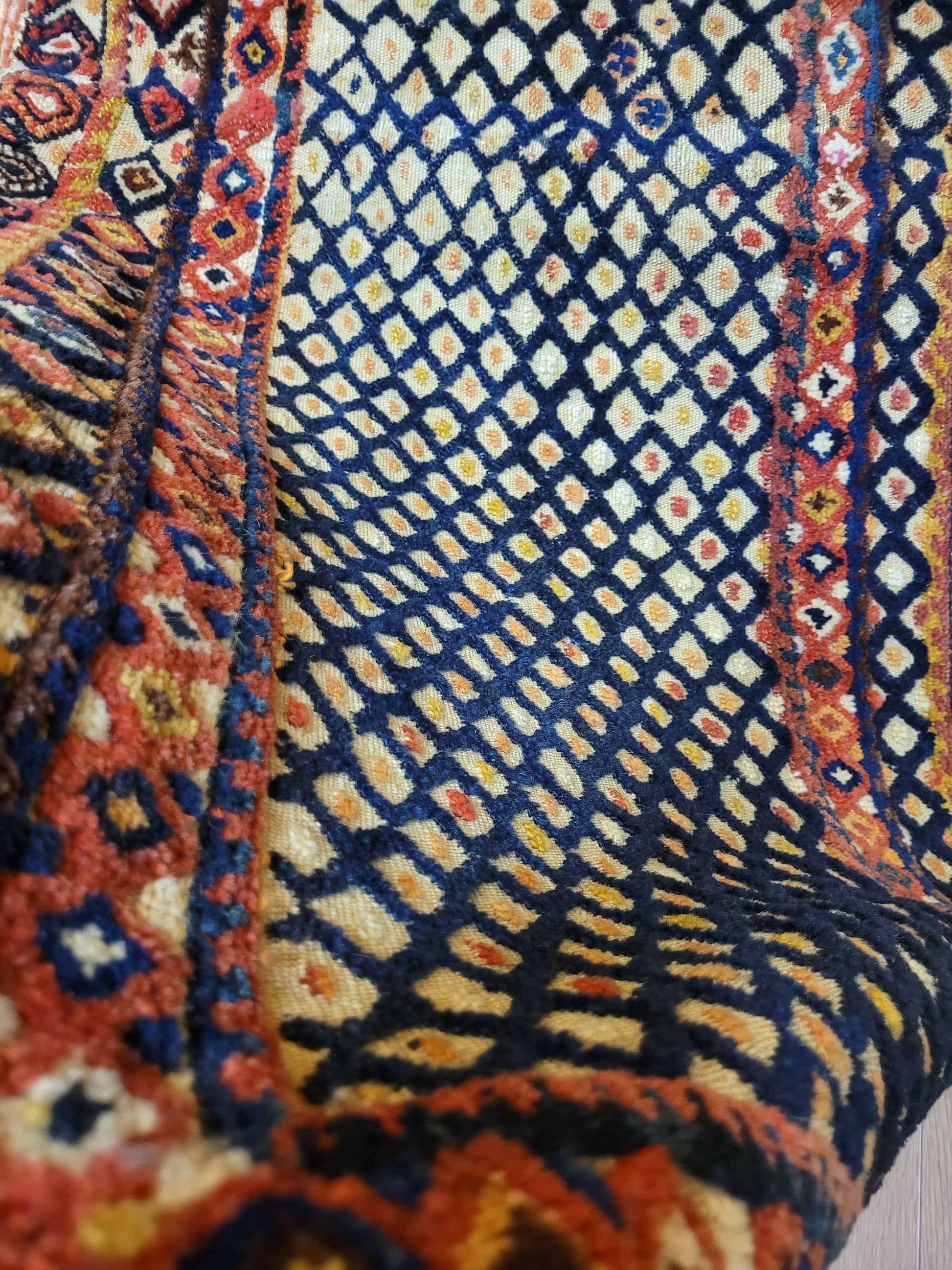 • Knüpfung: Grob bis mittelfein, typisch nomadisch, mit sichtbarer Struktur