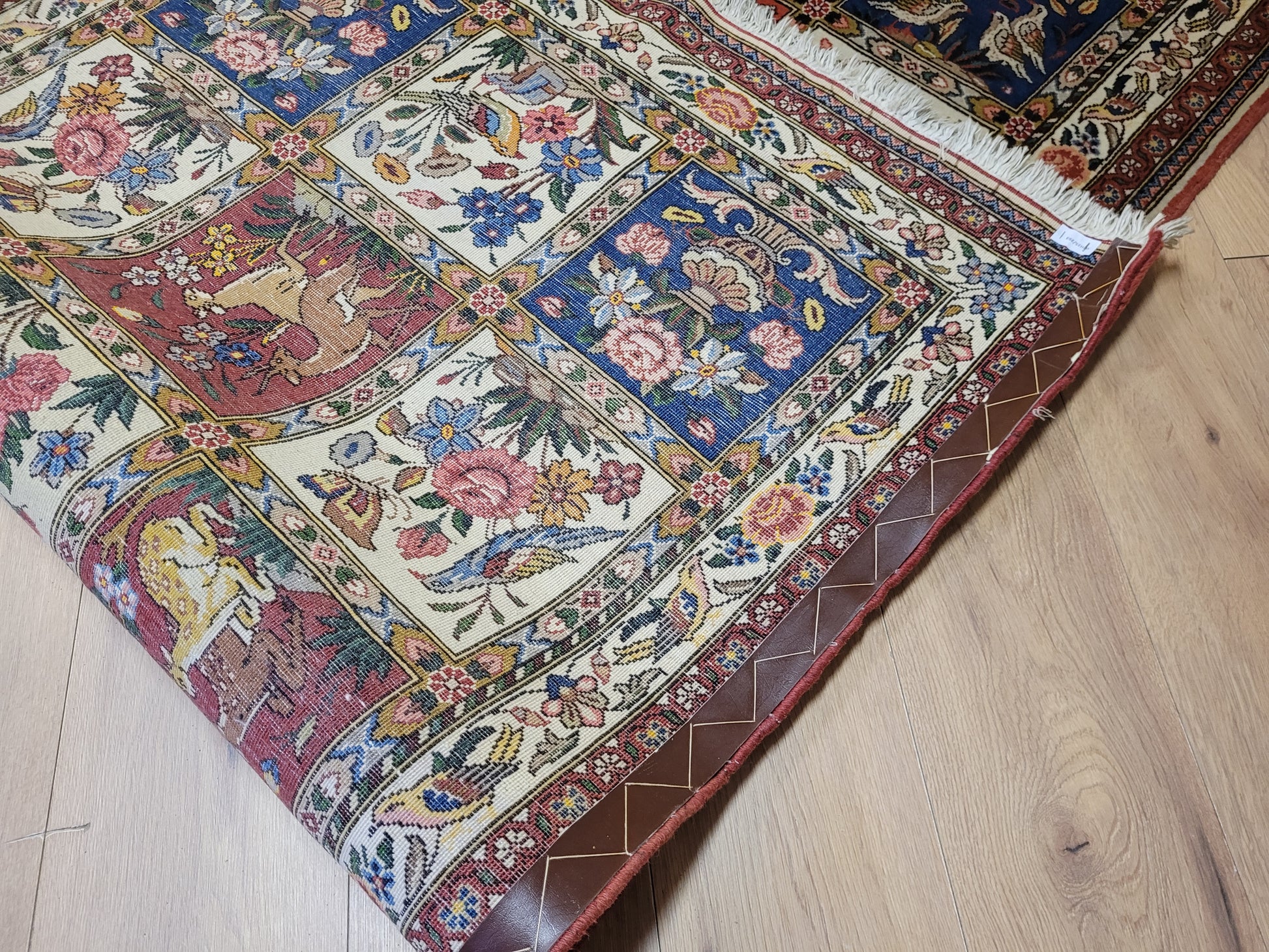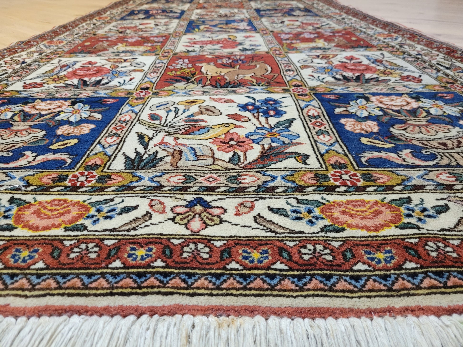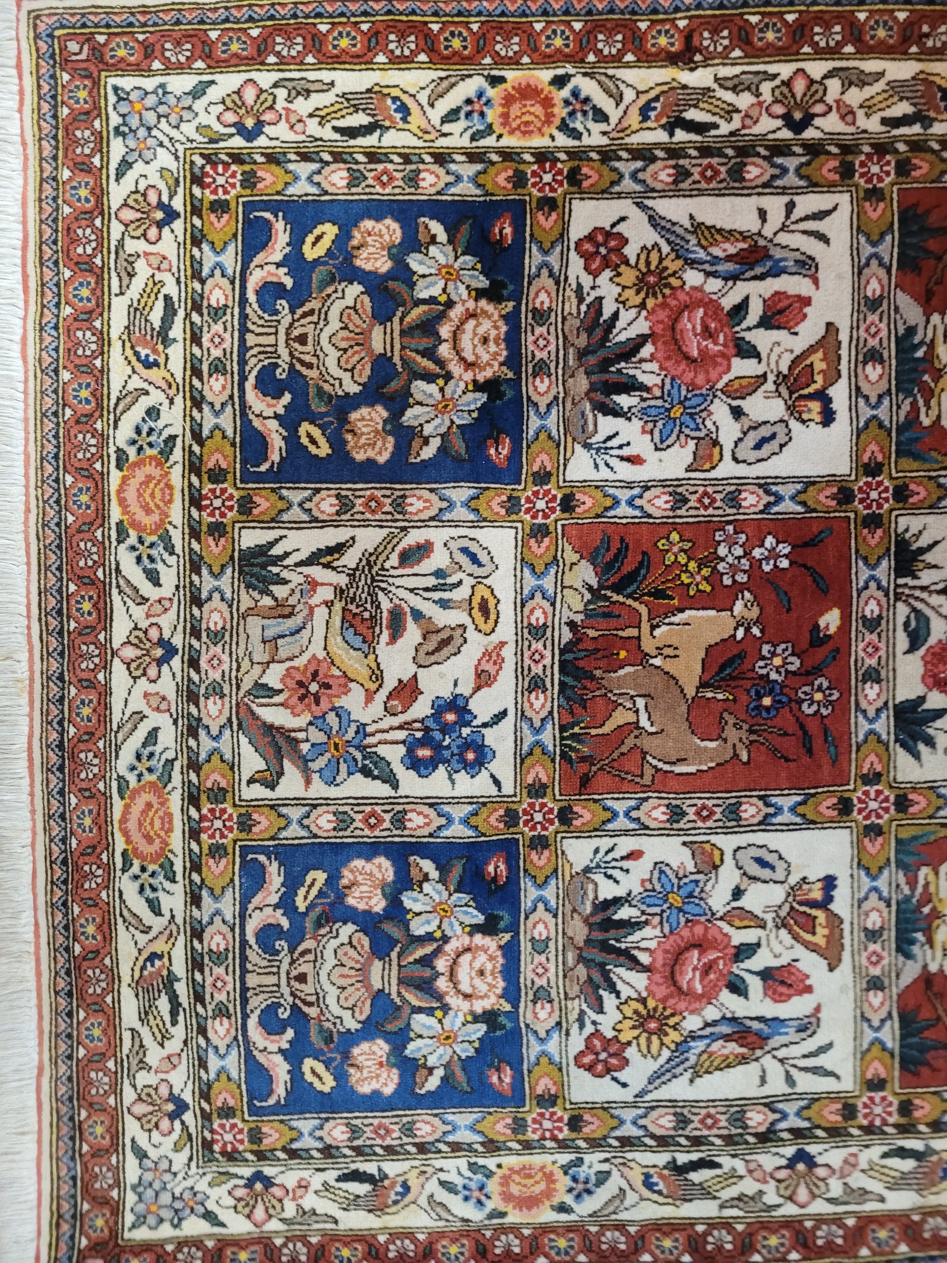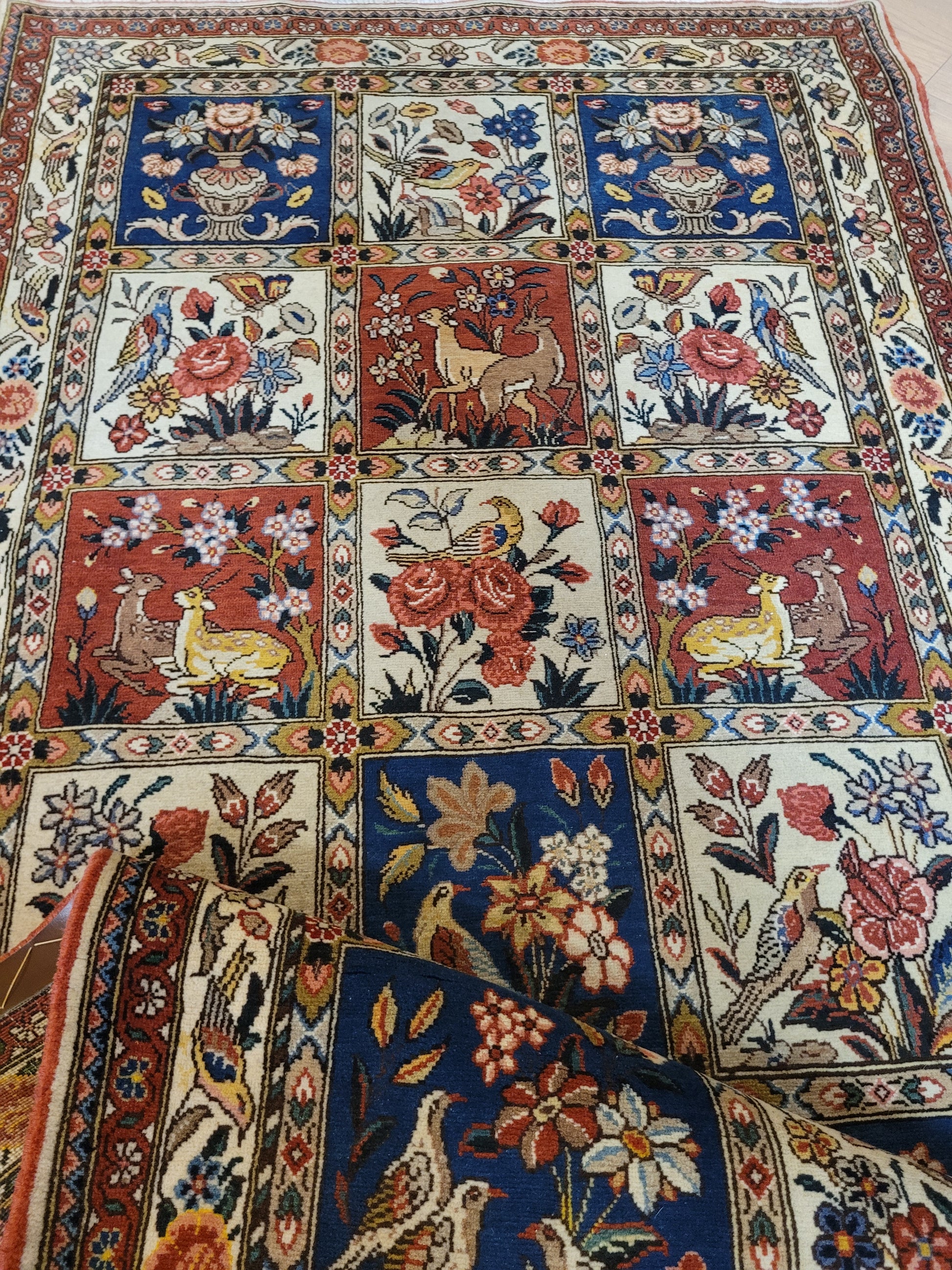 angeboten wird ein hochwertiger Bakhtiari Teppich aus feiner Korkwolle, handgeknüpft in klassischer Ausführung. Das Felderdesign zeigt eine reizvolle Komposition aus einzeln gestalteten Quadraten mit floralen und figürlichen Motiven – darunter Blumenvasen, Vögel und Gazellen. Diese harmonisch angeordneten Bildfelder sind farblich fein aufeinander abgestimmt und strahlen Eleganz und Lebendigkeit aus.