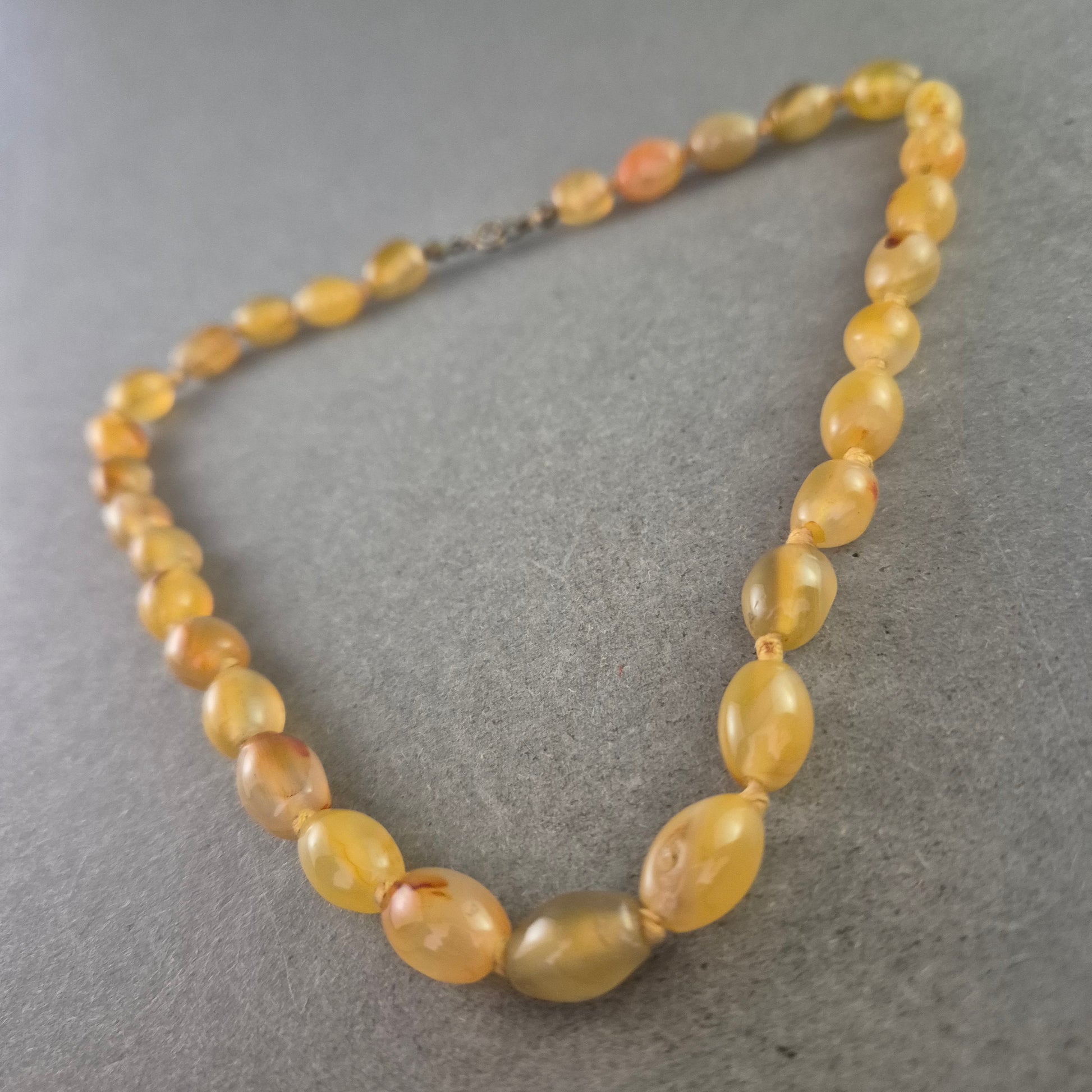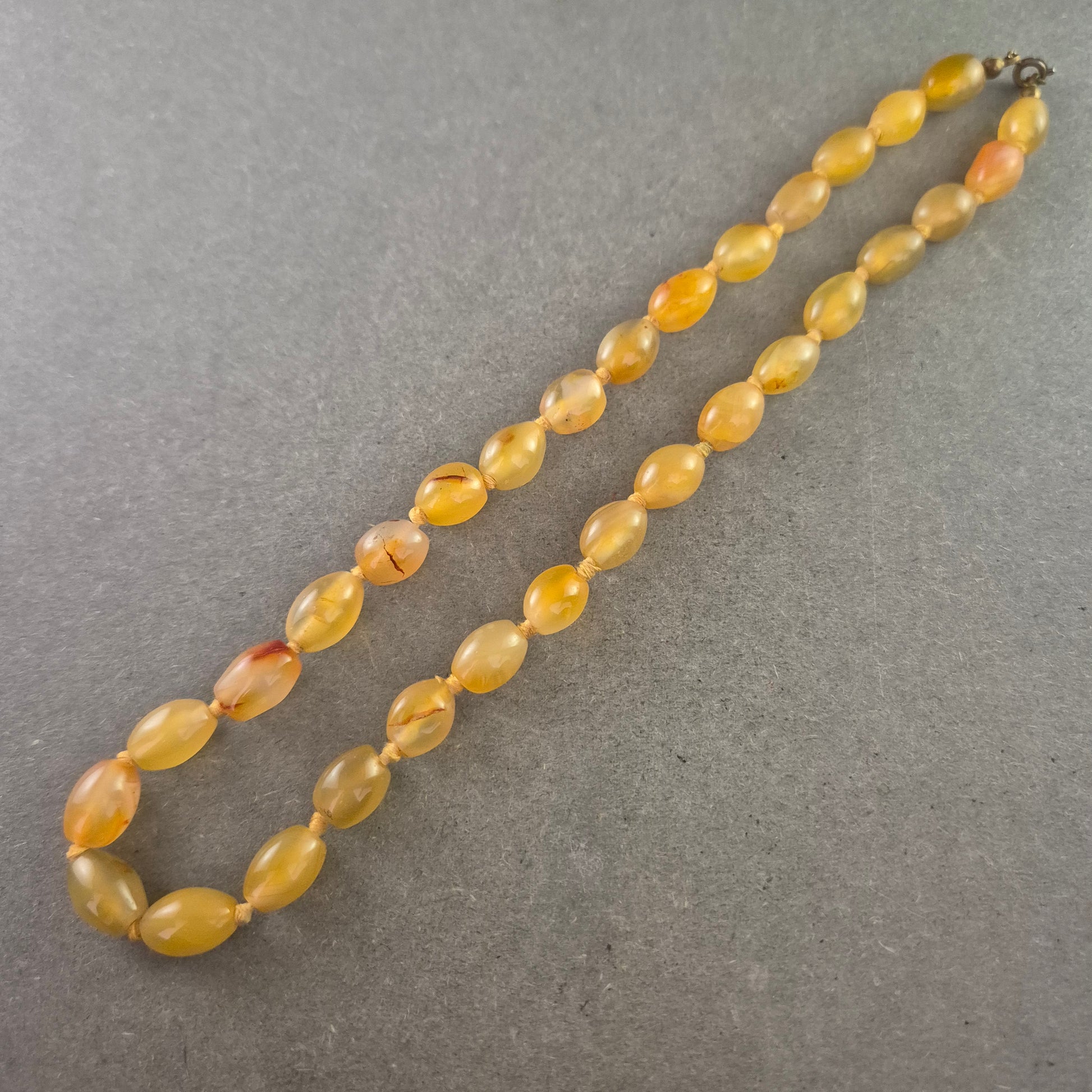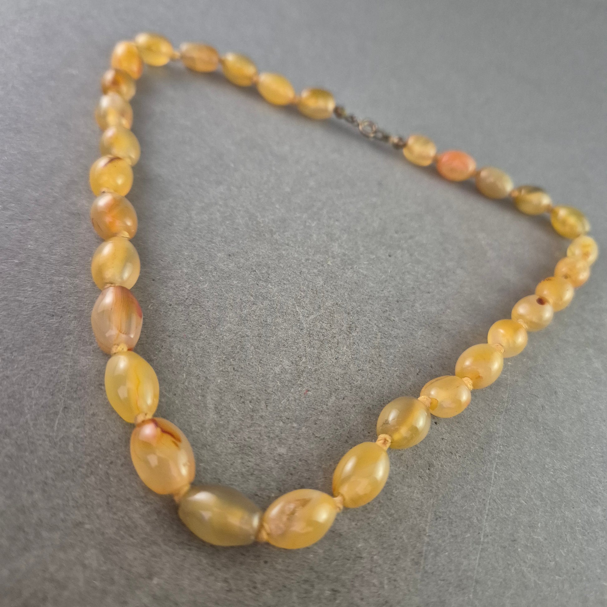 Diese charmante Halskette besteht aus oval geschliffenen Achatsteinen in warmen Gelb- bis Bernsteintönen. Der sanfte Glanz und die feine Musterung der Steine verleihen dem Schmuckstück eine natürliche Eleganz. Mit ihrem zurückhaltenden Vintage-Stil ist sie ein stilvoller Begleiter für Alltag und besondere Momente.