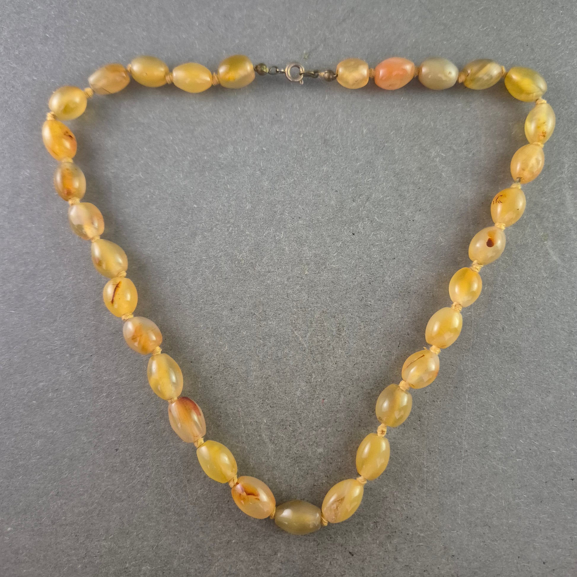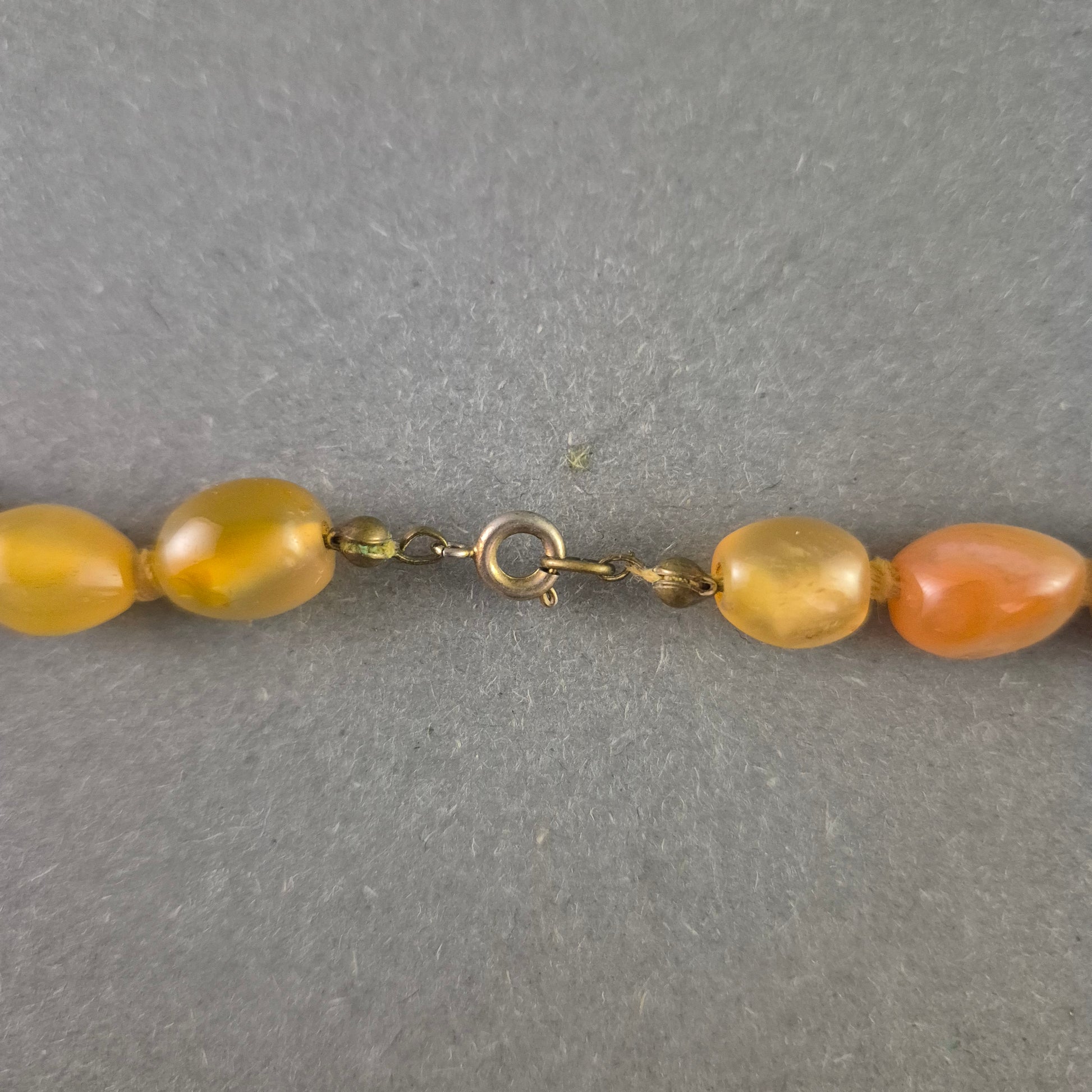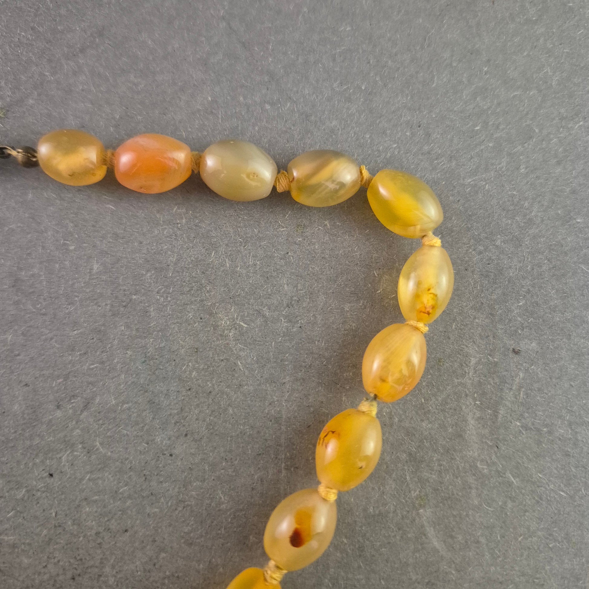Diese charmante Halskette besteht aus oval geschliffenen Achatsteinen in warmen Gelb- bis Bernsteintönen. Der sanfte Glanz und die feine Musterung der Steine verleihen dem Schmuckstück eine natürliche Eleganz. Mit ihrem zurückhaltenden Vintage-Stil ist sie ein stilvoller Begleiter für Alltag und besondere Momente.