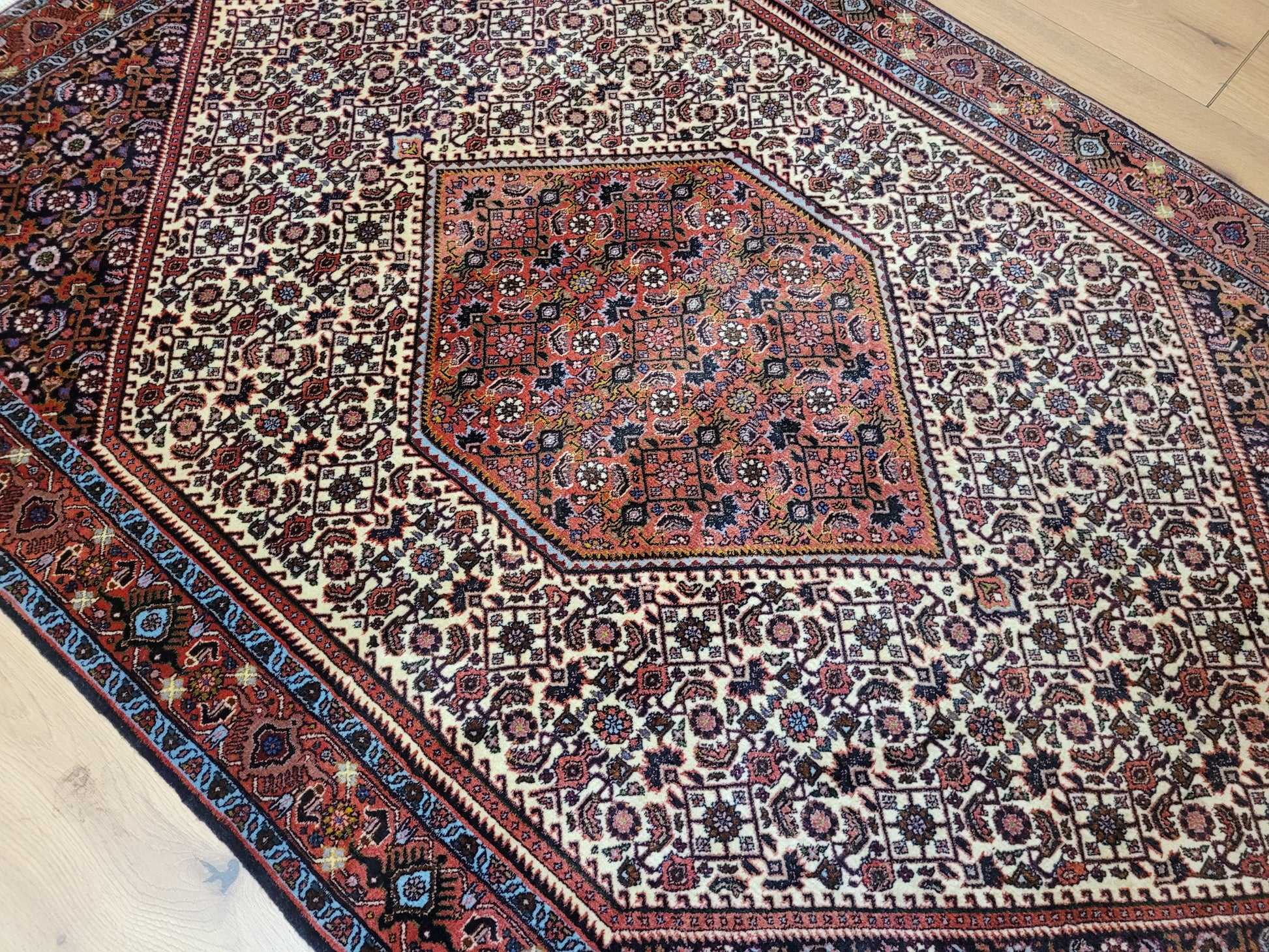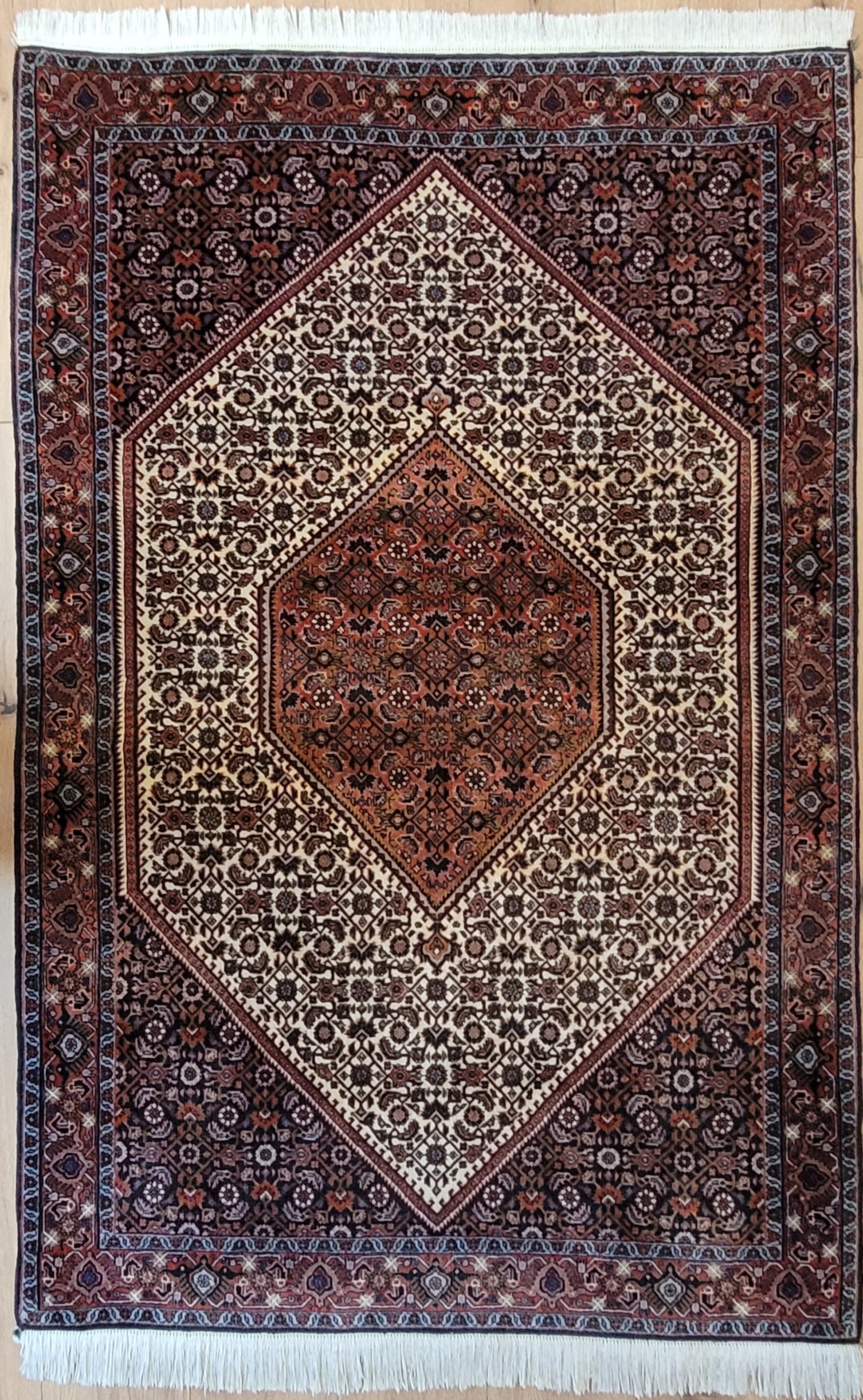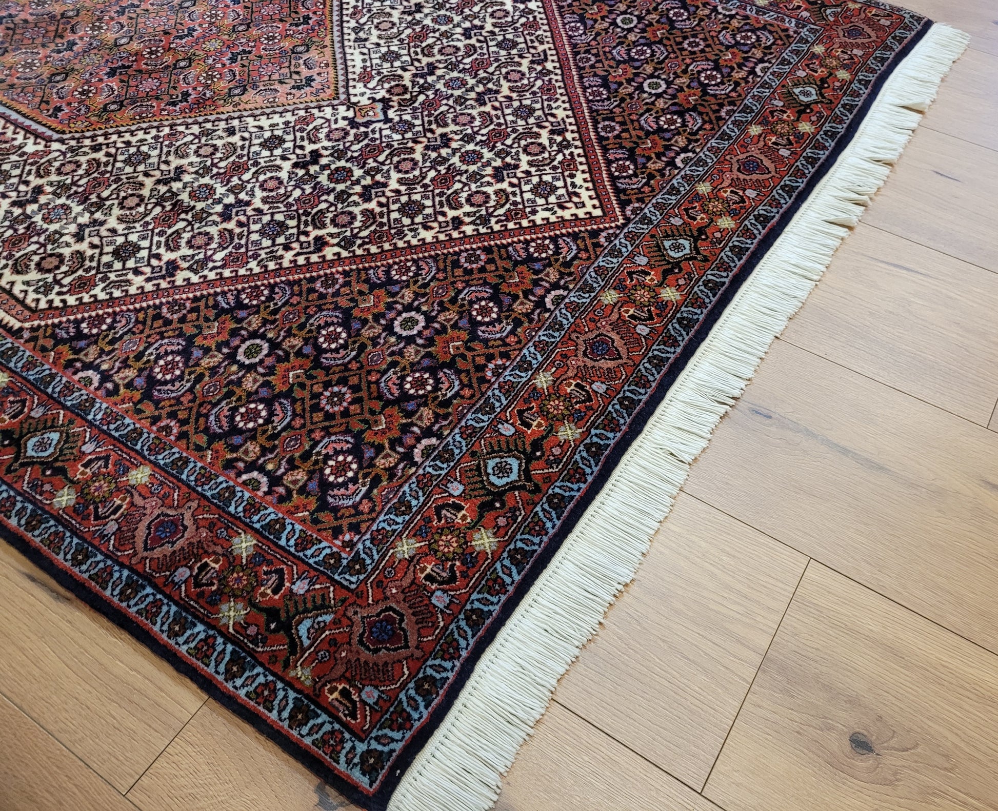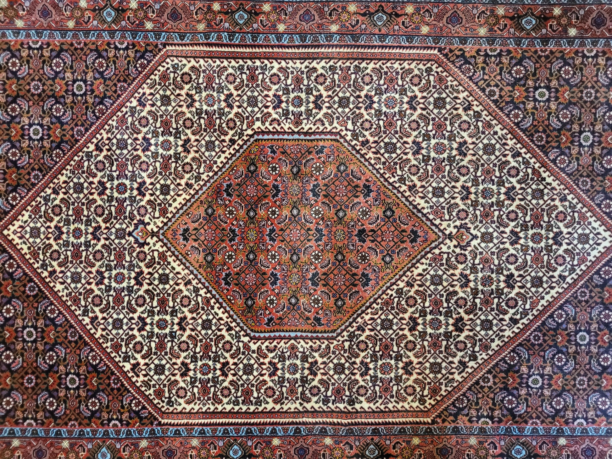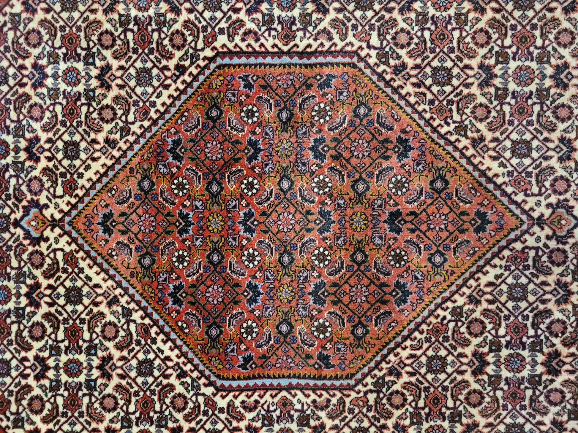 angeboten wird ein klassischer Bidjar Teppich aus feiner Korkwolle, handgeknüpft in dichter und strapazierfähiger Knüpfung. Das Teppichfeld wird von einem großen, mehrfach geschichteten Rautenmedaillon dominiert, das von einem detailreichen Fond mit floralen Mustern umgeben ist. Die hellen Kontrastflächen im Zentrum betonen die klare Struktur dieses zeitlosen Designs.