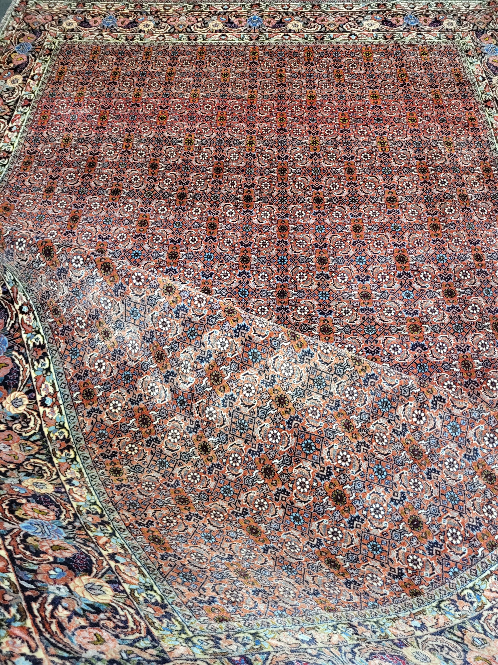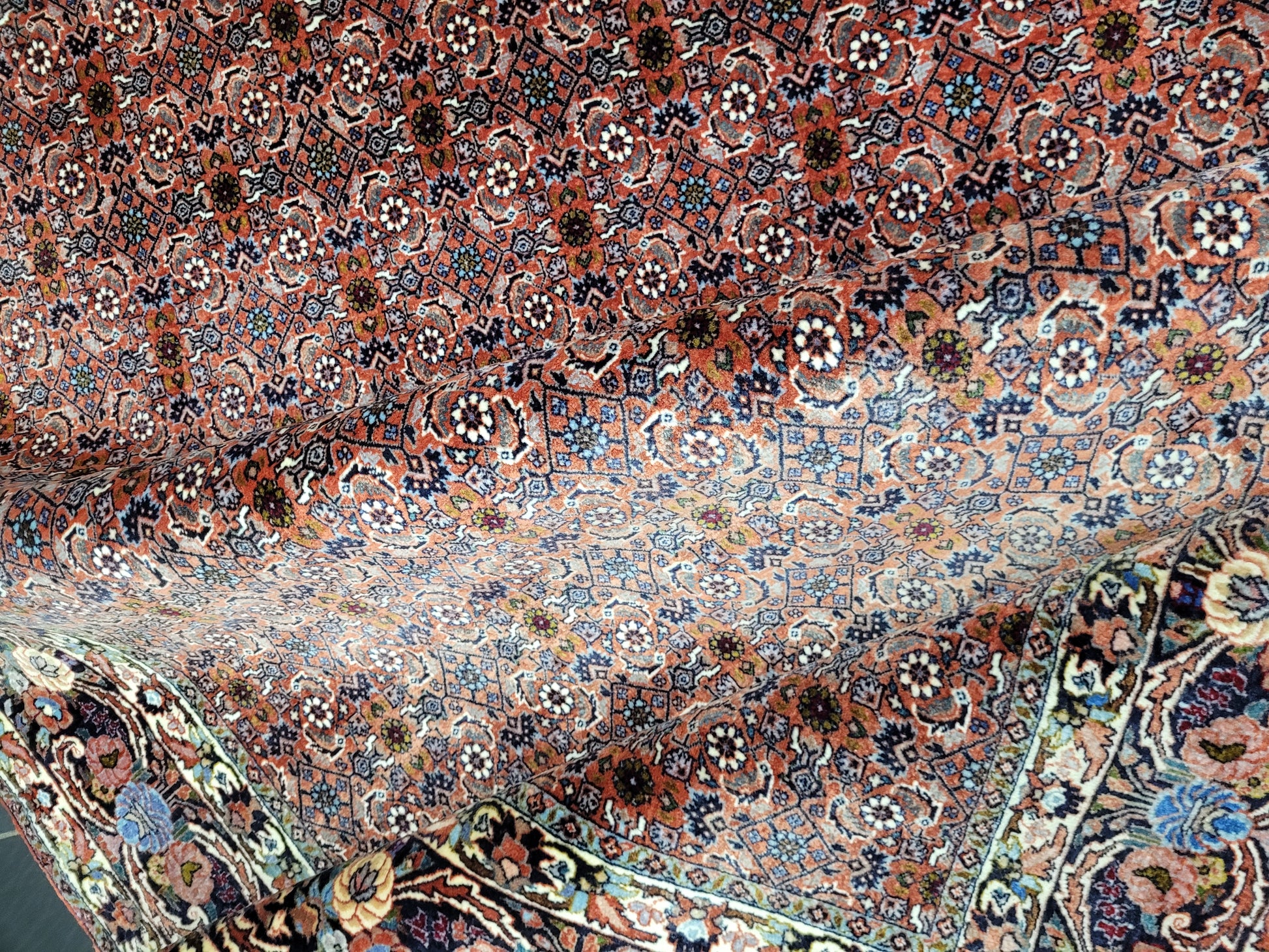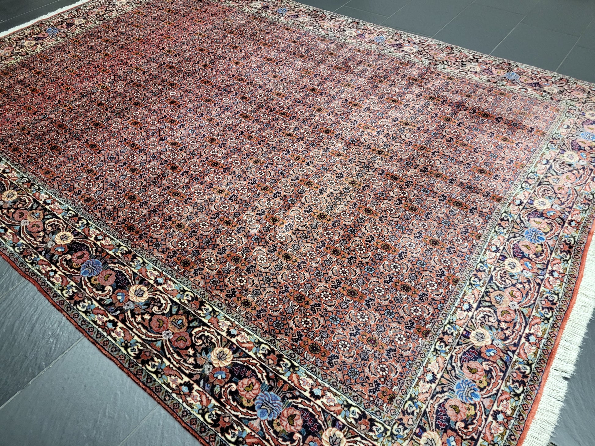 angeboten wird ein edler Bidjar Teppich aus hochwertiger Korkwolle, handgeknüpft in besonders dichter und widerstandsfähiger Knüpfkunst. Dieses Meisterstück beeindruckt durch sein harmonisches Allover-Muster mit feinen Blütenrosetten und geometrischen Elementen, die in präziser Regelmäßigkeit über das gesamte Feld verteilt sind.