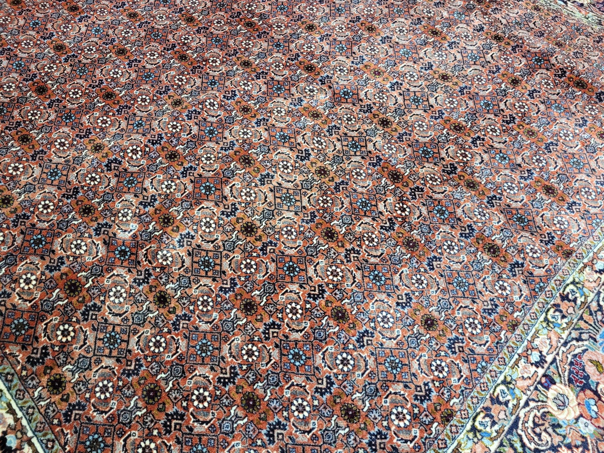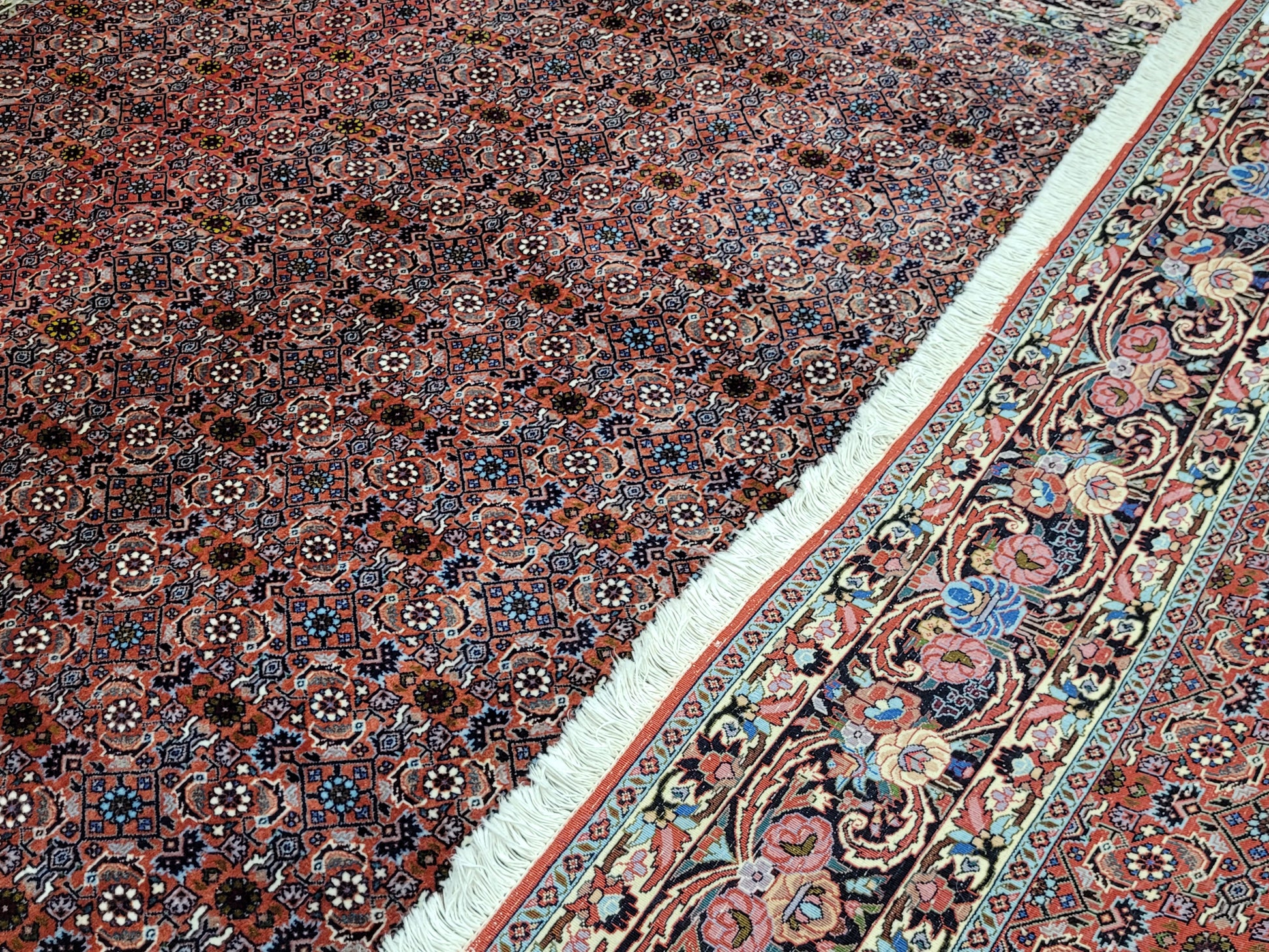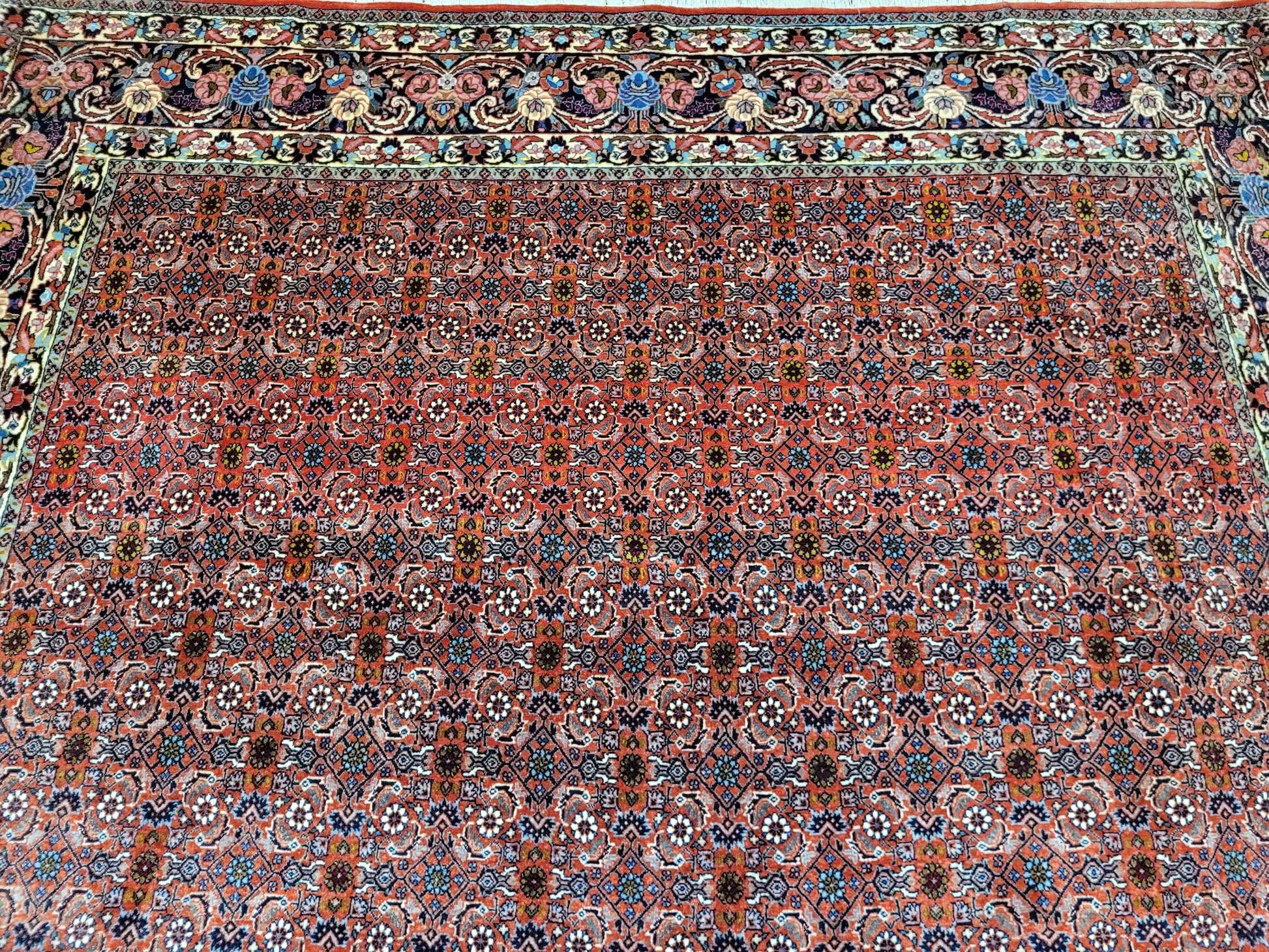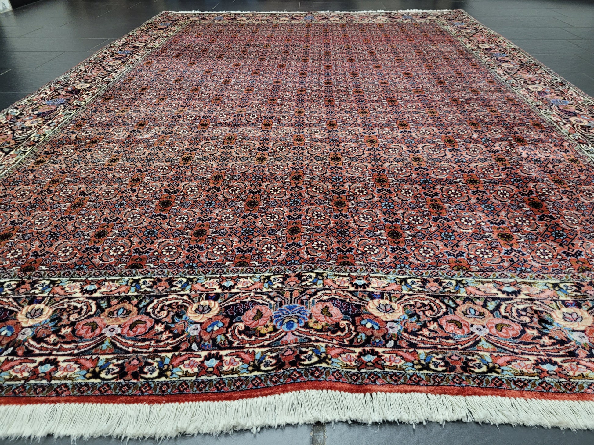 angeboten wird ein edler Bidjar Teppich aus hochwertiger Korkwolle, handgeknüpft in besonders dichter und widerstandsfähiger Knüpfkunst. Dieses Meisterstück beeindruckt durch sein harmonisches Allover-Muster mit feinen Blütenrosetten und geometrischen Elementen, die in präziser Regelmäßigkeit über das gesamte Feld verteilt sind.