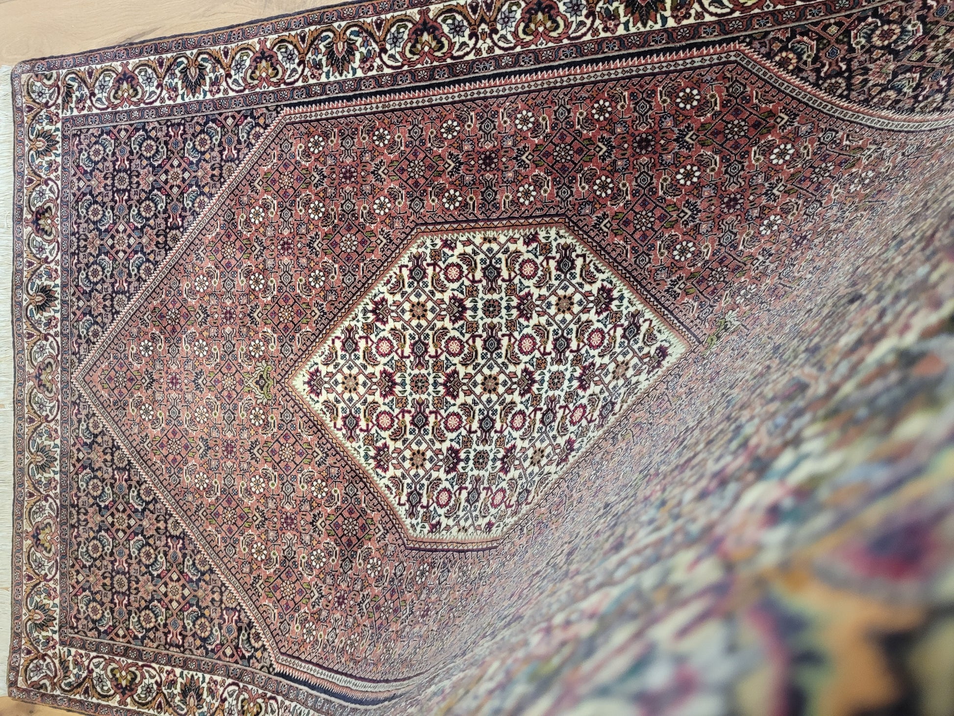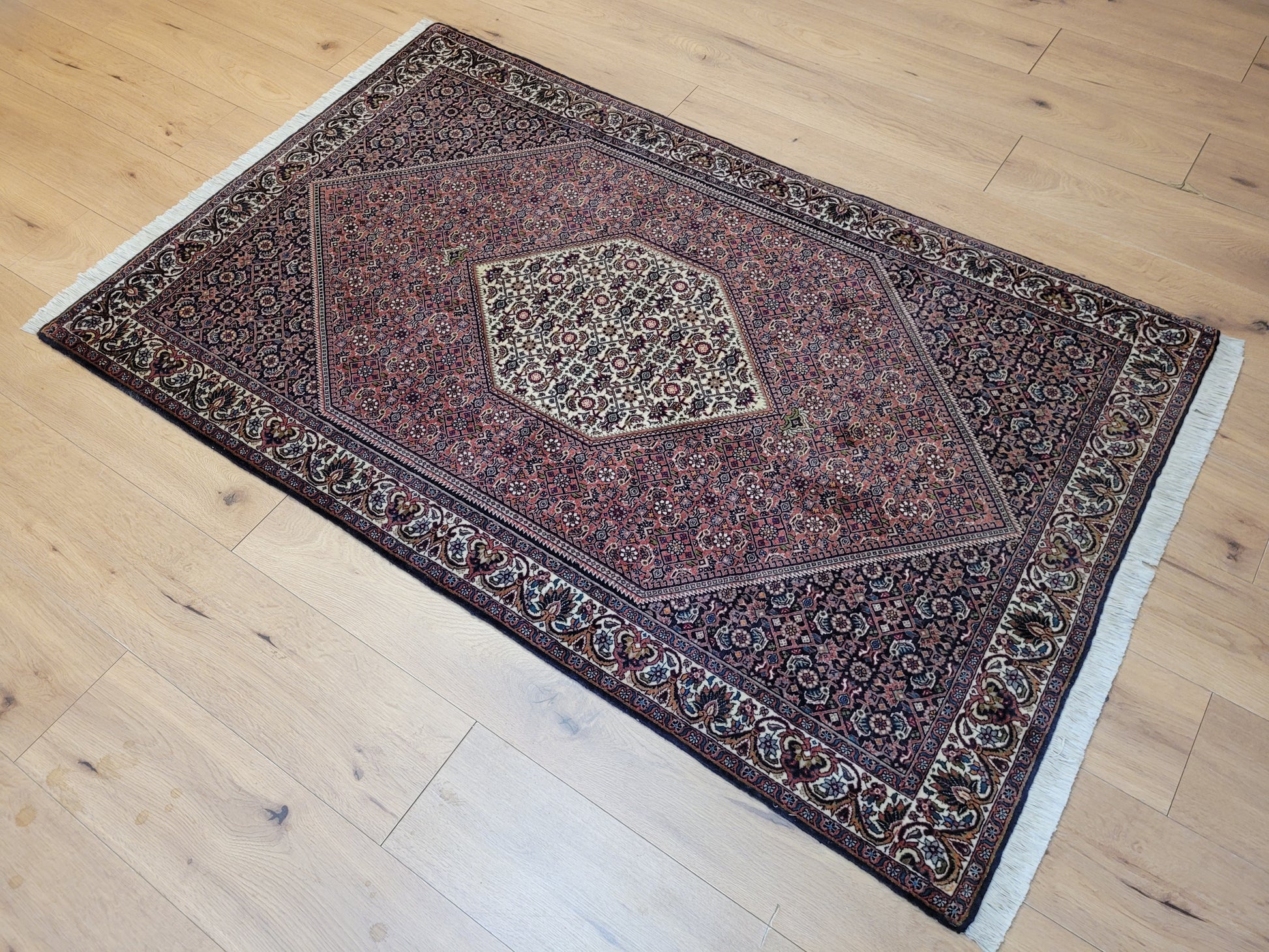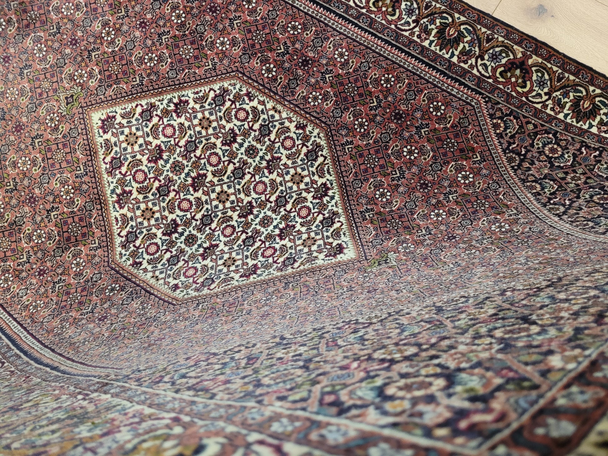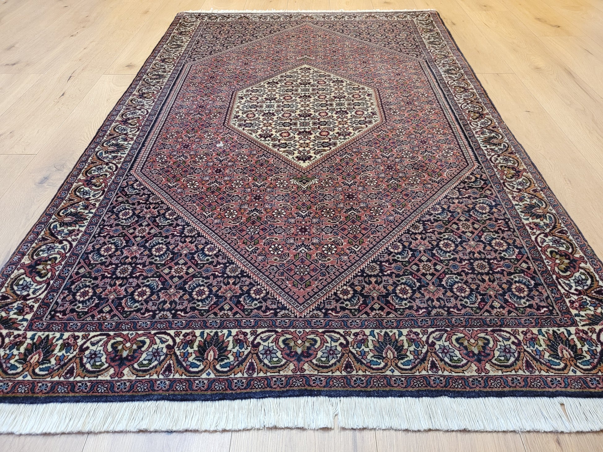 angeboten wird ein charaktervoller Bidjar Teppich aus reiner Wolle, handgeknüpft in äußerst dichter Knüpfung. Das Design besticht durch ein zentrales sechseckiges Medaillon auf hellem Fond, eingefasst in ein fein gemustertes rotes Feld mit floralen Details und geometrischen Ornamenten. Die kräftige Bordüre mit Palmetten- und Blütenmotiven verleiht dem Teppich eine markante Rahmung.