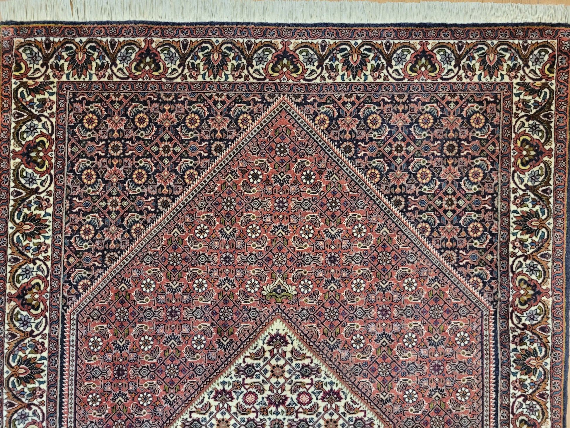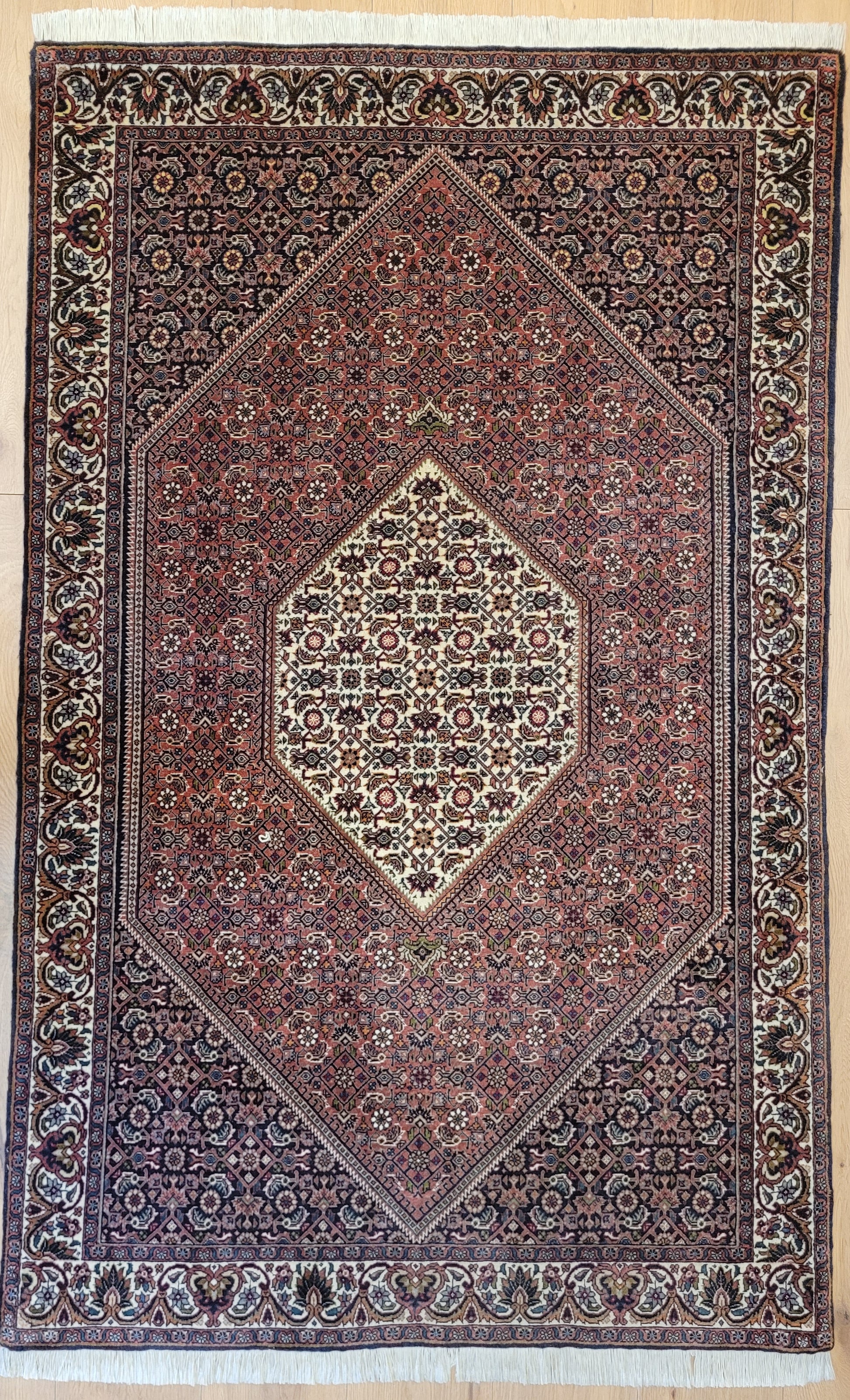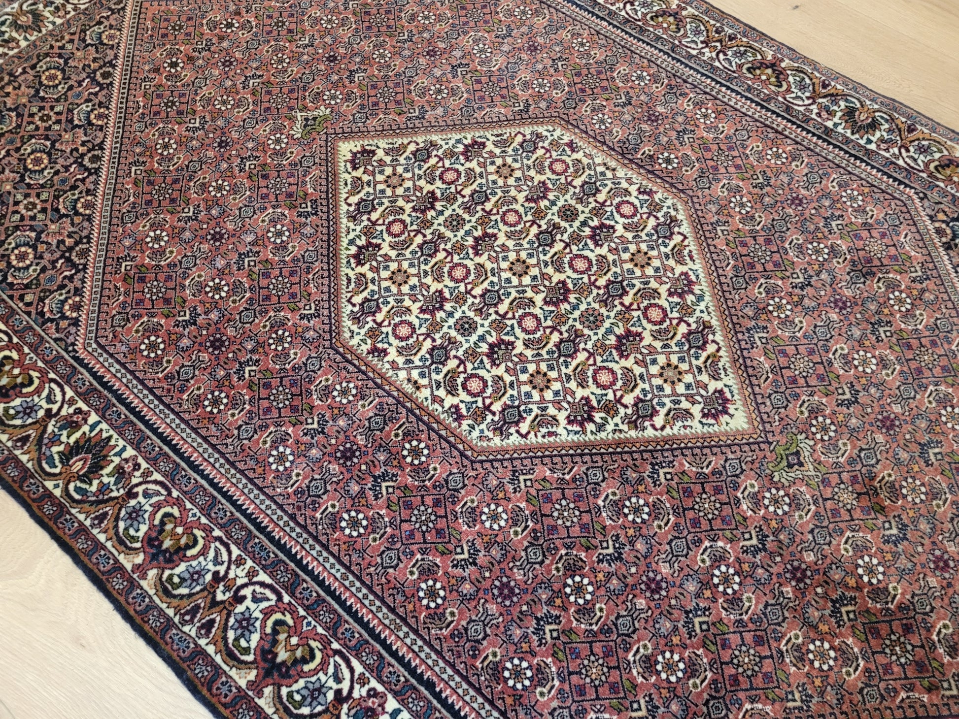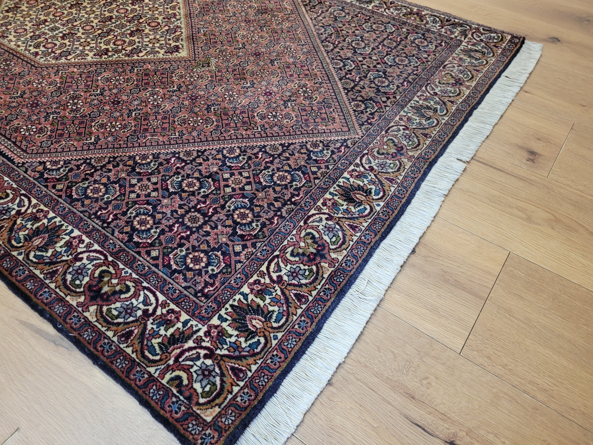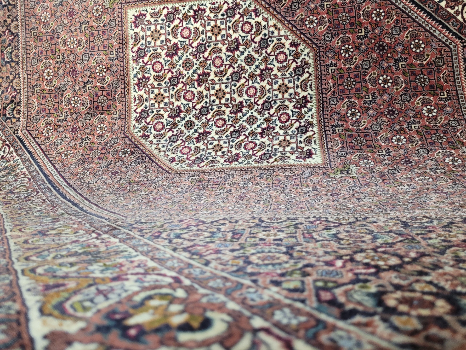angeboten wird ein charaktervoller Bidjar Teppich aus reiner Wolle, handgeknüpft in äußerst dichter Knüpfung. Das Design besticht durch ein zentrales sechseckiges Medaillon auf hellem Fond, eingefasst in ein fein gemustertes rotes Feld mit floralen Details und geometrischen Ornamenten. Die kräftige Bordüre mit Palmetten- und Blütenmotiven verleiht dem Teppich eine markante Rahmung.