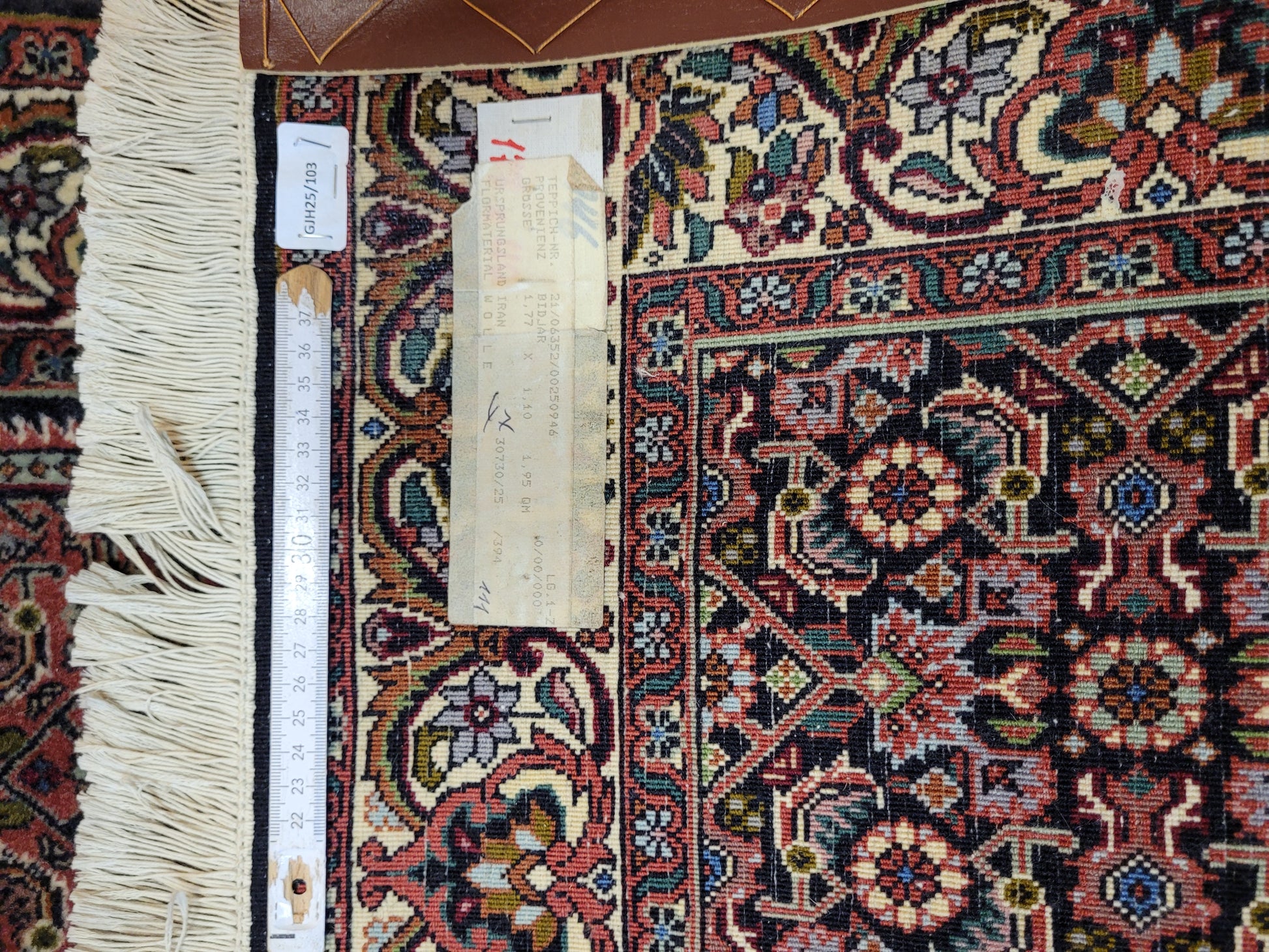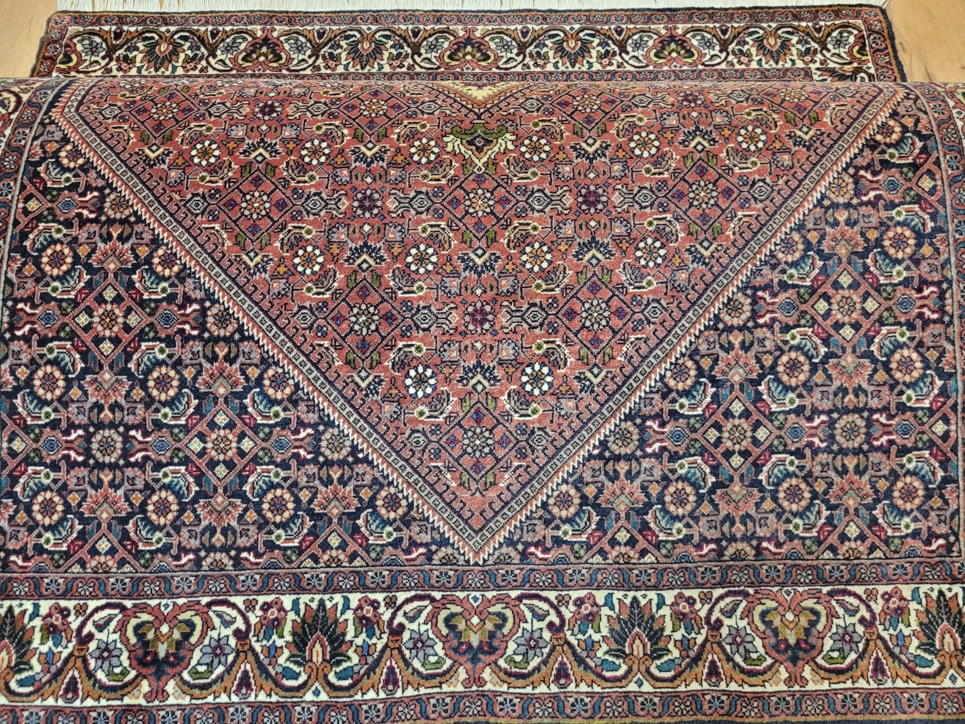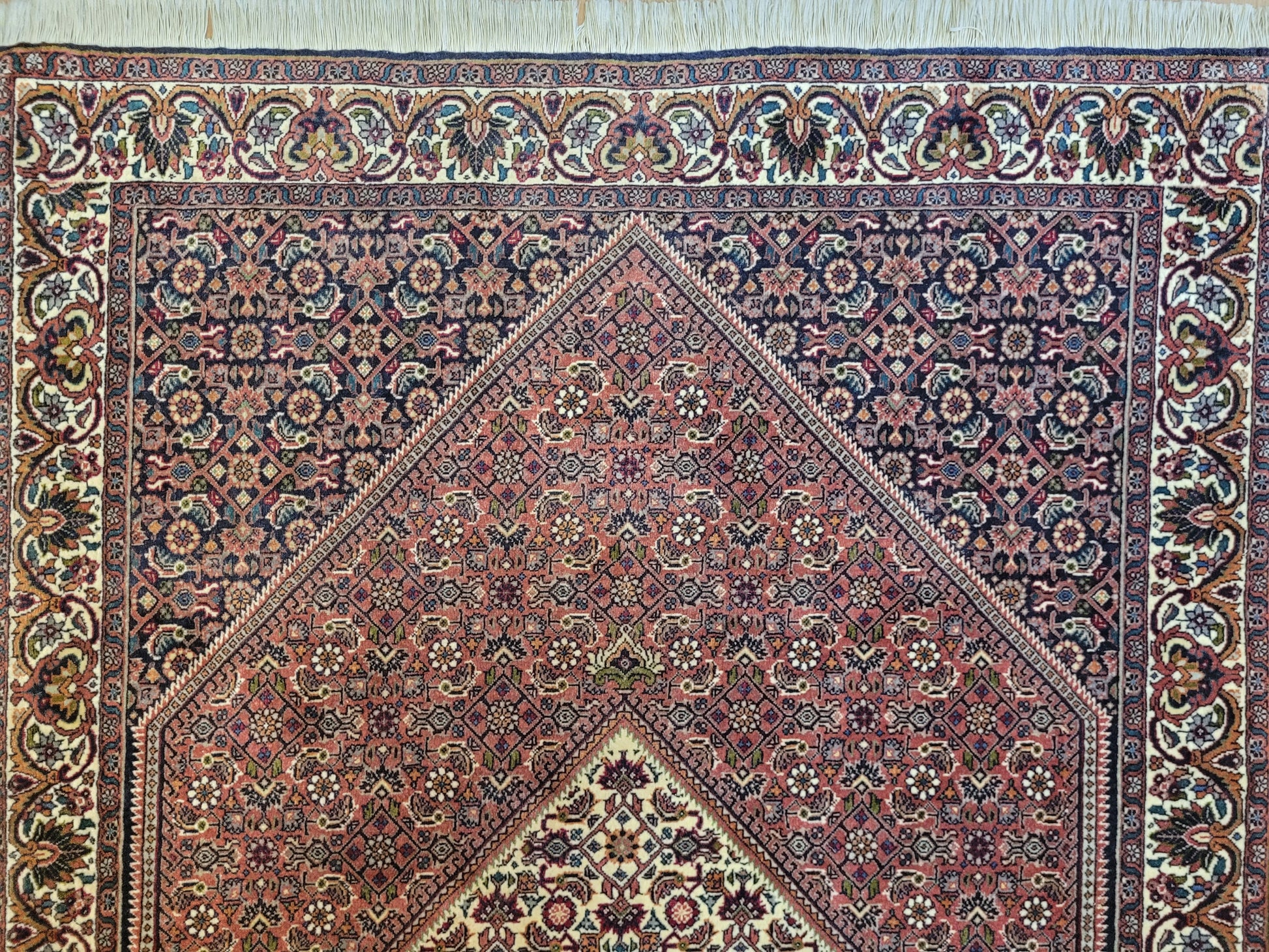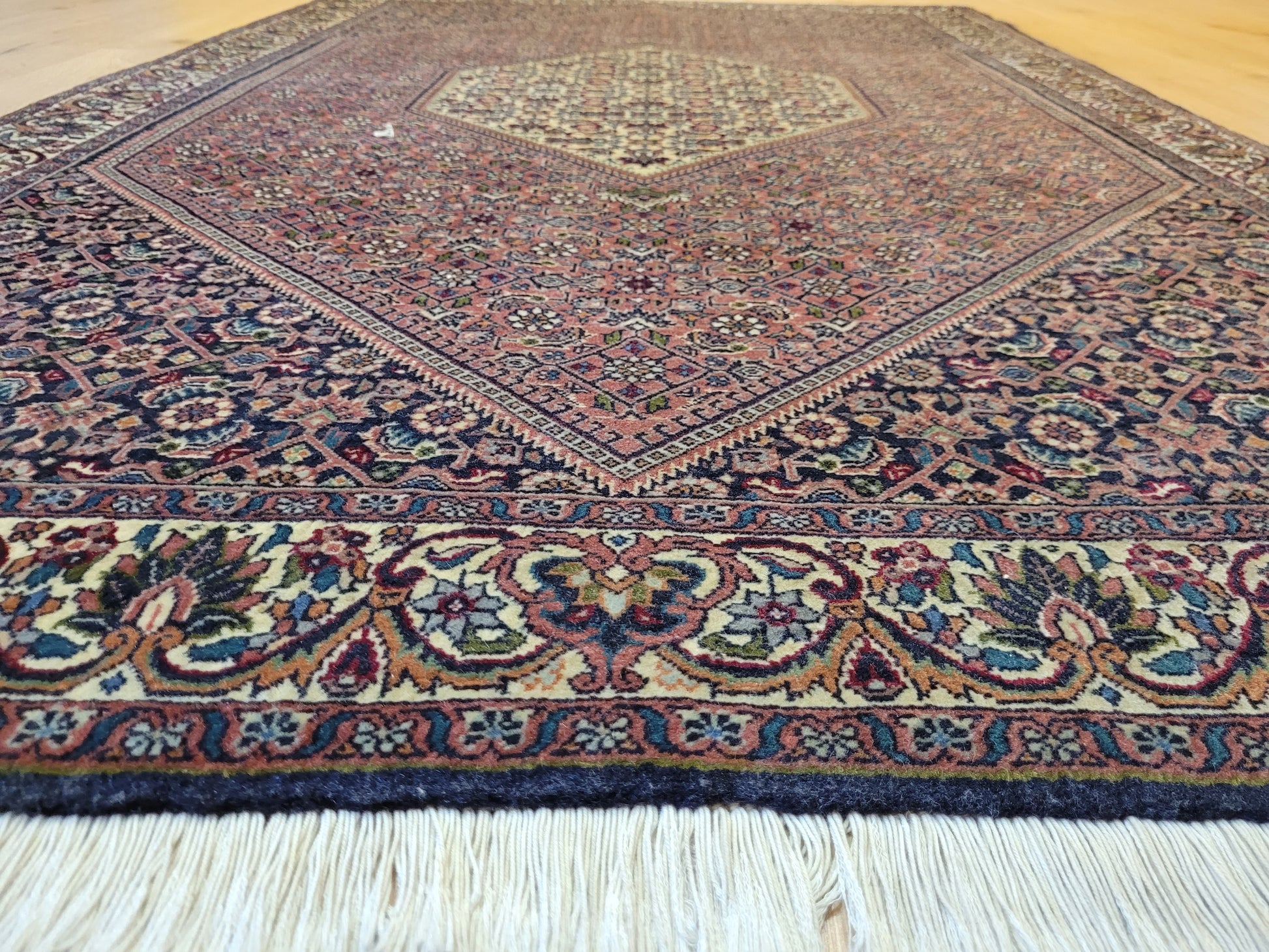 angeboten wird ein charaktervoller Bidjar Teppich aus reiner Wolle, handgeknüpft in äußerst dichter Knüpfung. Das Design besticht durch ein zentrales sechseckiges Medaillon auf hellem Fond, eingefasst in ein fein gemustertes rotes Feld mit floralen Details und geometrischen Ornamenten. Die kräftige Bordüre mit Palmetten- und Blütenmotiven verleiht dem Teppich eine markante Rahmung.