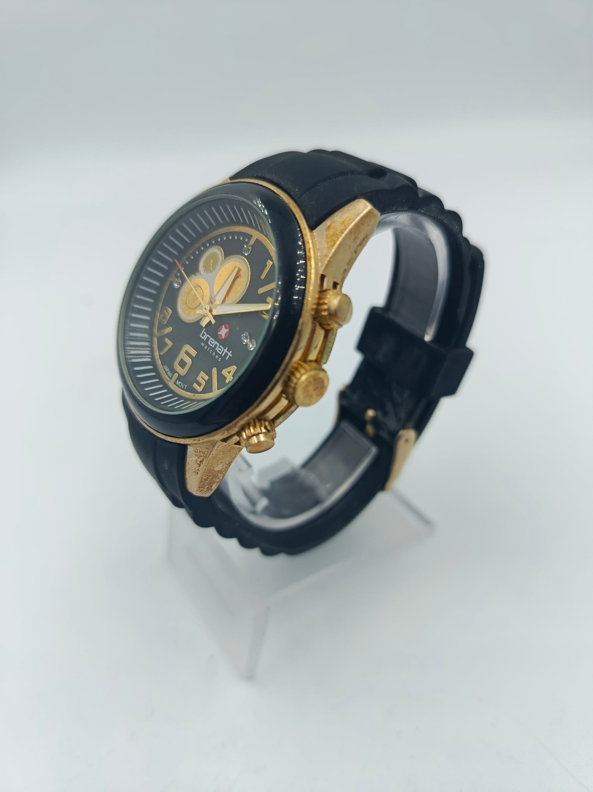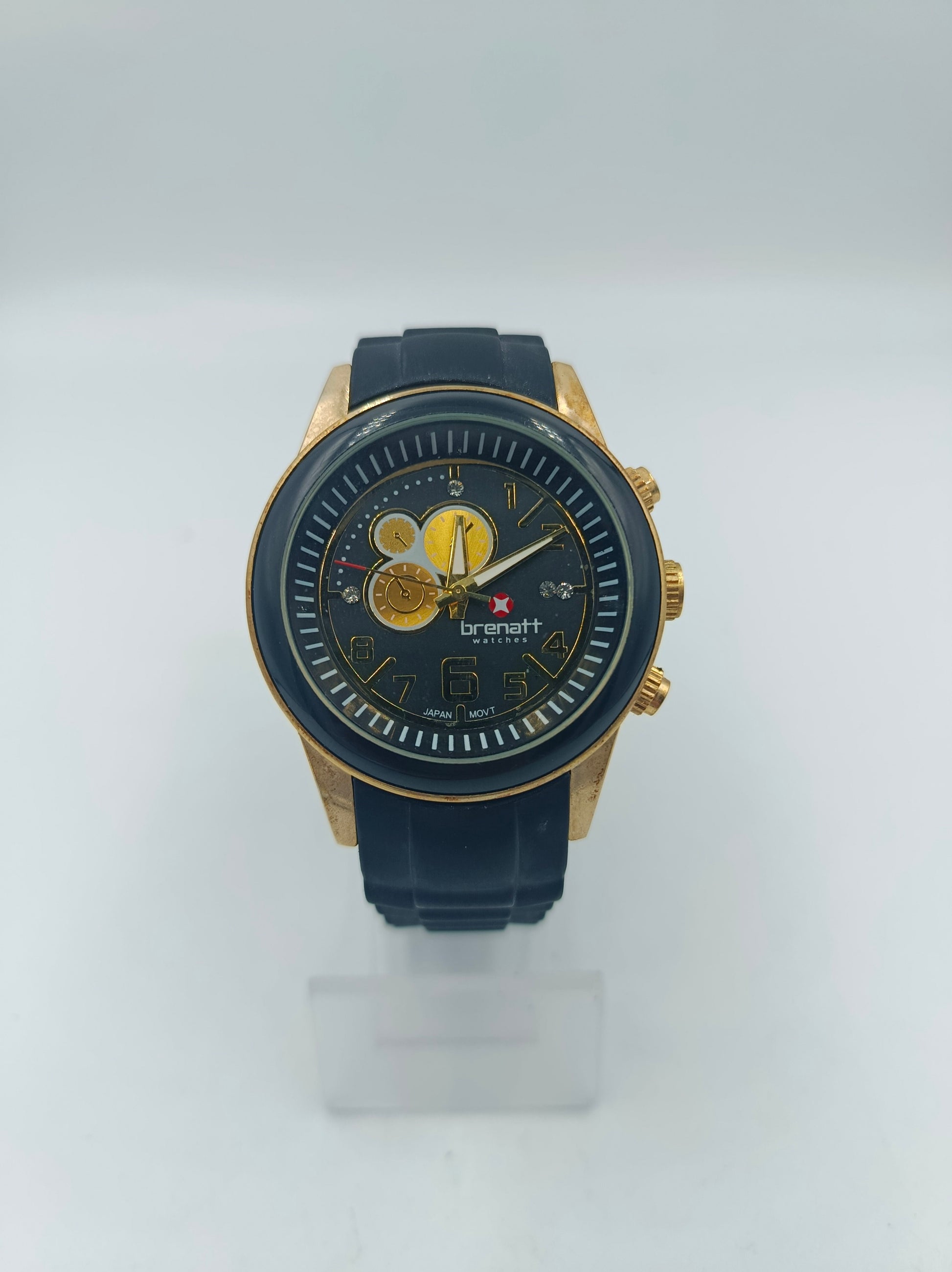 Sportliche Brenatt Herrenarmbanduhr mit markantem Design in Schwarz und Gold. Das schwarze Ziffernblatt mit goldfarbenen Akzenten und funkelnden Details verleiht der Uhr einen modernen, maskulinen Look. Ideal für Freizeit oder Alltag.