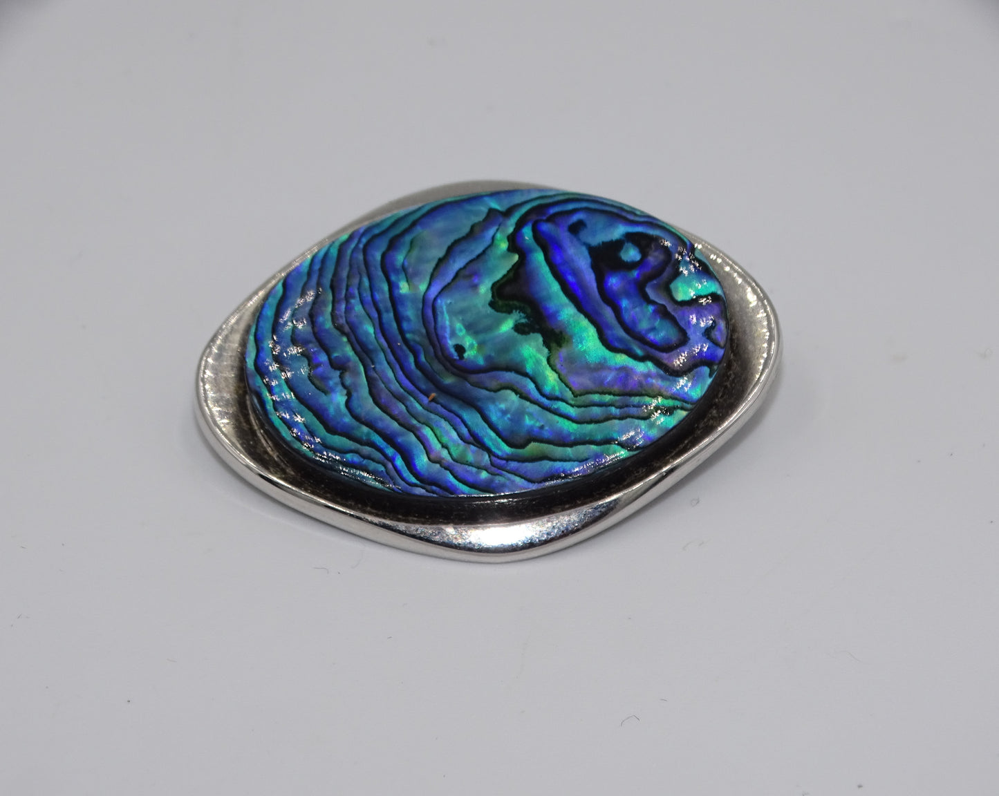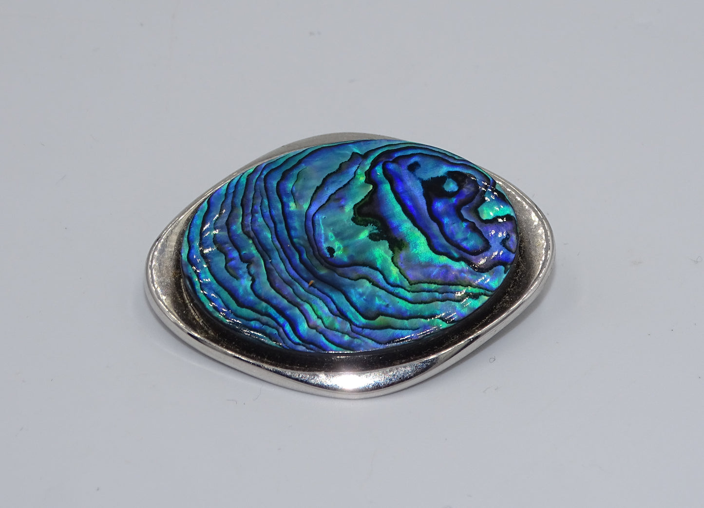 Diese wunderschöne Brosche aus echter Abalone-Muschel besticht durch ihre einzigartigen, schillernden Farben. Mit einer Fassung von 4,2 cm x 3,3 cm ist sie ein auffälliges Accessoire, das jedem Outfit eine elegante Note verleiht. Trotz ihres gebrauchten Zustands ist die Brosche in hervorragender Qualität erhalten. Bitte beachten Sie die Bilder für eine genaue Beurteilung des Zustands.