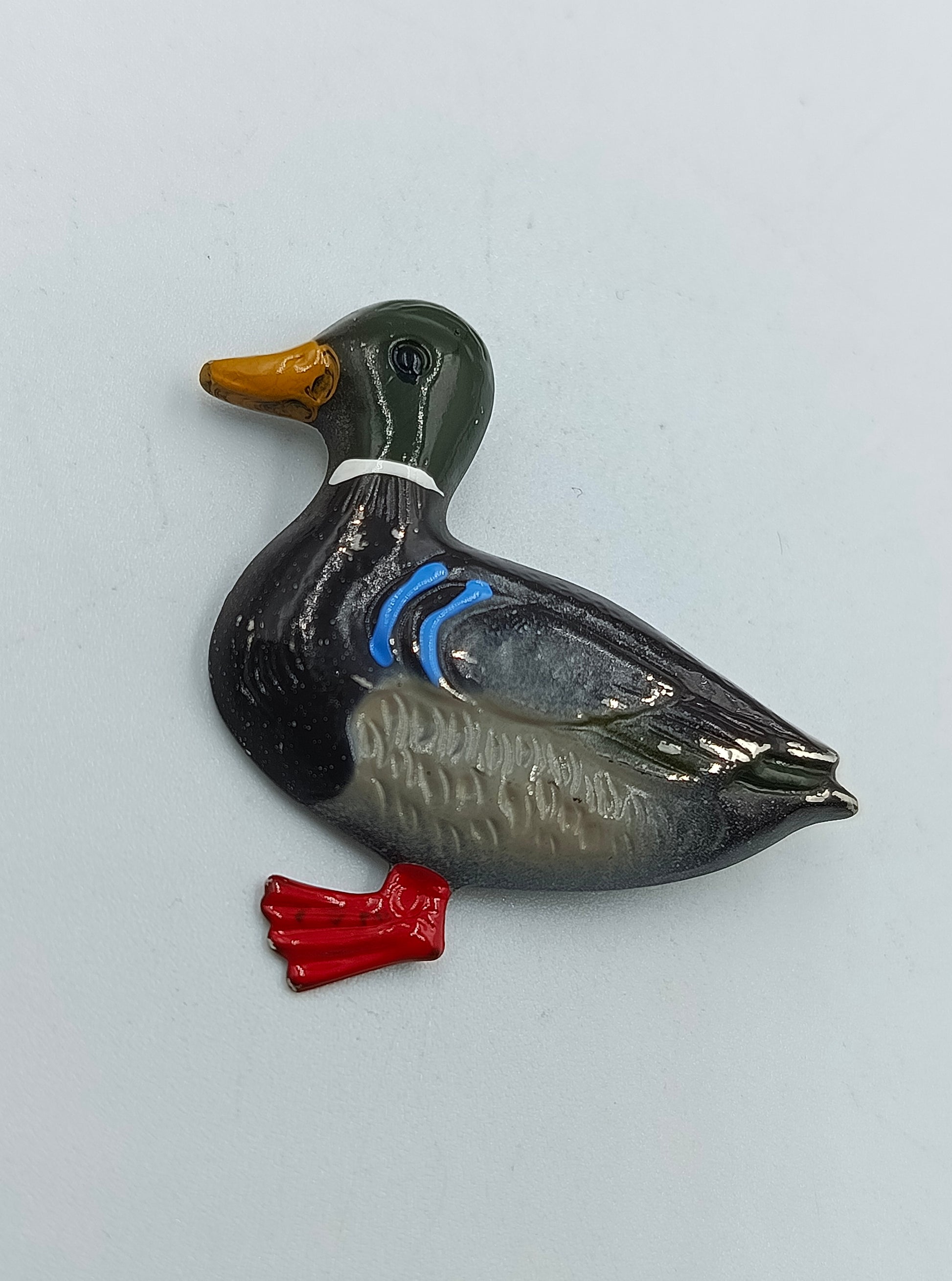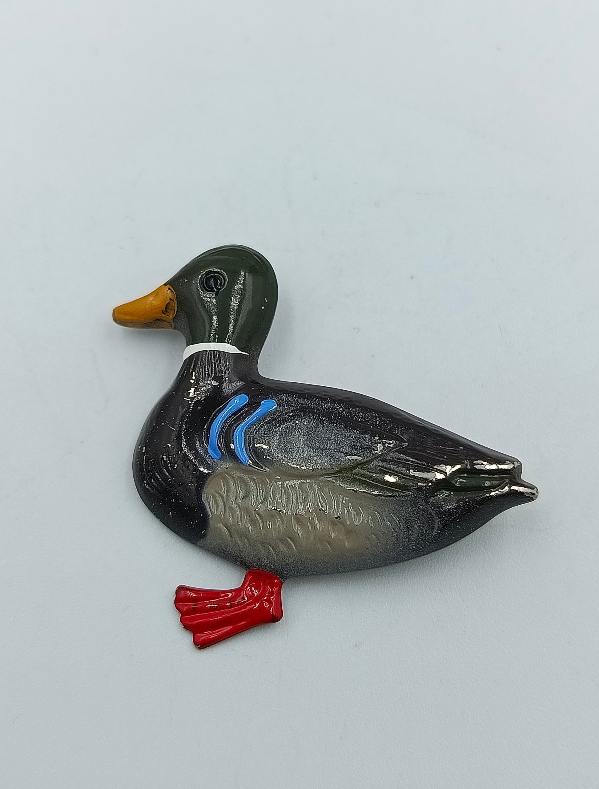 Detailreich gearbeitete Brosche in Form einer Ente. Das Schmuckstück ist aus Metall gefertigt und mit Emaille farbig bemalt, wodurch die Ente besonders lebendig wirkt. Ein kleiner Hingucker, der sowohl an Kleidung als auch an Accessoires getragen werden kann.