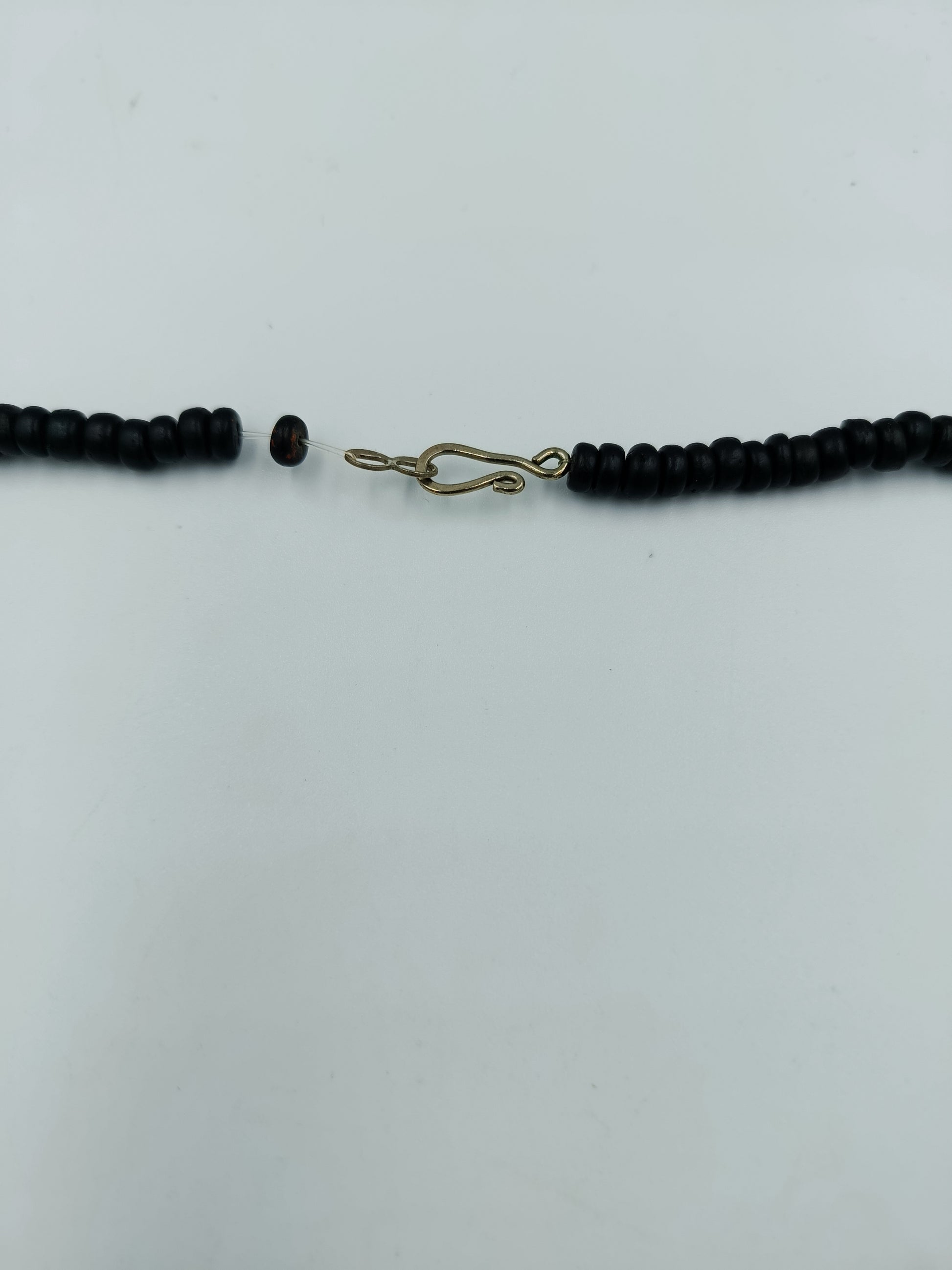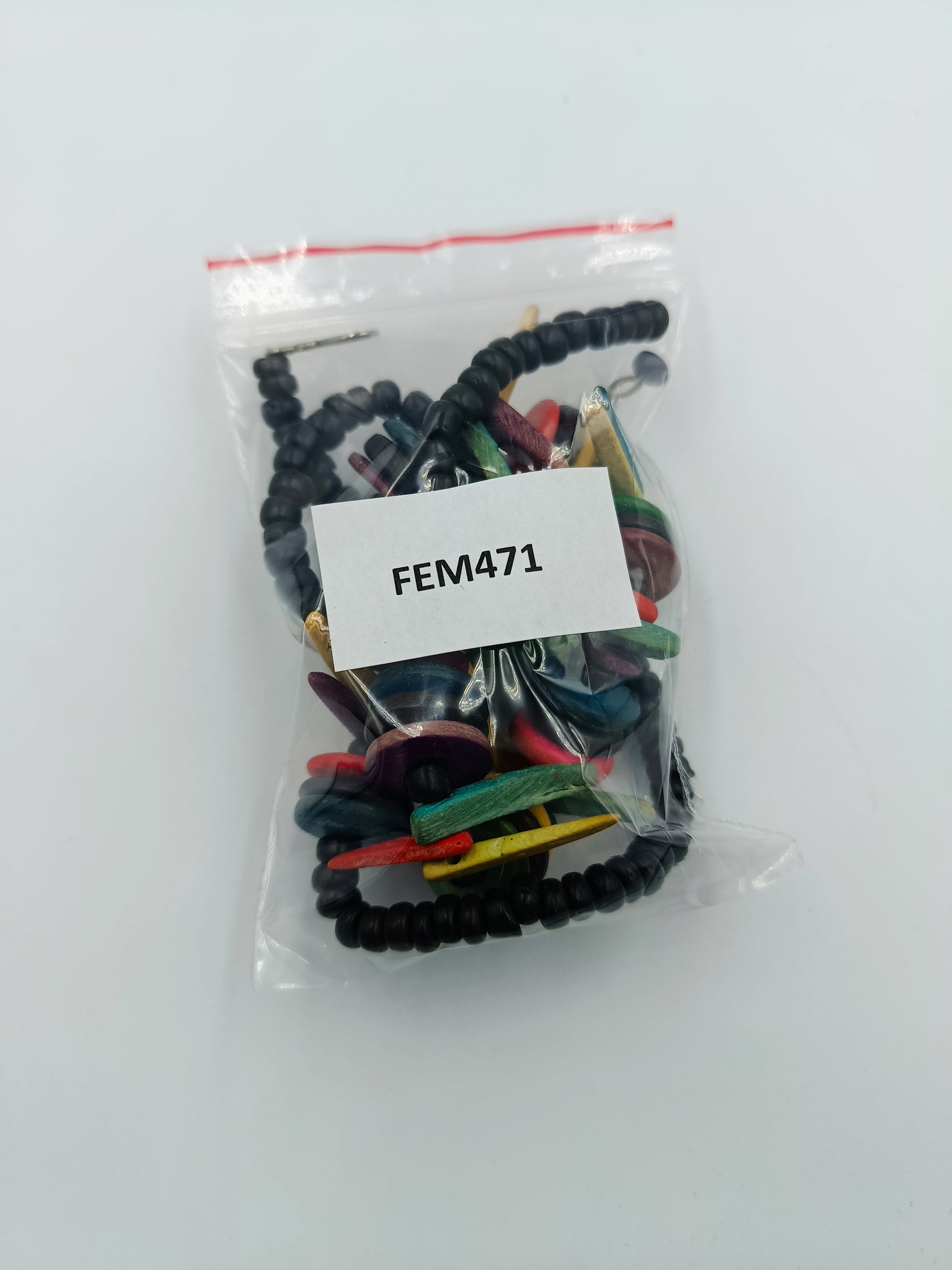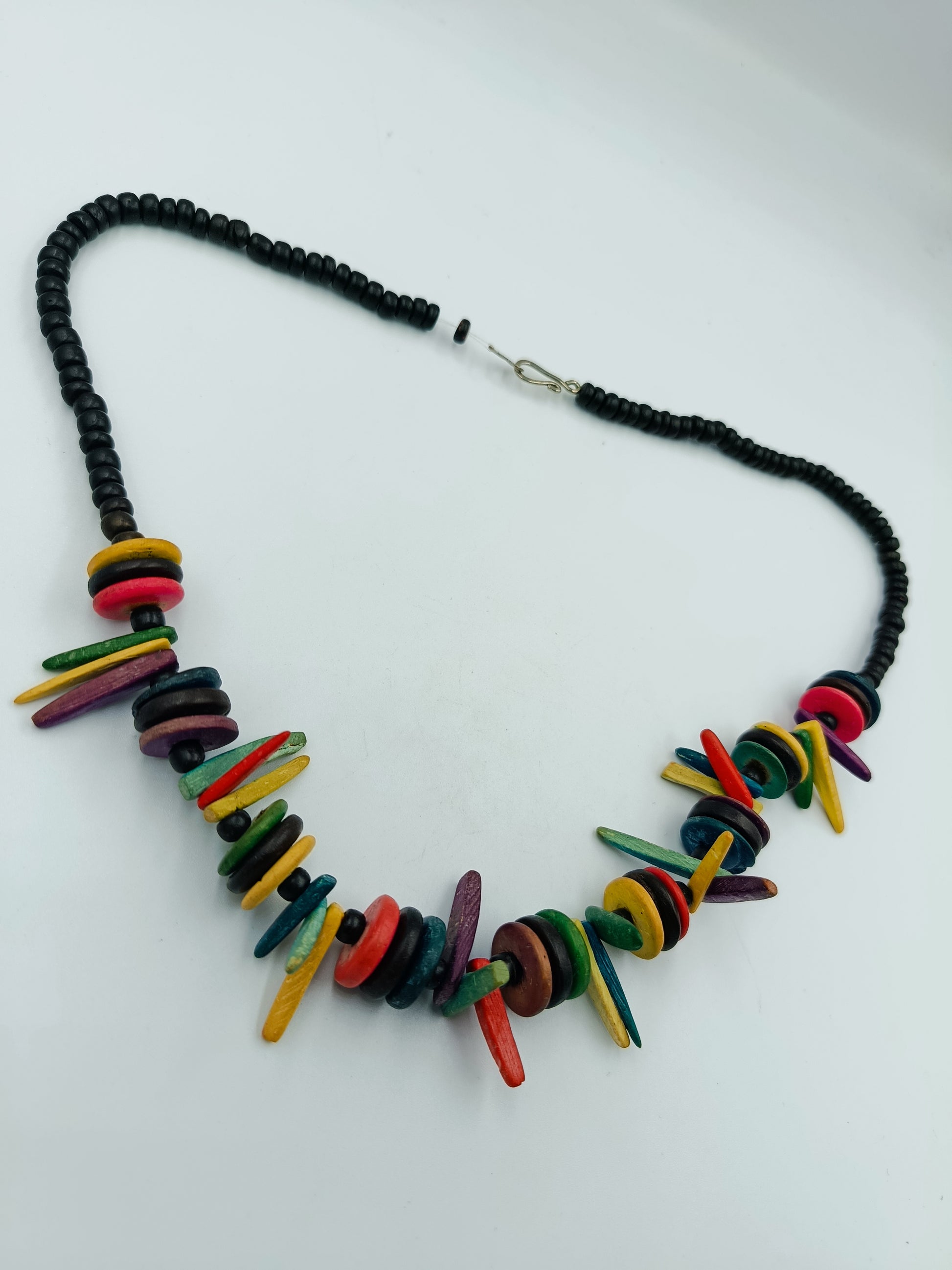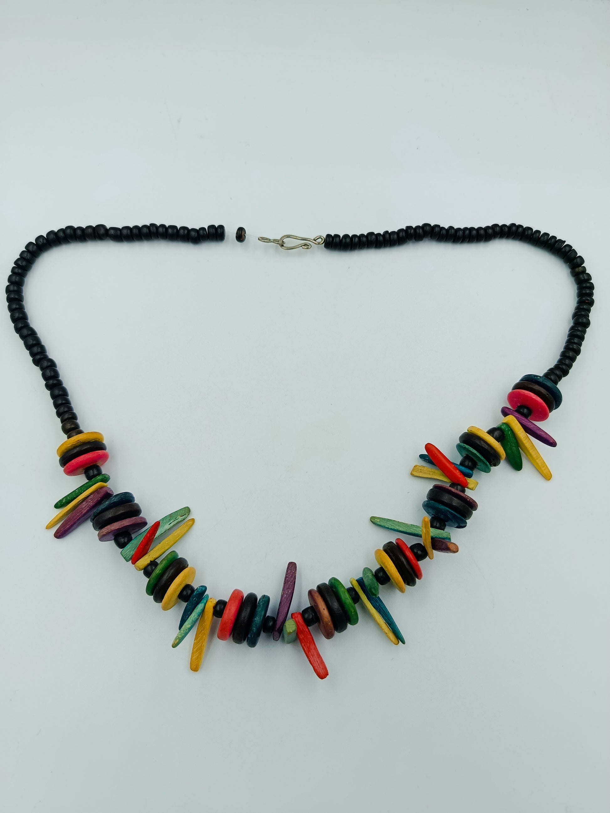 Auffällige Halskette aus verschiedenfarbigen Holz-Elementen, die durch ihre lebendige Farbgestaltung sofort ins Auge fällt. Die Kombination aus runden und länglichen Holzperlen verleiht der Kette einen spielerischen, originellen Look. Ideal als sommerliches Accessoire oder als farbenfrohes Statement zu schlichten Outfits.