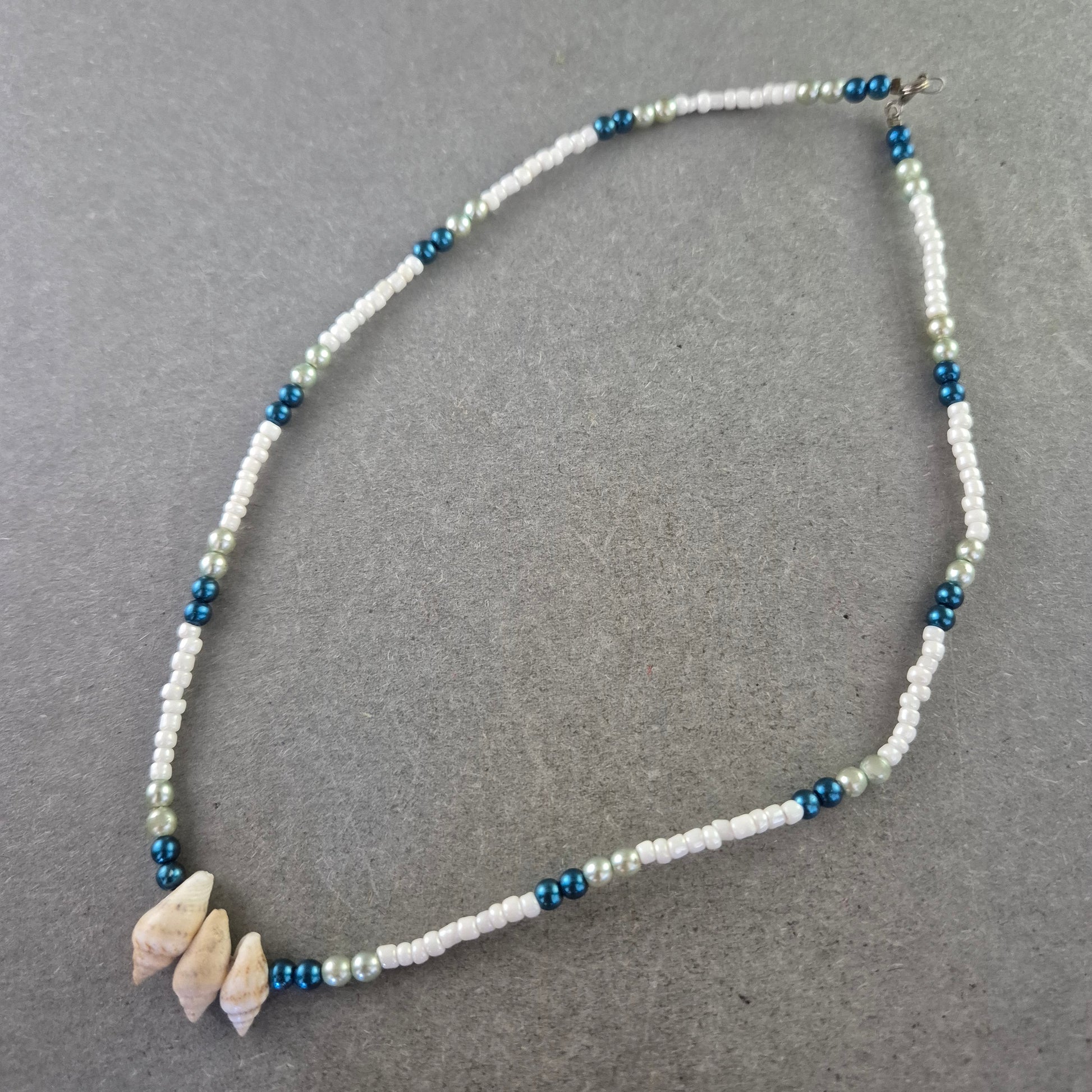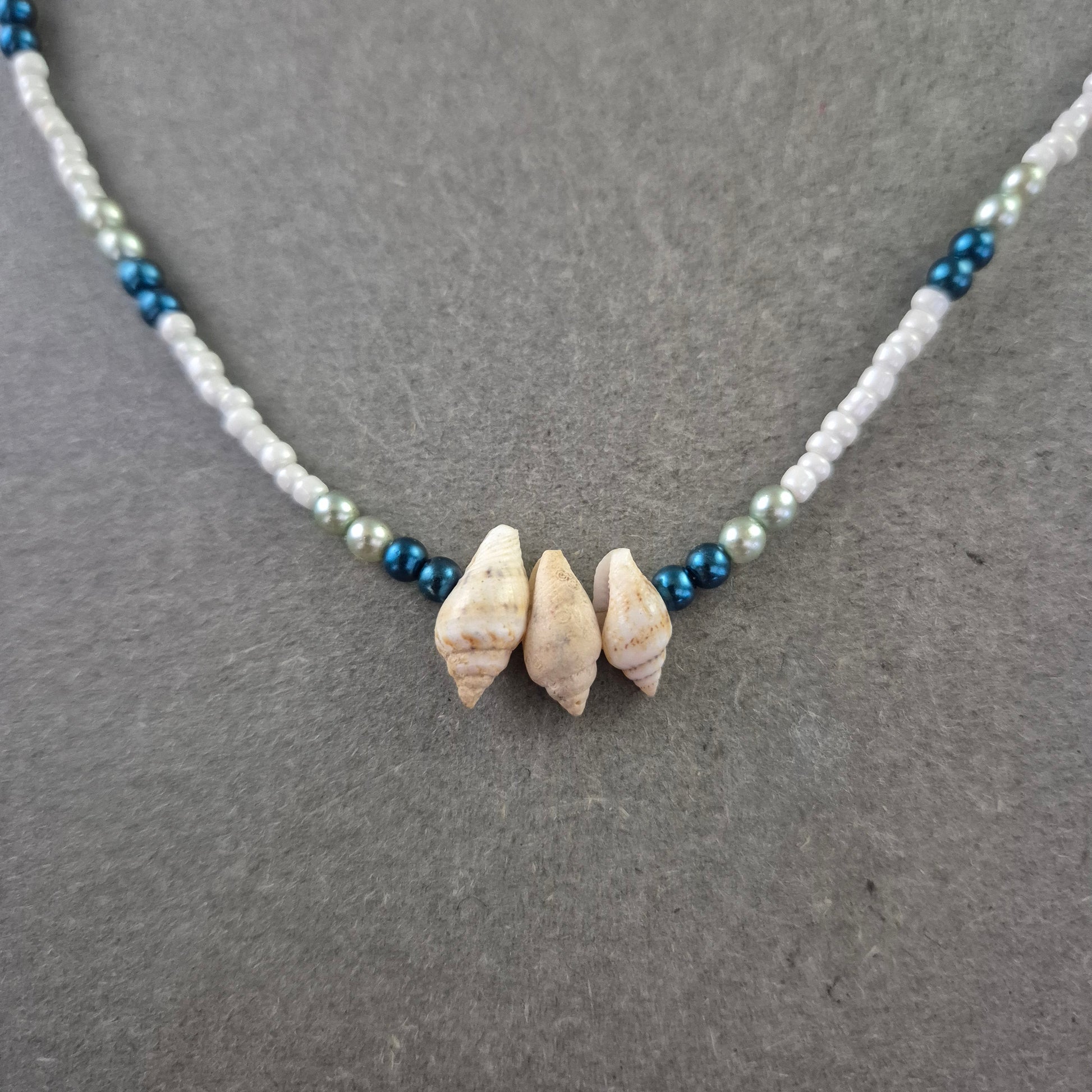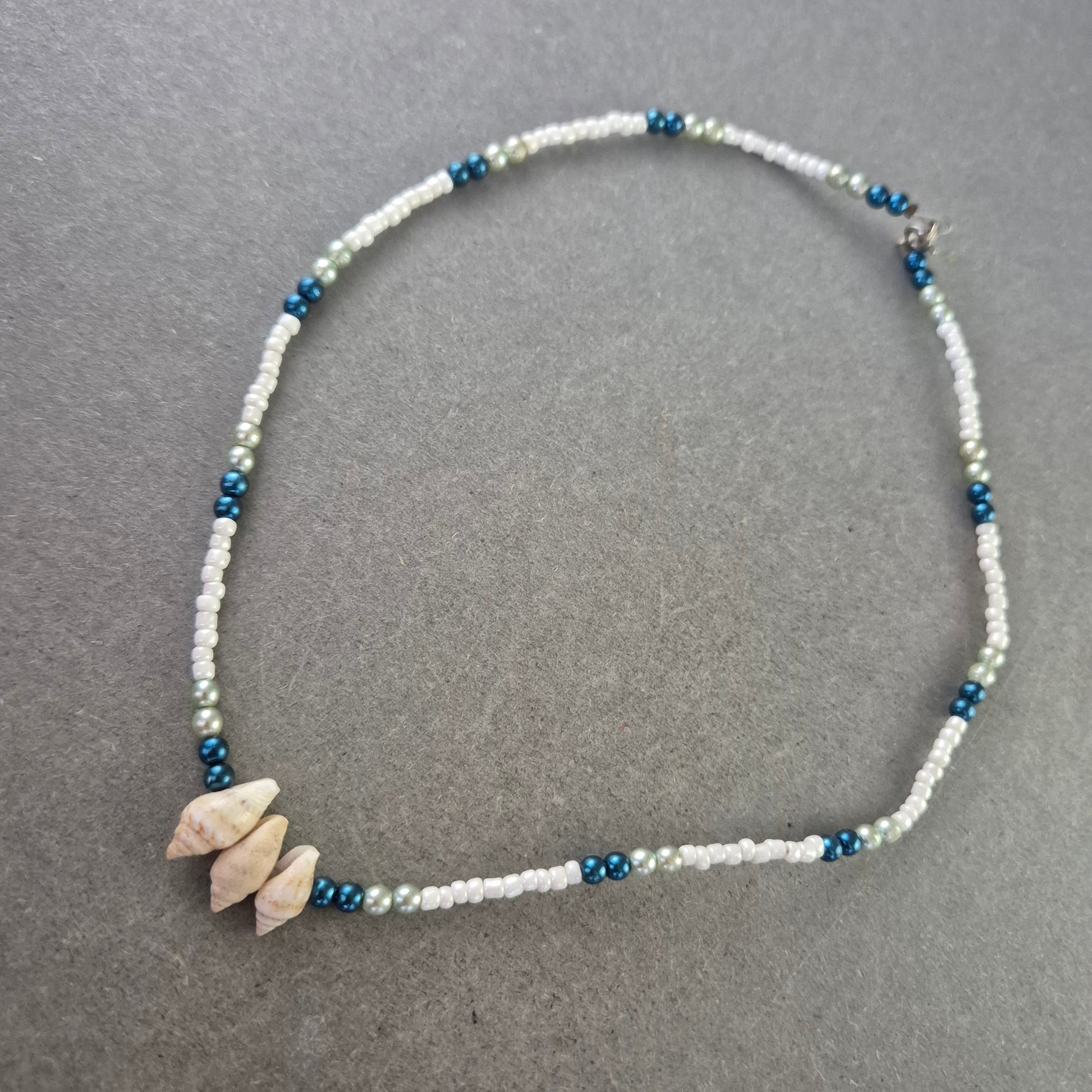 Diese verspielte Perlenkette bringt mit ihren zarten Farben und natürlichen Muschelelementen sommerliche Leichtigkeit in jedes Outfit. Weiße, grüne und blaue Perlen wechseln sich harmonisch ab und werden durch drei kleine Muscheln im Zentrum abgerundet. Perfekt für Strandtage oder als farbenfroher Akzent im Alltag.