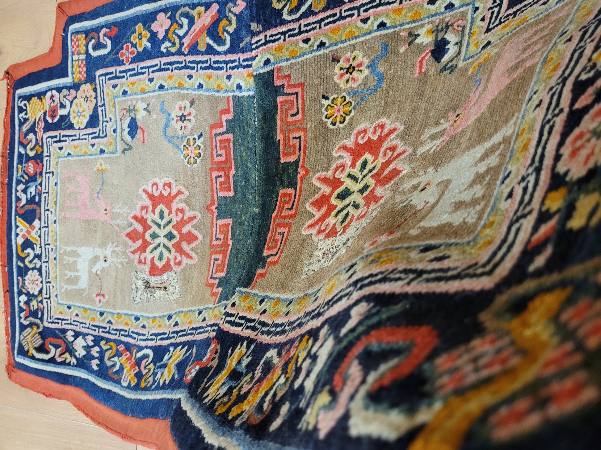 angeboten wird ein außergewöhnlicher antiker China Teppich aus dem späten 19. Jahrhundert (ca. 1880). Dieses handgeknüpfte Unikat zeigt ein seltenes figürliches Design mit Tieren, floralen Symbolen und stilisierten Wolkenbändern – typisch für die künstlerische Ausdrucksform klassischer chinesischer Knüpfkunst.