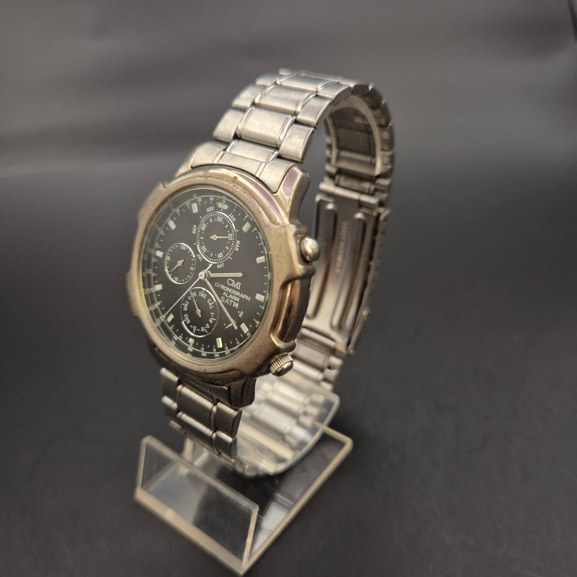 Diese CMI Herren Armbanduhr ist ein massiver Edelstahl-Chronograph mit schwarzem Zifferblatt. Sie bietet zahlreiche Zusatzfunktionen wie Alarm, Tachymeter, Kalender und 24-Stunden-Anzeige. Das Edelstahlgehäuse ist robust verarbeitet und mit 5 ATM (DIN 8310) wasserdicht. Aufgrund des handschriftlichen Vermerks „Not working“ ist die Uhr momentan defekt und eignet sich daher bestens für Bastler, Ersatzteile oder zur Restaurierung.