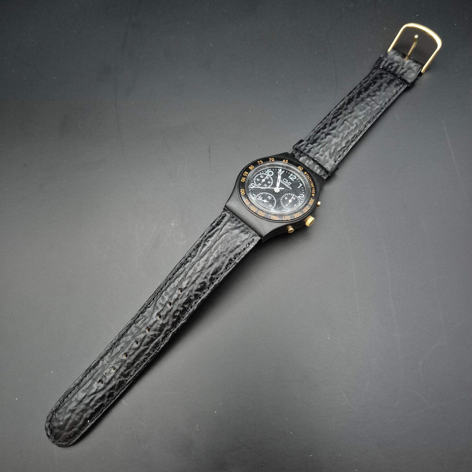 Diese CMI Herren Uhr präsentiert sich in einem sportlich-eleganten Design. Das schwarze Zifferblatt mit goldfarbenen Details und Chronograph-Optik verleiht der Uhr einen markanten Charakter. Die Tachymeter-Skala auf der Lünette unterstreicht den sportlichen Stil, während das schwarze Armband mit Strukturprägung für hohen Tragekomfort sorgt. Eine ideale Uhr für Herren, die Funktionalität und Design schätzen.