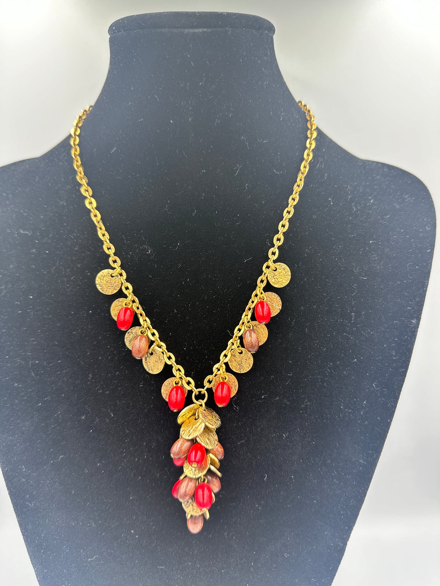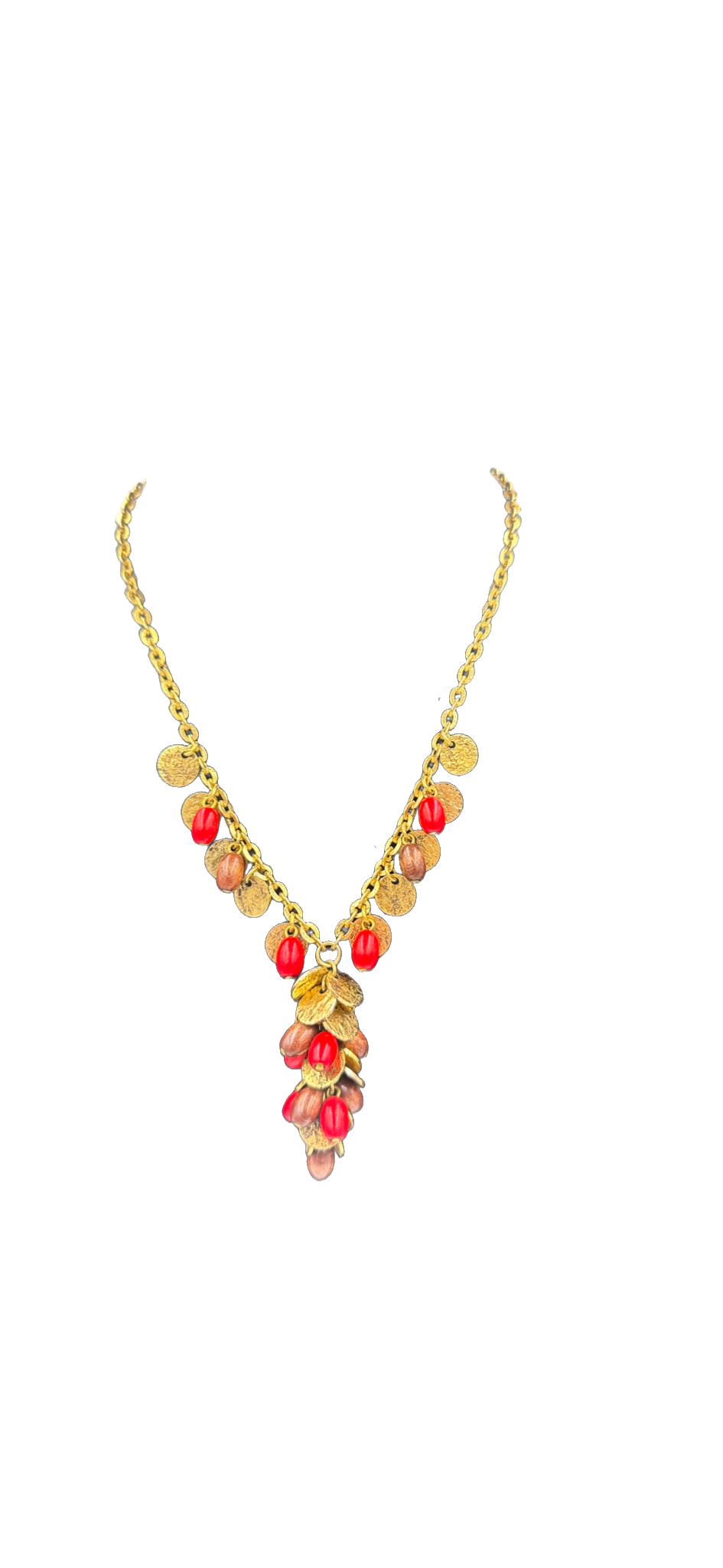 Übersicht: Ergänzen Sie Ihre Schmucksammlung um dieses einzigartige Collier, das mit seinen eleganten, rot-braun-goldfarbenen Anhängern einen Hauch von Farbe und Raffinesse bietet. Perfekt für jede Gelegenheit, von täglichen Veranstaltungen bis hin zu speziellen Ereignissen.