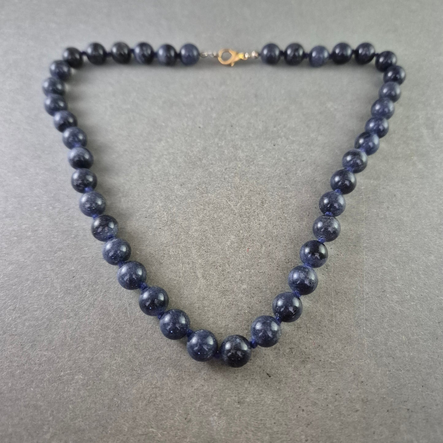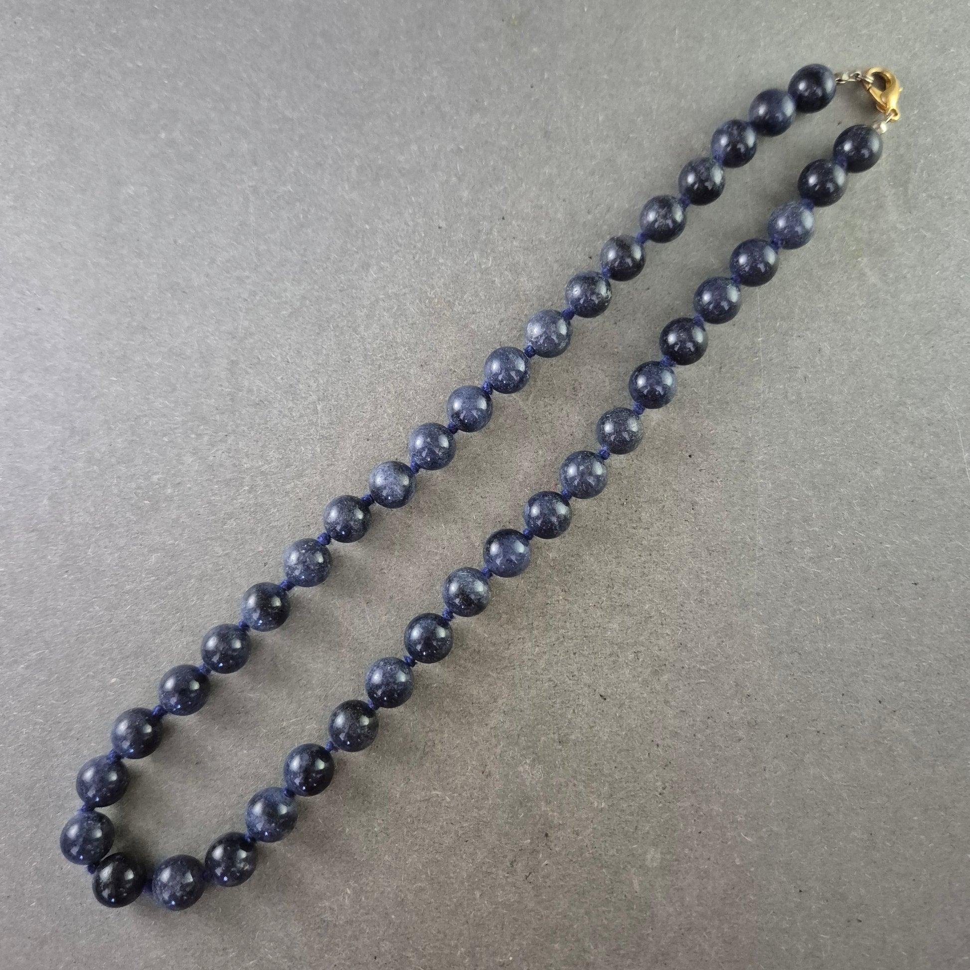 Diese elegante Halskette besteht aus rund geschliffenen, tiefblauen Lapislazuli-Kugeln. Der Stein besticht durch seine intensive Farbe und die charakteristischen goldenen Pyrit-Einschlüsse, die ihm eine besondere Tiefe verleihen. Die Kette ist auf eine robuste Schnur gefädelt und mit einer goldenen Metallschließe versehen, was sie zu einem stilvollen Accessoire macht.