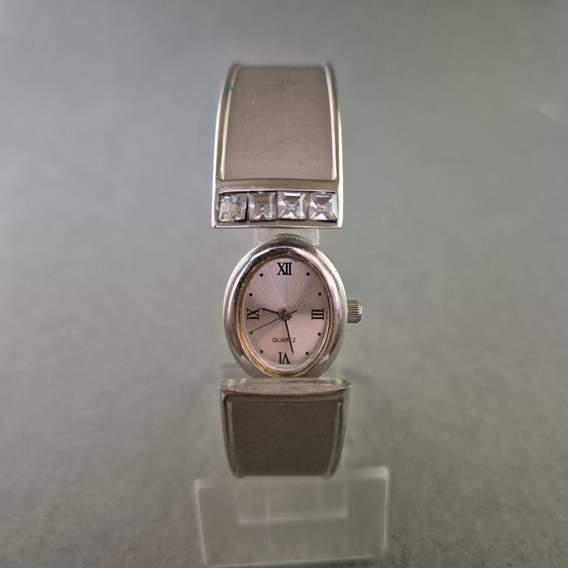 Diese Damen Uhr ist ein elegantes Schmuckstück im Armreif-Stil. Das silberfarbene Gehäuse und Armband wirken modern, während die vier quadratischen Strasssteine oberhalb des Zifferblatts einen edlen Akzent setzen. Das ovale Zifferblatt mit römischen Ziffern und Quarzwerk verbindet Funktionalität mit einem Hauch Glamour. Ideal als modisches Accessoire für festliche Anlässe oder den Alltag.