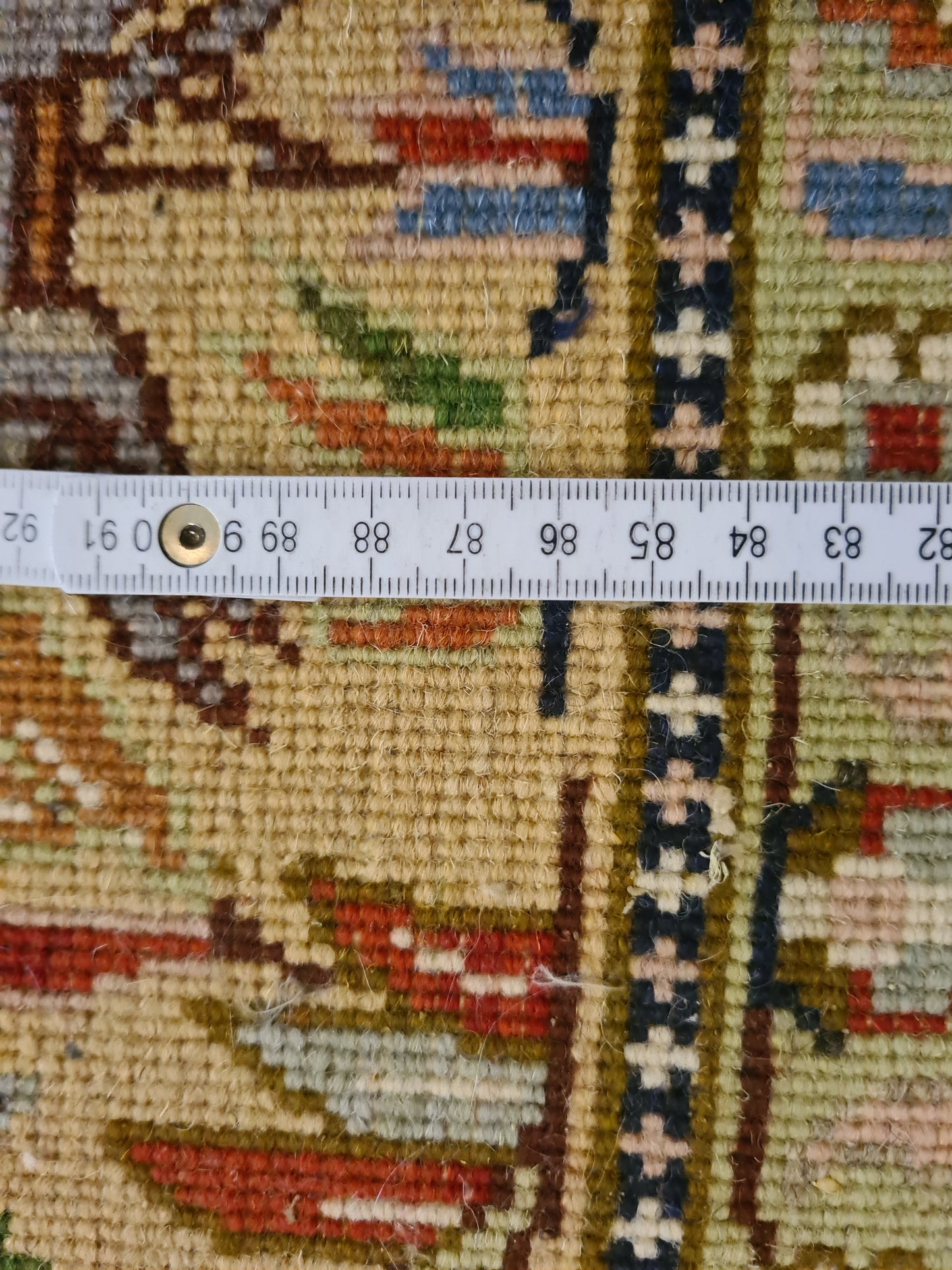 Erleben Sie die königliche Pracht dieses kunstvollen Palastteppichs aus der renommierten Handwerksstadt Täbris in Persien. Handgeknüpft aus feinster Wolle auf Wolle mit einer außergewöhnlichen Knotendichte von 250.000 Knoten pro Quadratmeter, verkörpert dieser Teppich die höchste Kunstfertigkeit und Eleganz orientalischer Teppichtradition.