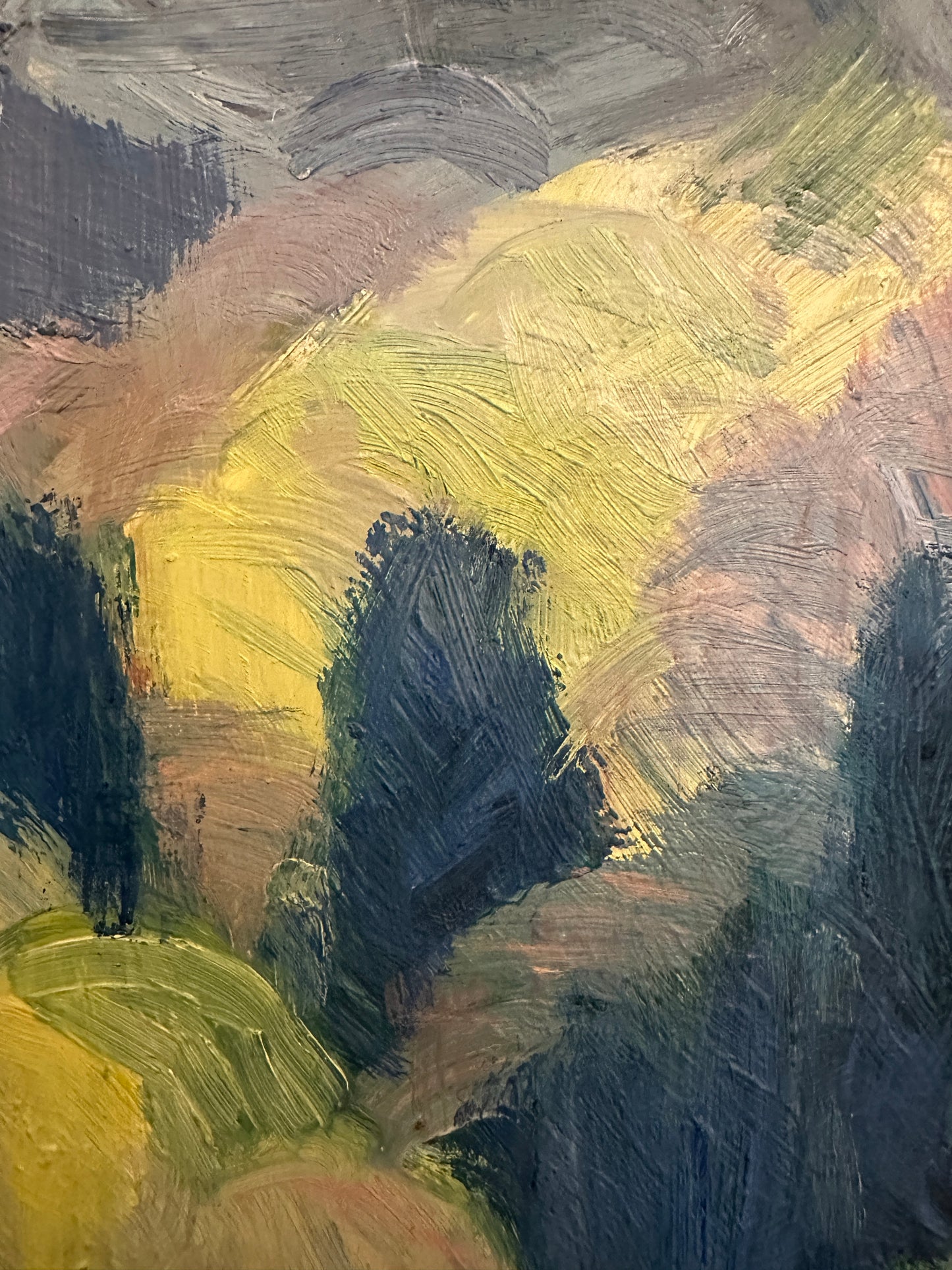 Deutsche Schule (XX) Ölgemälde Expressionistischer Landschaftsblick mit Herberge