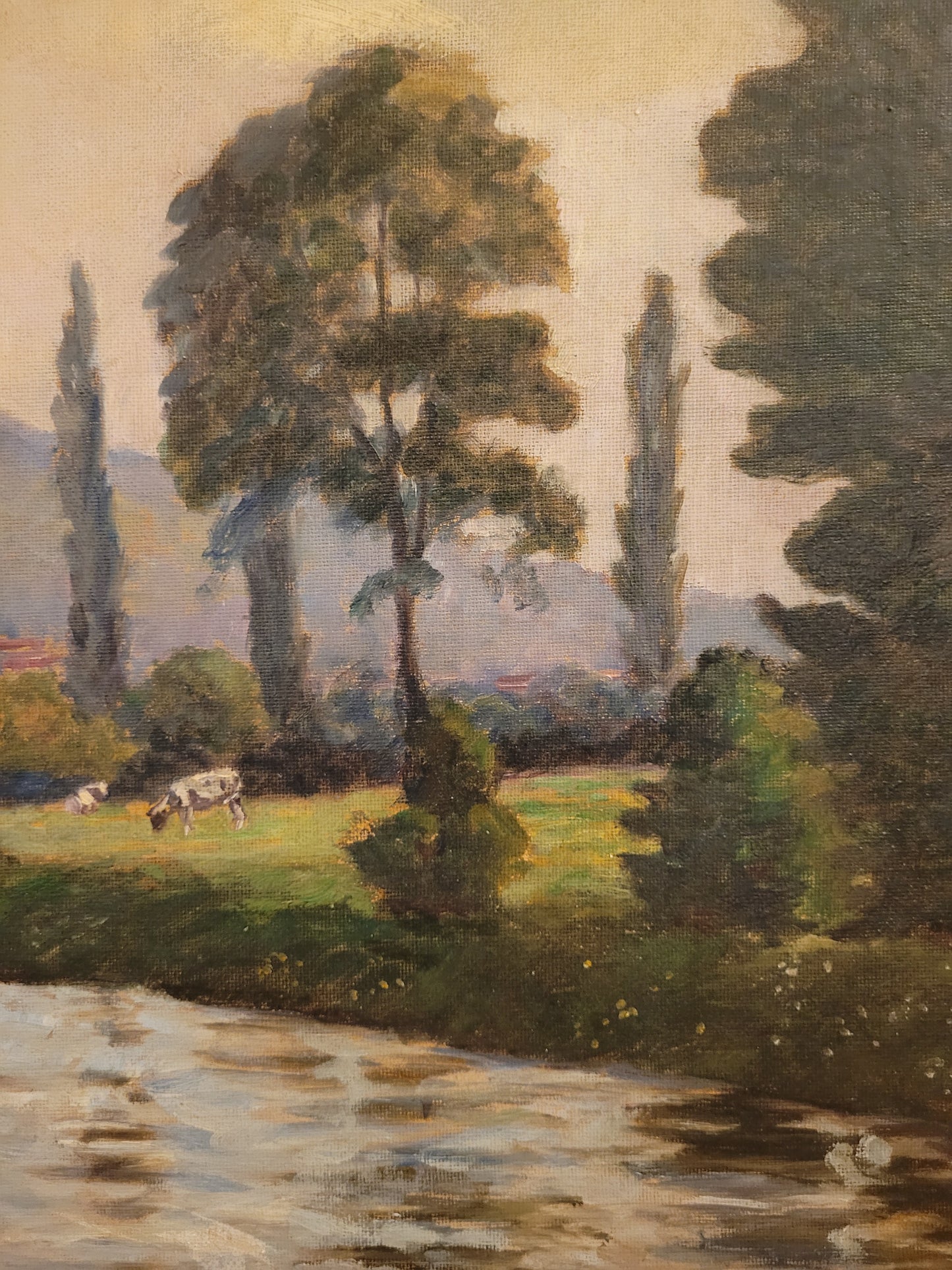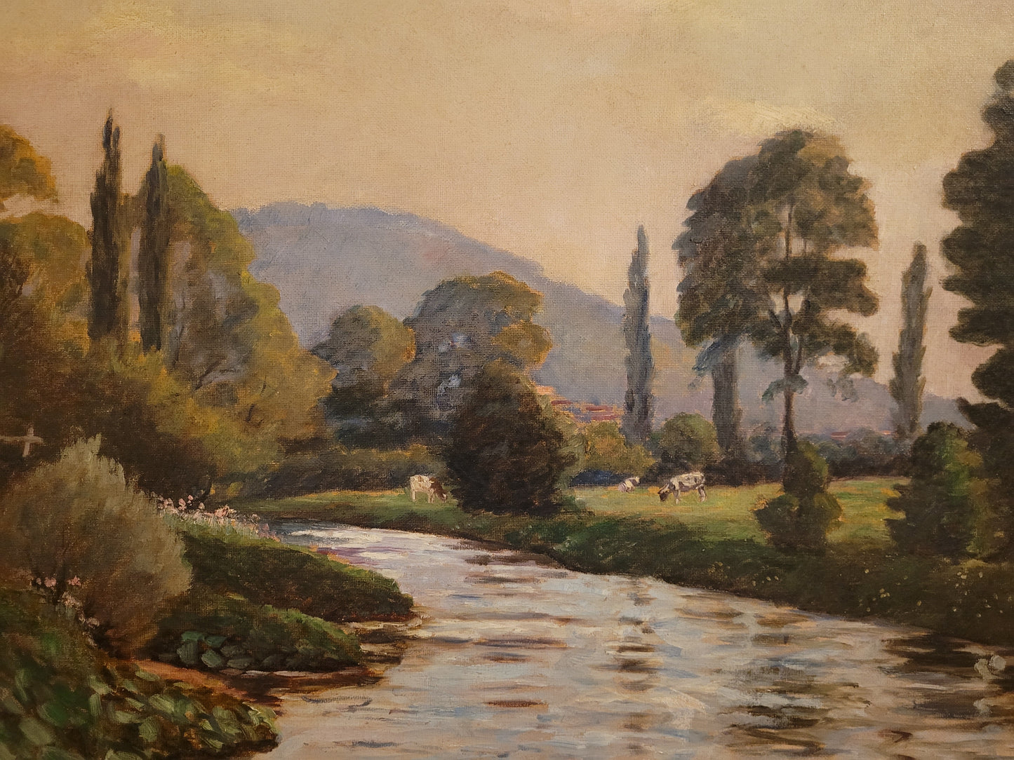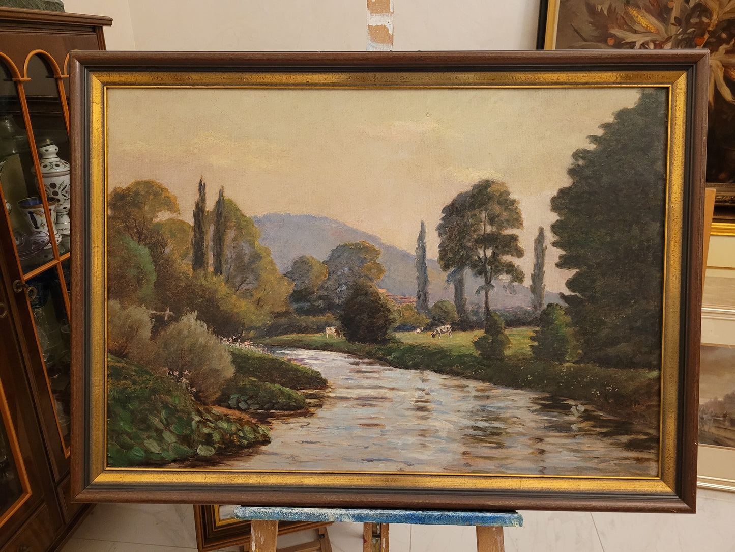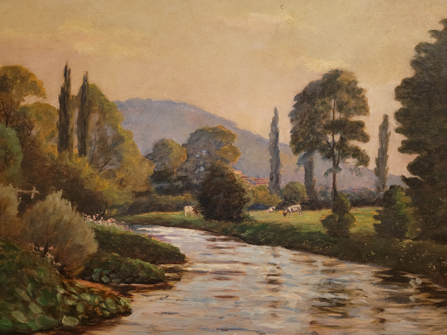 Deutsche Schule (XX) Ölgemälde Landschaft mit Fluss und Kühen 90x110cm