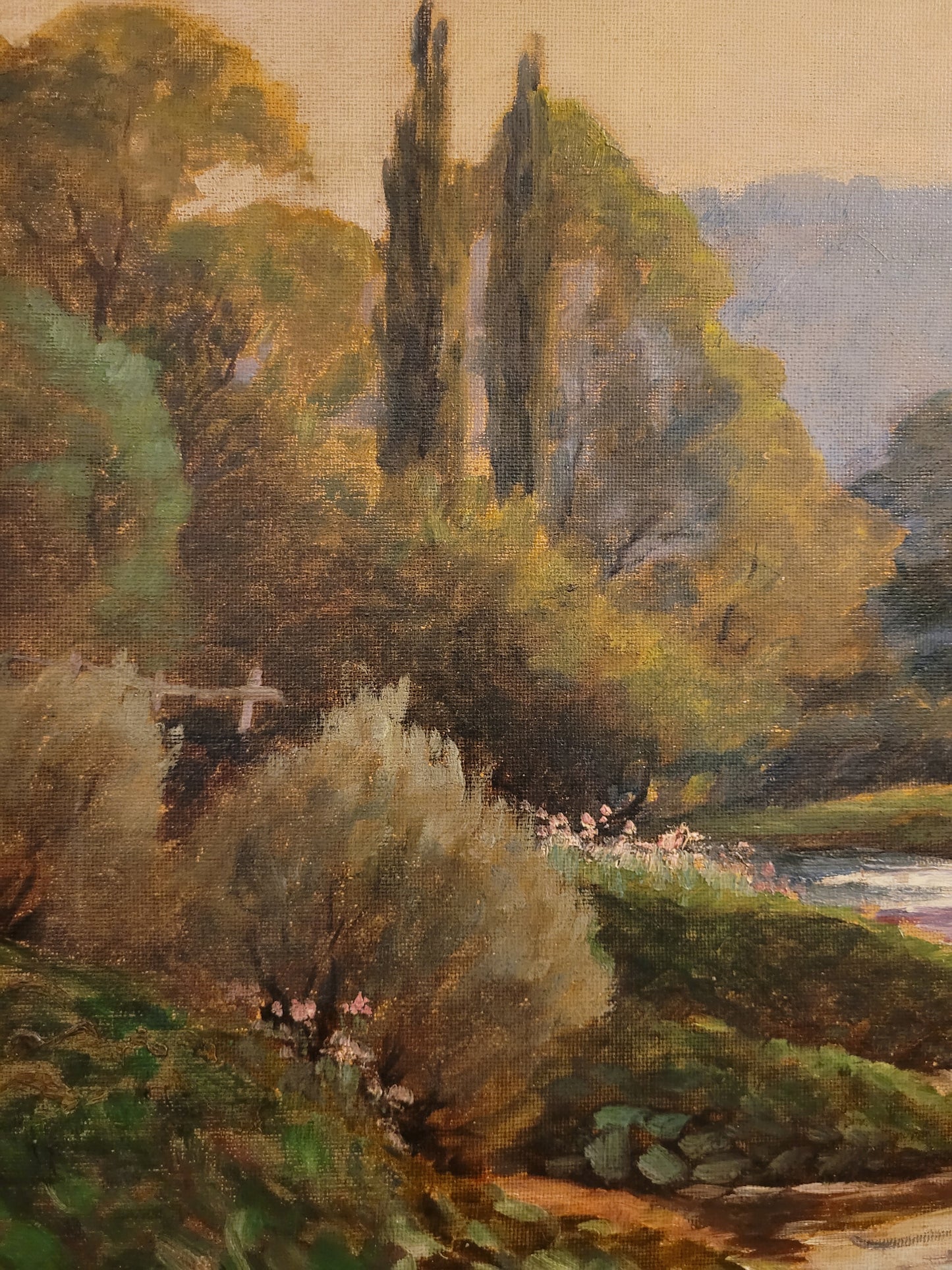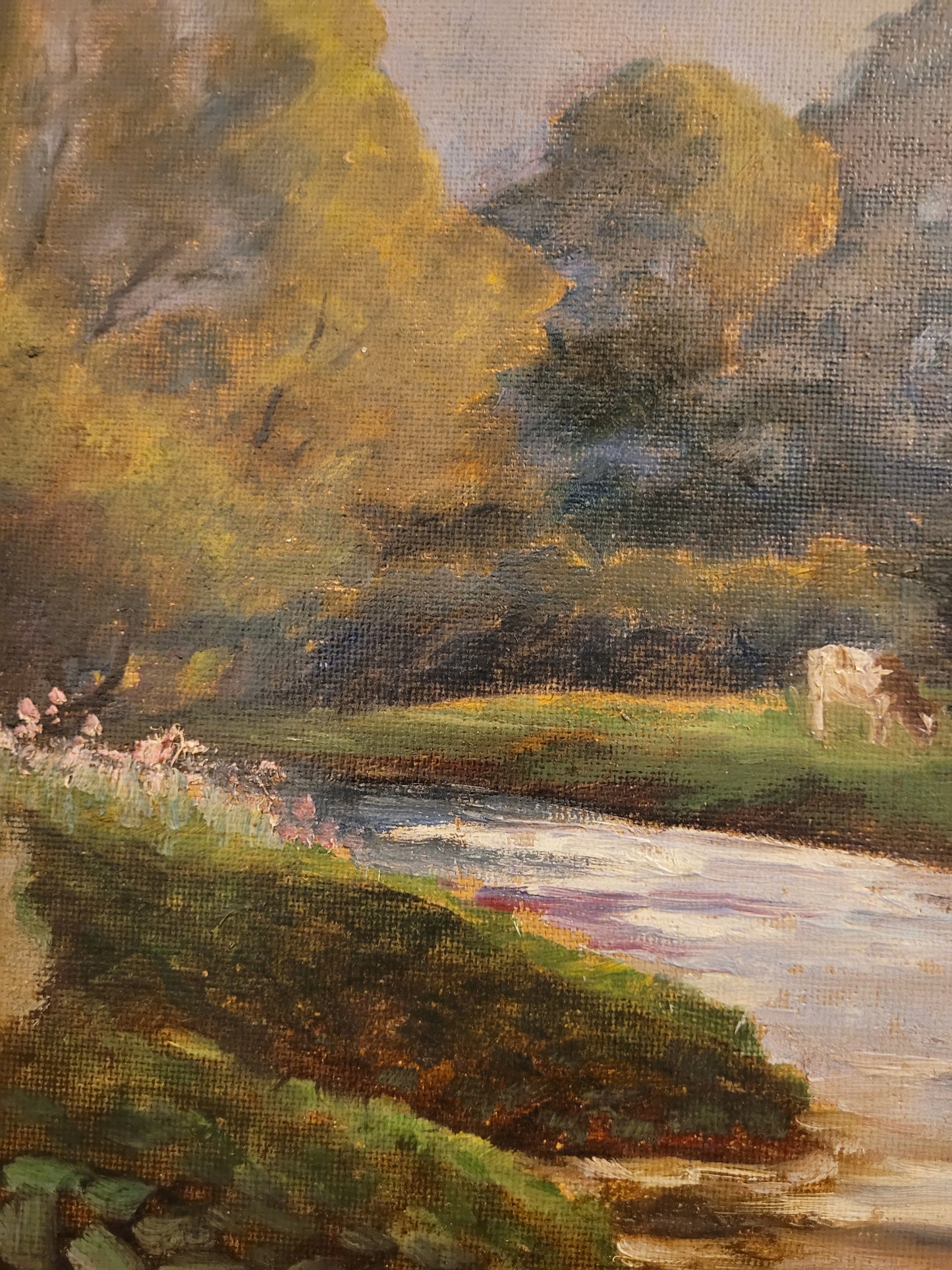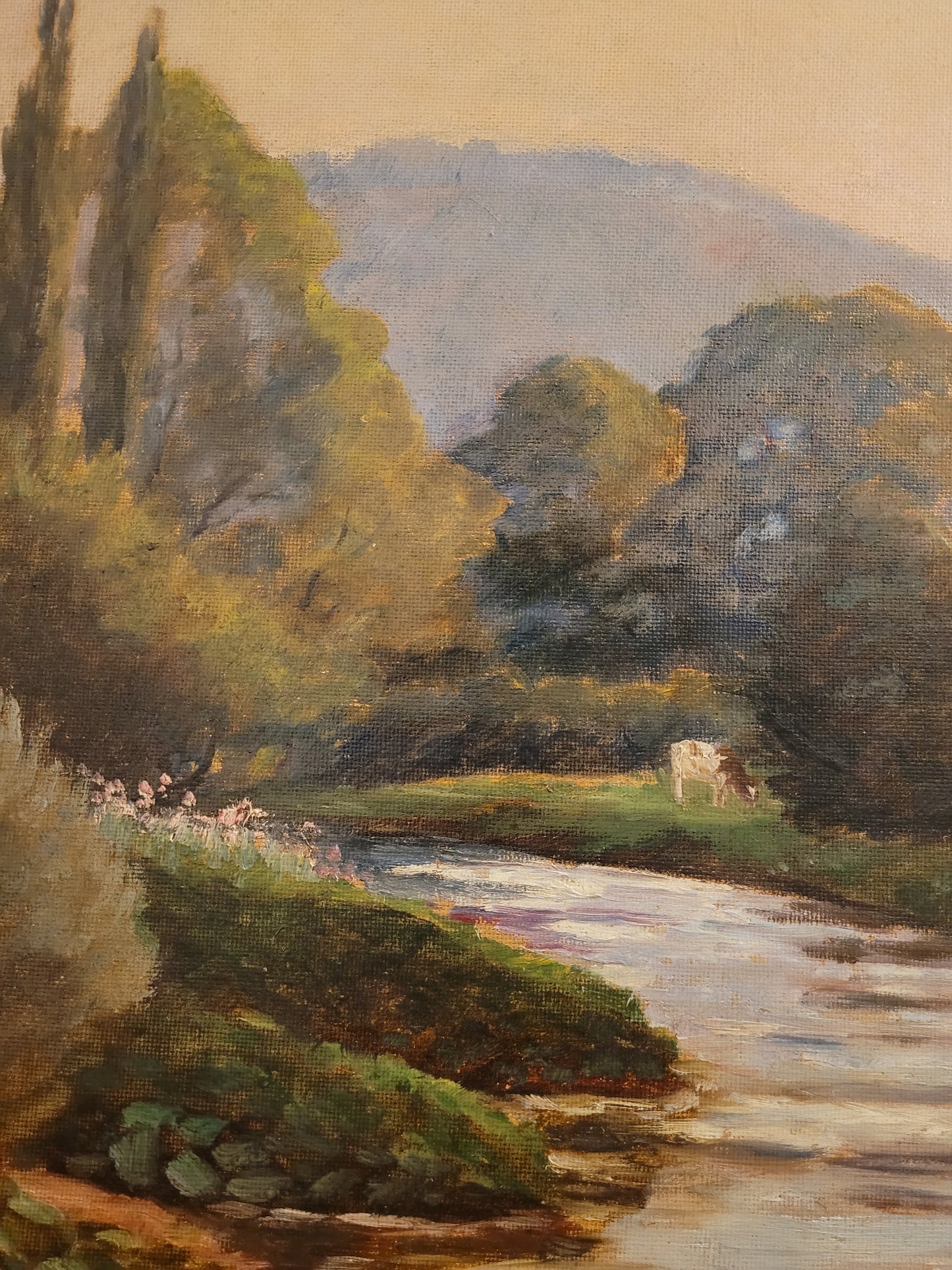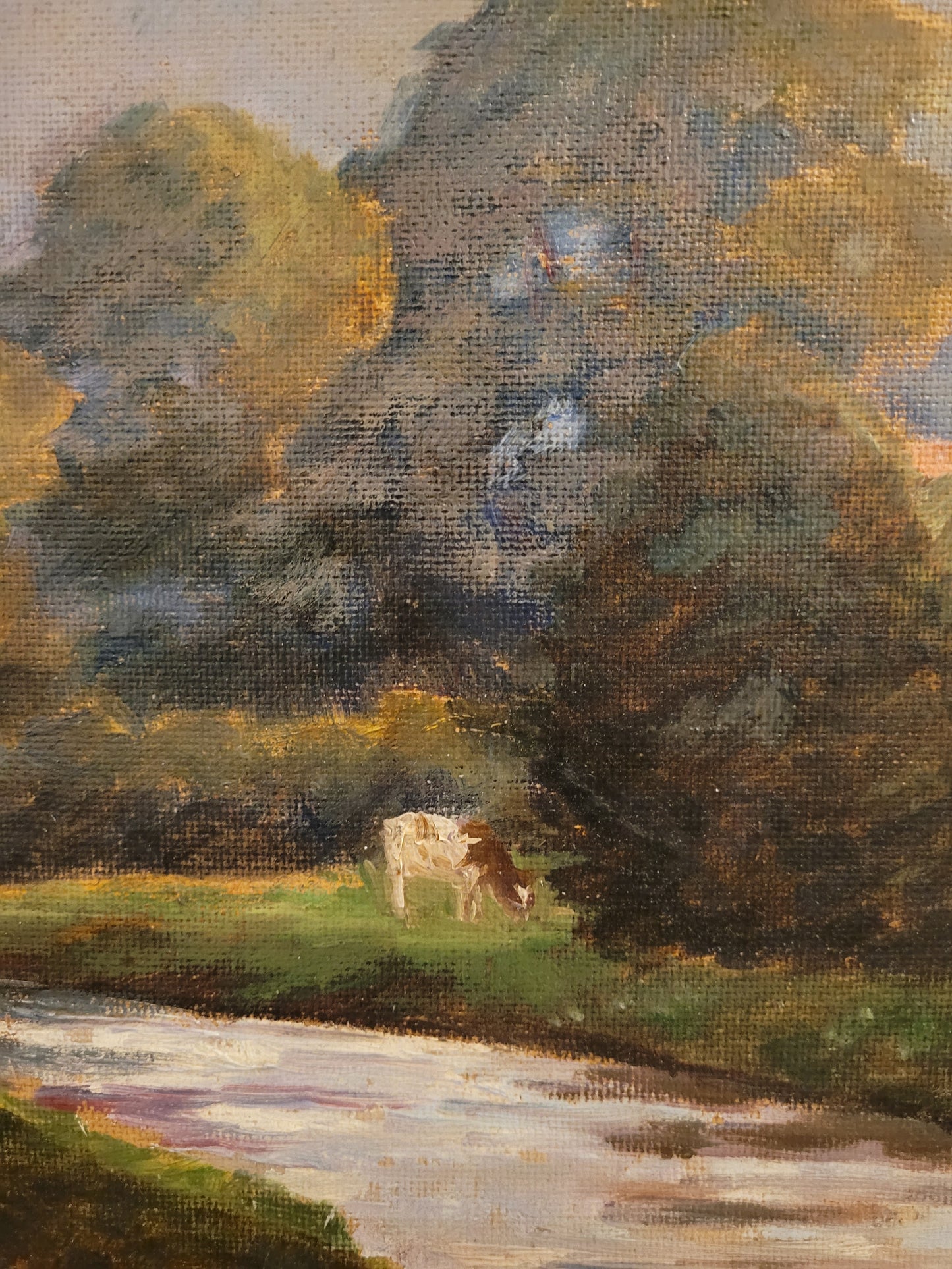 Deutsche Schule (XX) Ölgemälde Landschaft mit Fluss und Kühen 90x110cm