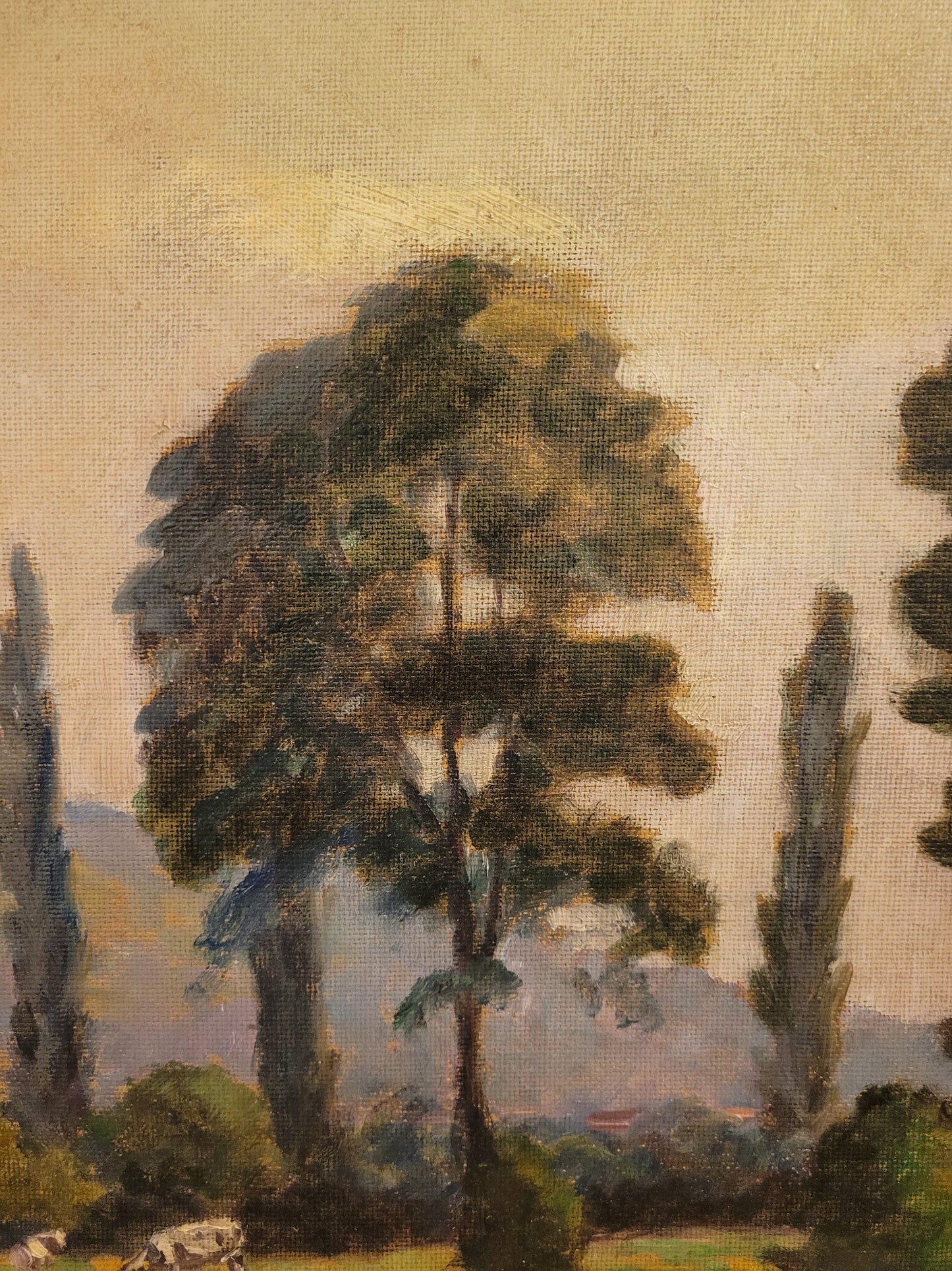 Beschreibung: Das Ölgemälde der deutschen Schule des 20. Jahrhunderts zeigt eine weitläufige Landschaft, durch die sich ein ruhiger Fluss schlängelt. Hohe Bäume säumen das Ufer, während friedlich grasende Kühe die Szene beleben. Die Maltechnik auf Malkarton verleiht dem Werk eine besondere Textur und Lebendigkeit. Mit den Maßen von 90x110cm mit Rahmen und 70x100cm ohne Rahmen wird das Gemälde zu einem eindrucksvollen Blickfang. Der Zustand des Gemäldes ist gut, wie auf den beigefügten Fotos ersichtlich.