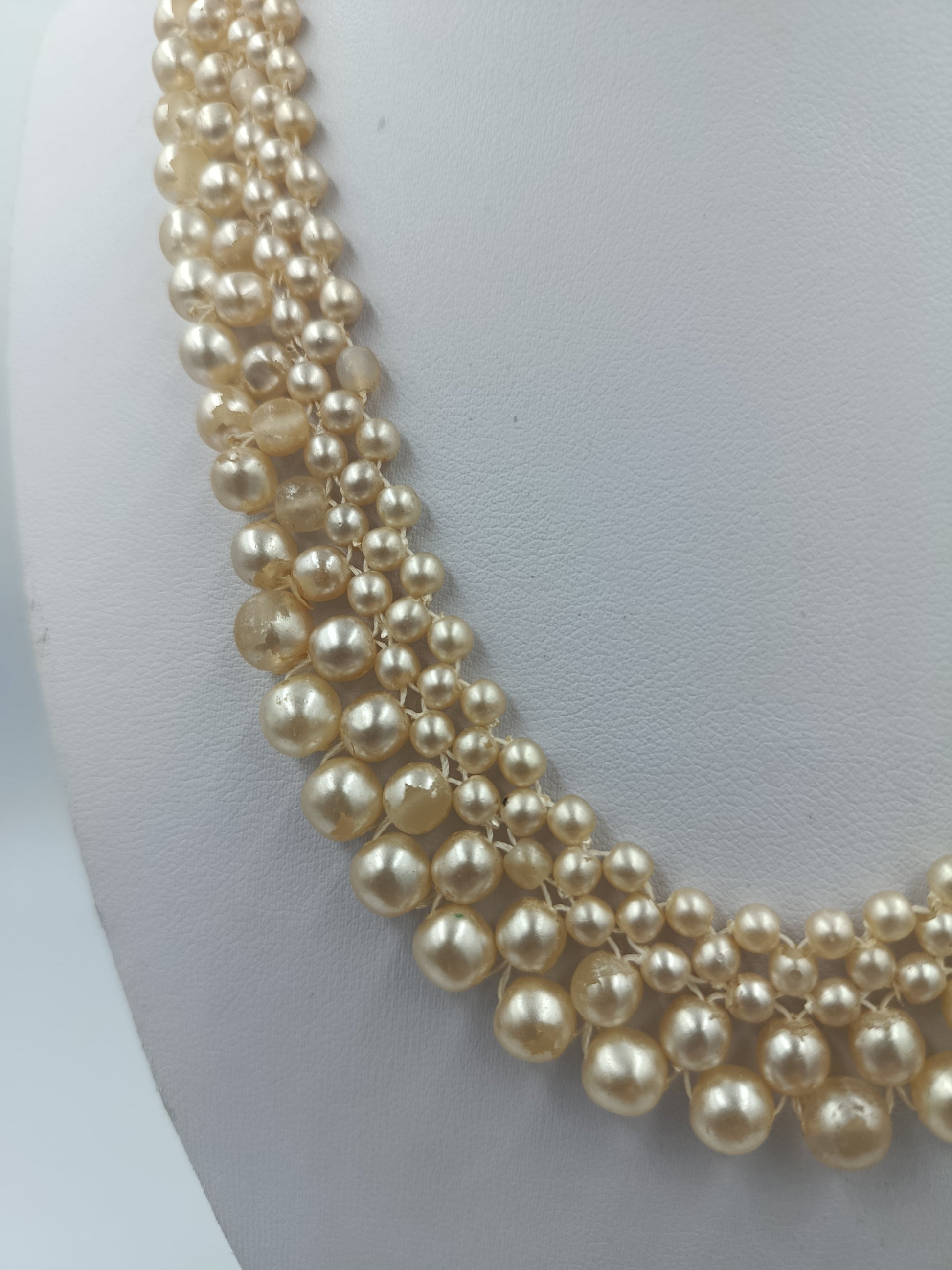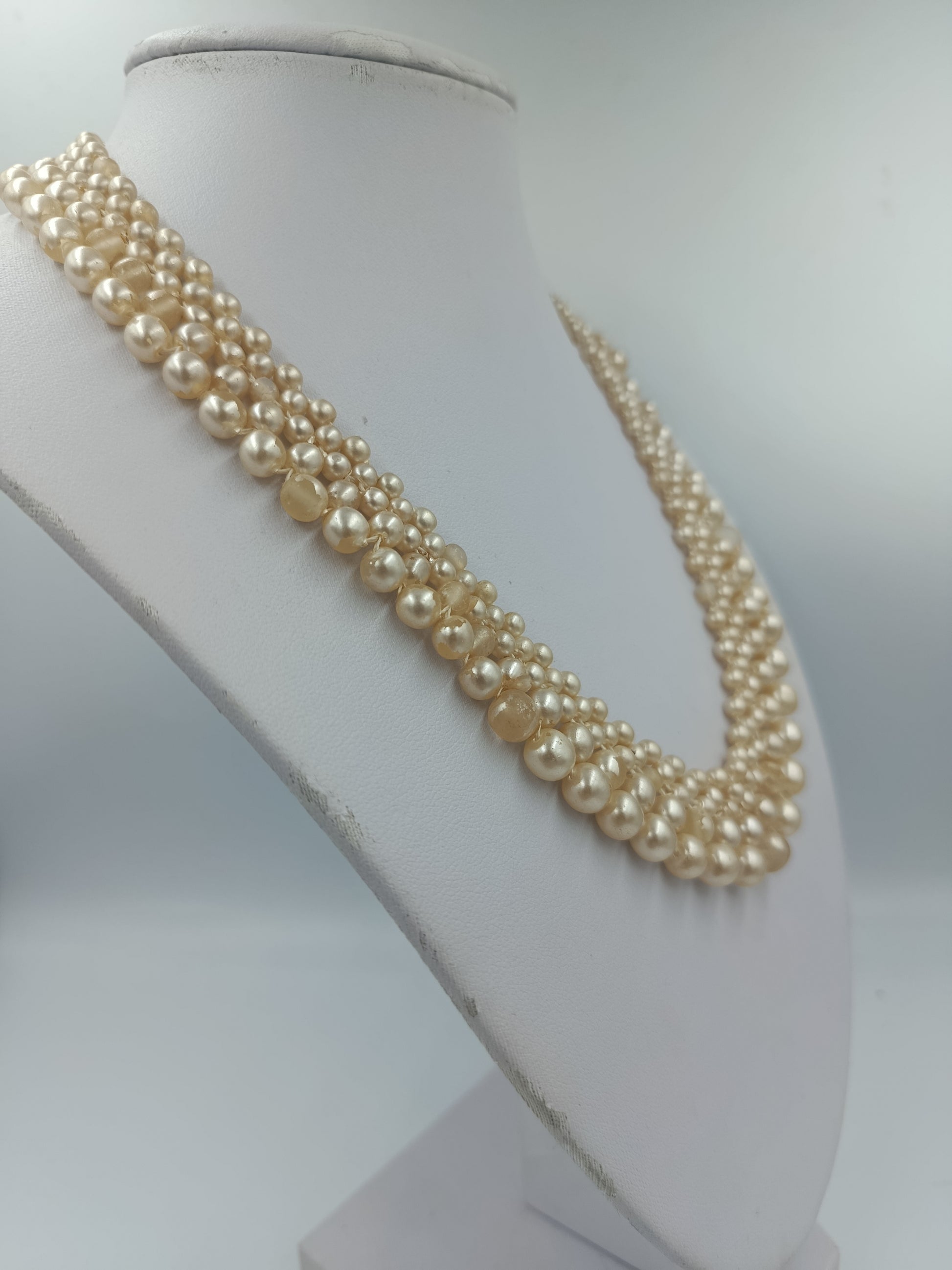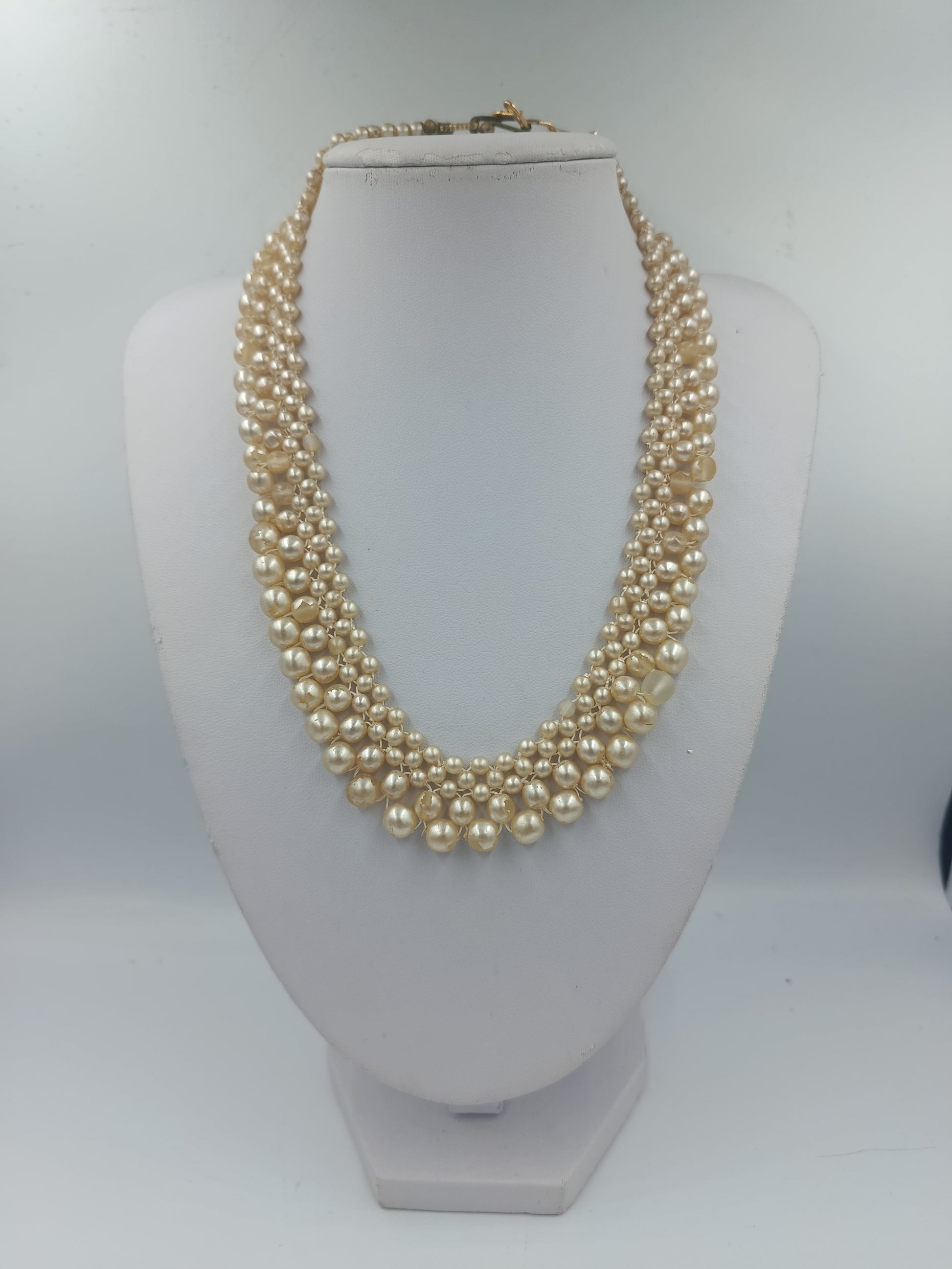 Elegante dreireihige Perlenkette in warmem Creme-Ton. Die unterschiedlich großen Perlen schaffen ein harmonisches, voluminöses Design, das jedem Outfit eine edle Note verleiht. Der dekorative goldfarbene Hakenverschluss rundet den klassischen Look perfekt ab – ideal für festliche Anlässe oder stilvolle Abendgarderobe.