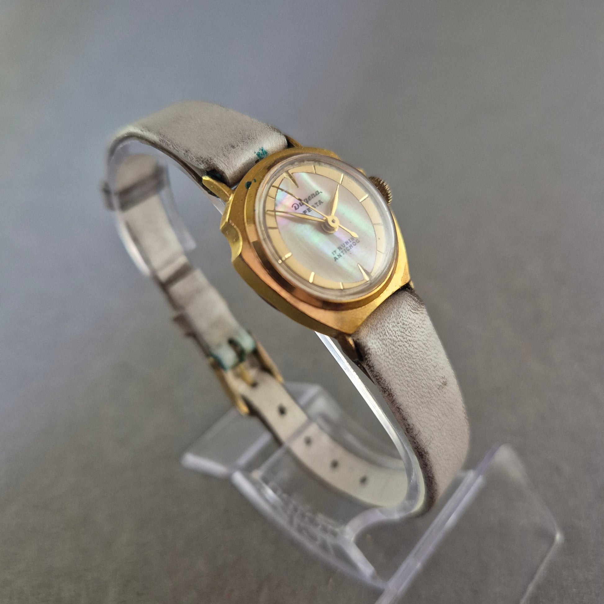 Diese Dugena Festa Damenarmbanduhr ist ein echtes Stück Zeitgeschichte. Ausgestattet mit einem mechanischen Werk und 17 Rubinen, bietet sie klassische Uhrmacherkunst in einem kompakten, femininen Format. Das vergoldete Gehäuse in Kombination mit dem weißen Zifferblatt und dem kleinen Format macht sie zum perfekten Accessoire für Vintage-Liebhaberinnen.